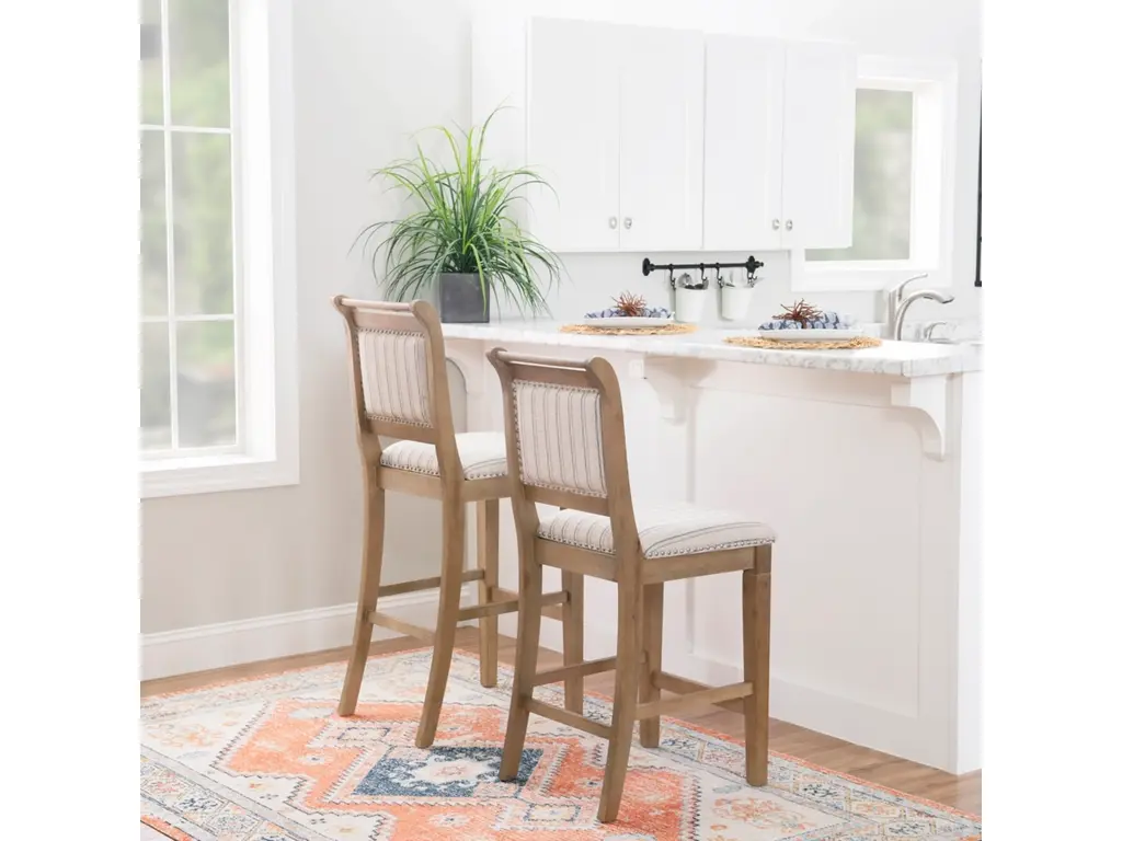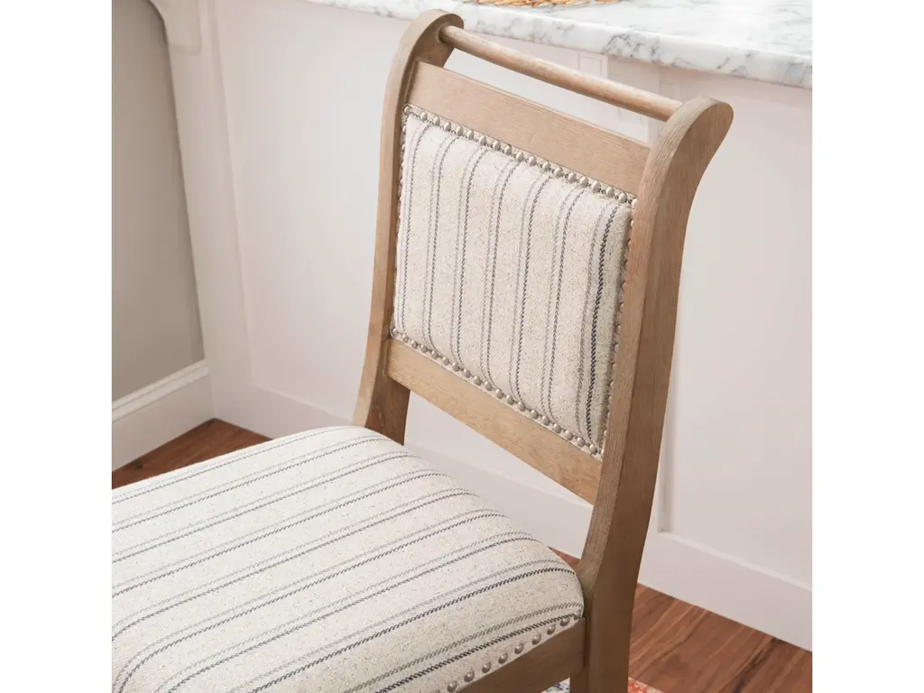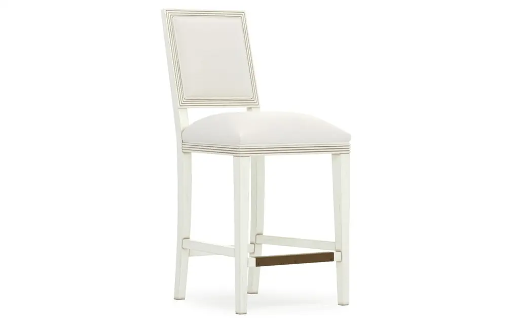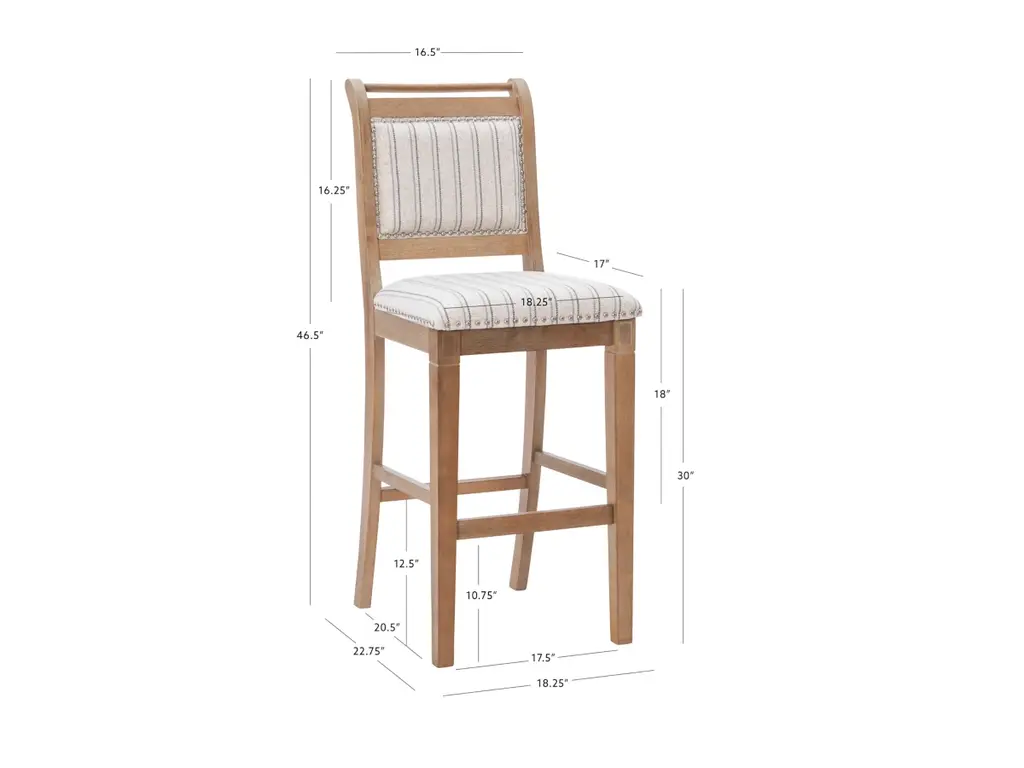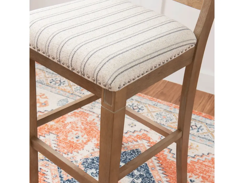 French style and farmhouse design combine to create this counter stool. The washed finished wood is perfectly accented by the solid natural fabric and brushed silver nail heads. Footrails provide stability and durability. Counter height.