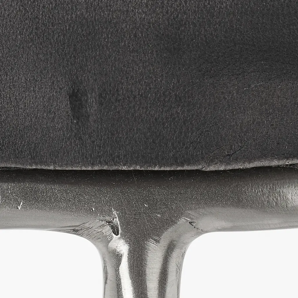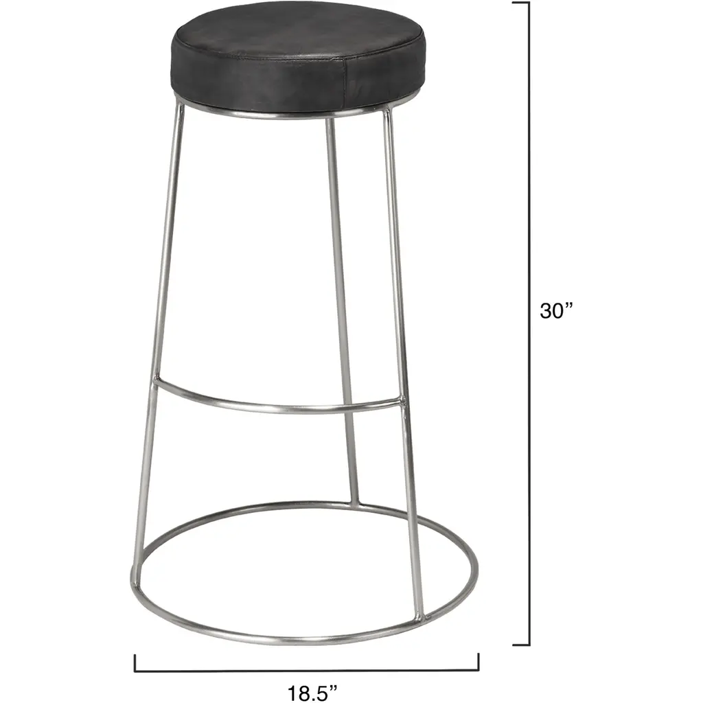 These unique stools are available in bar or counter height. Each features a comfortably padded round seat in top-quality matte charcoal leather that tops an asymmetrical tri-legged base in a modern metallic finish. The contrast between the sleek, slim pewter base and the substantial seat is elegant and unexpected, and results in the perfect perch for home bar or kitchen counter!