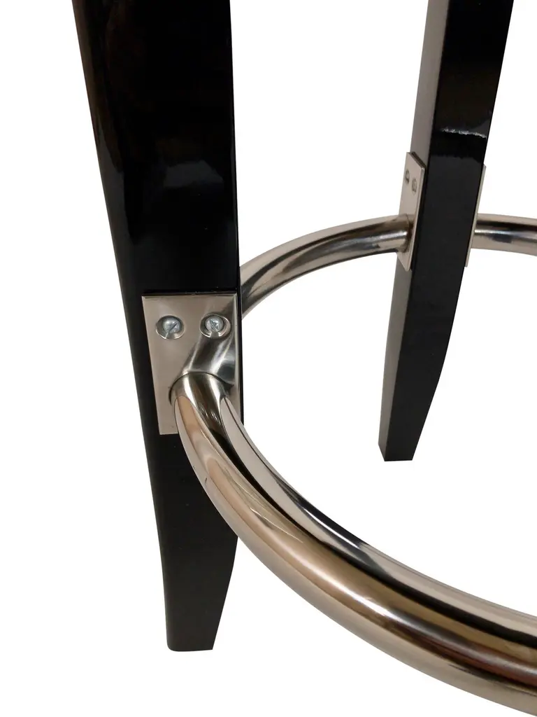 Enjoy a delicious drink in a noble Ambience.This bar stool invites you to linger.And who knows who will join you at your side.High quality! Handmade in Germany.Macassar, high gloss lacquered veneer. Black, high gloss piano lacquered wood. Chromed metal applications. Original leather (black) Measurements: Diameter 41 cm Height 81 cm. Other leather colors, woods, lacquer colors or surface finishes on request.