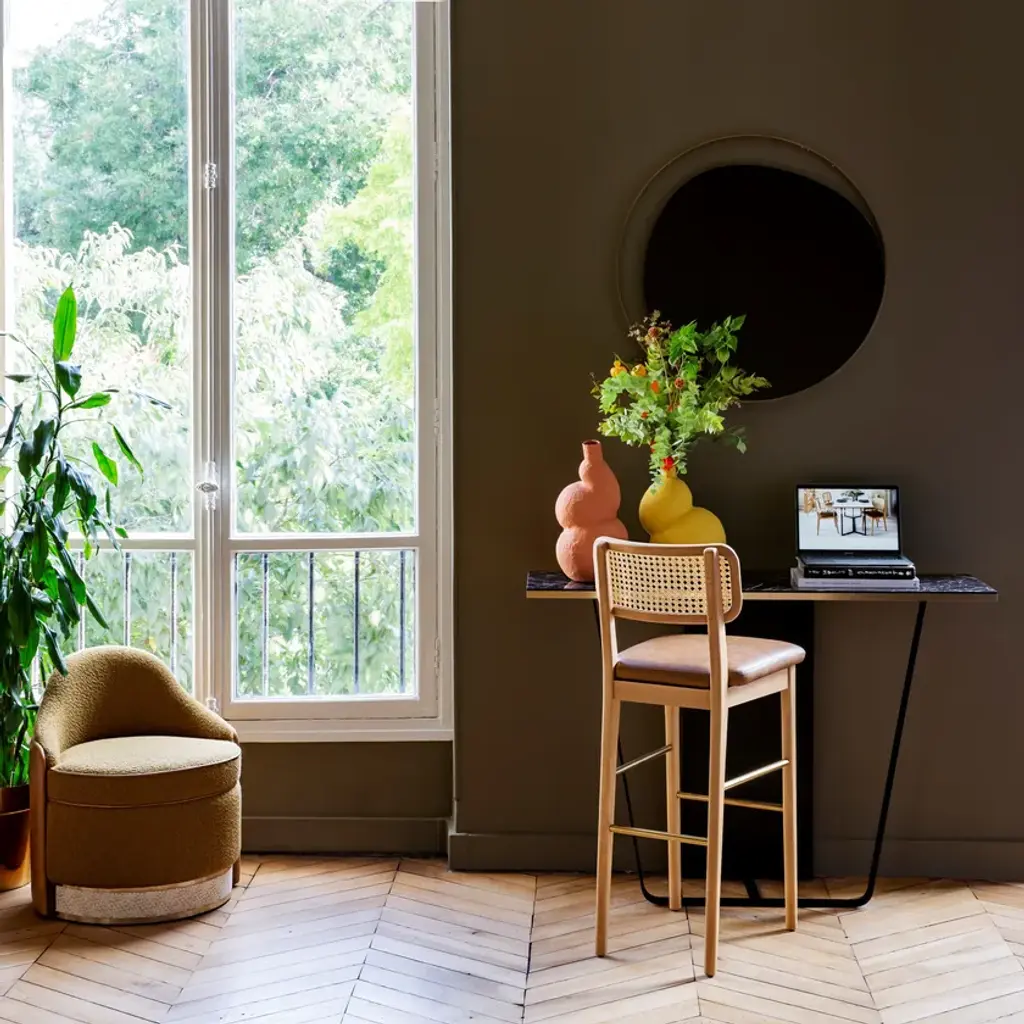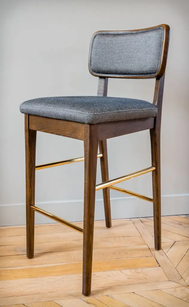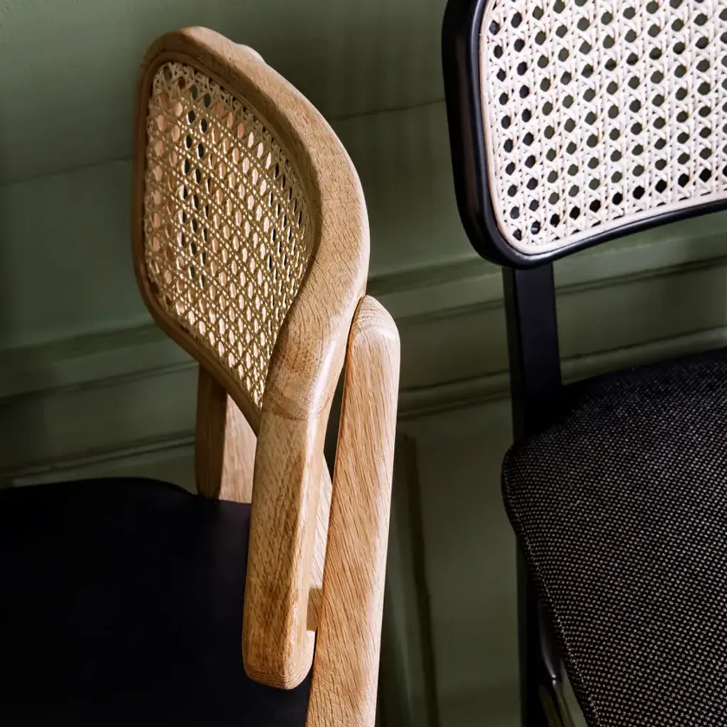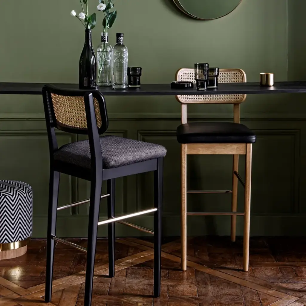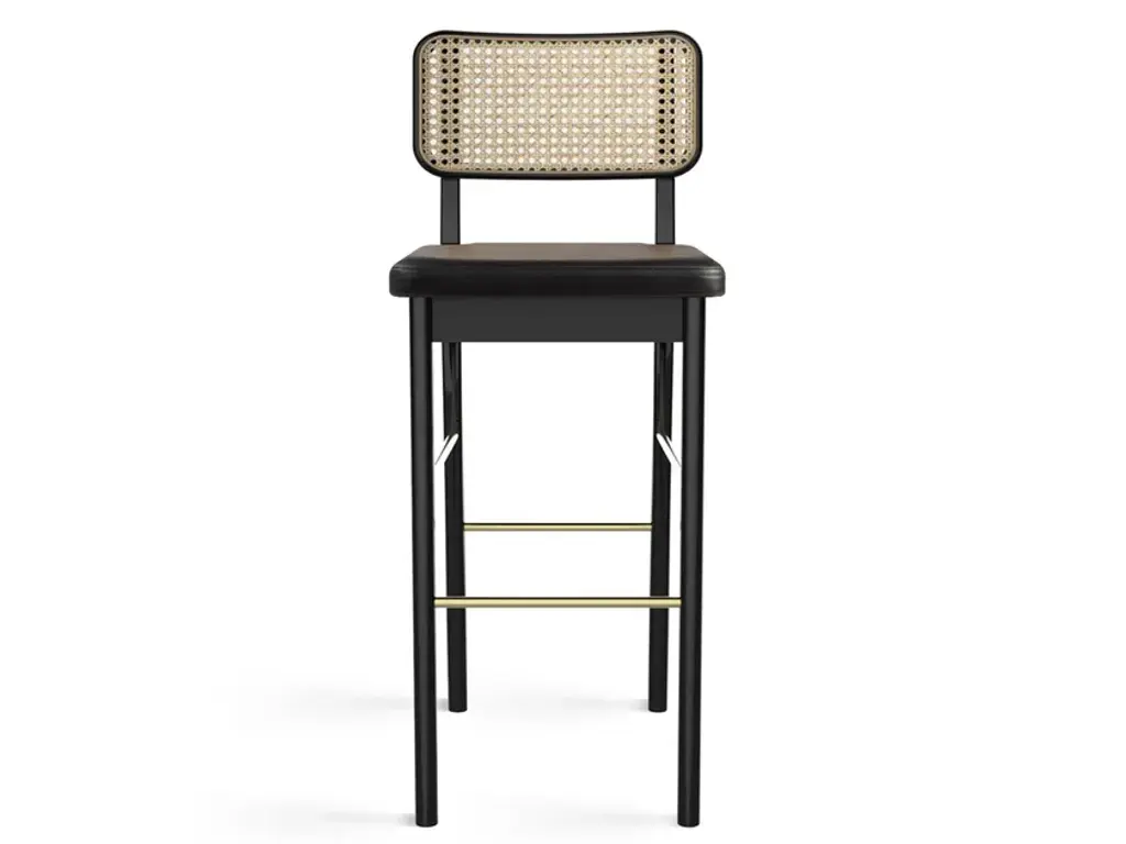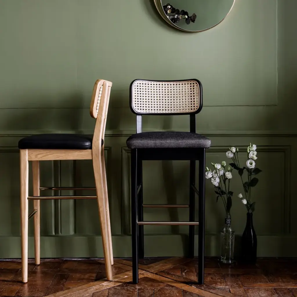 The bar stool joins our collection of wood and cane seating. Like its kin, the cane and solid wood are specially made by artisans of the highest caliber. The stool could be reupholstered with any fabric from our collection or customized to your liking. Available in black wood and light oak.MaterialsRed Edition is able to customize your piece even with the leather or fabric of your own choosing, a service limited to a minimum of 6 pieces.Available in black wood and light oak
