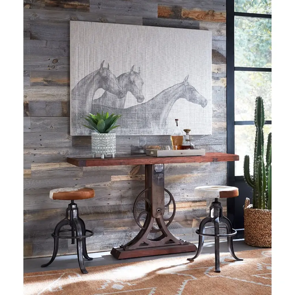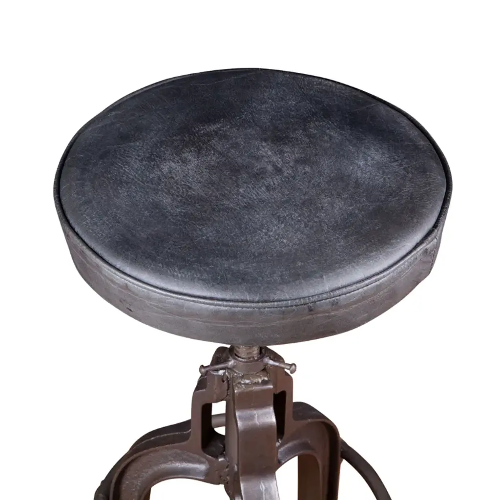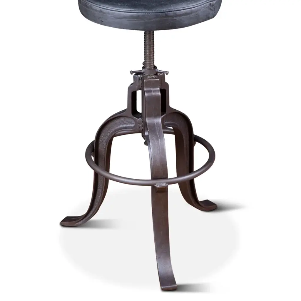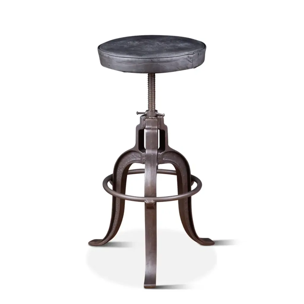 This delightful industrial-look barstool revolves and adjusts to the desired height, making it an ideal seat for all sizes and tables. With a recycled wood seat, its three-legged post design ensures stability and iron triangle base serves as a convenient foot-rest. Crafted entirely from iron and recycled wood solids.