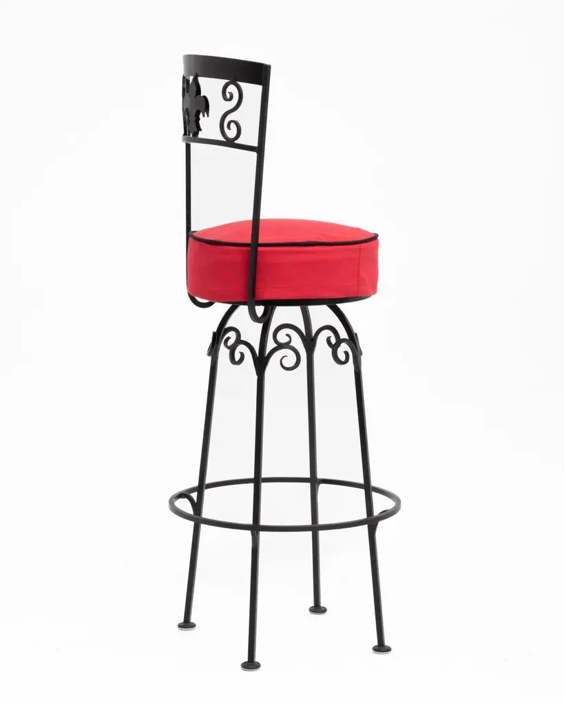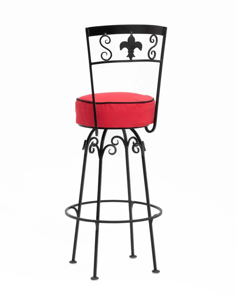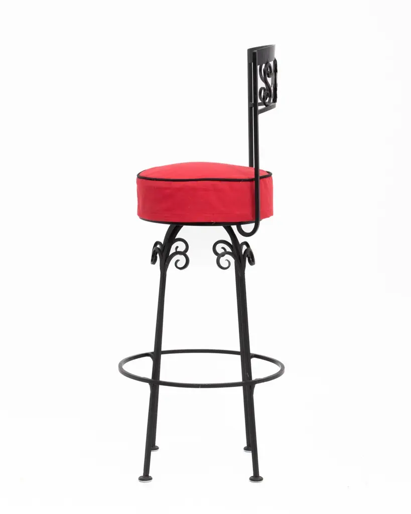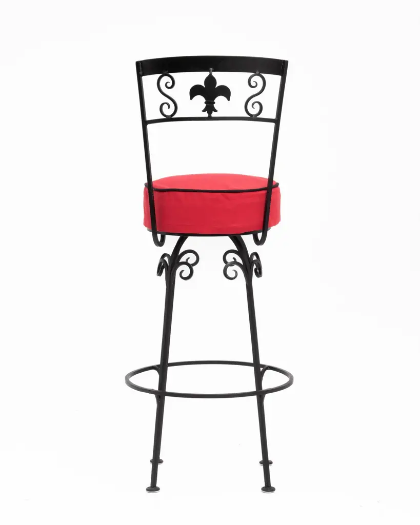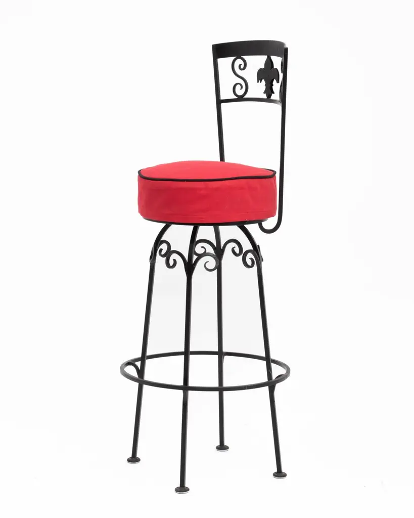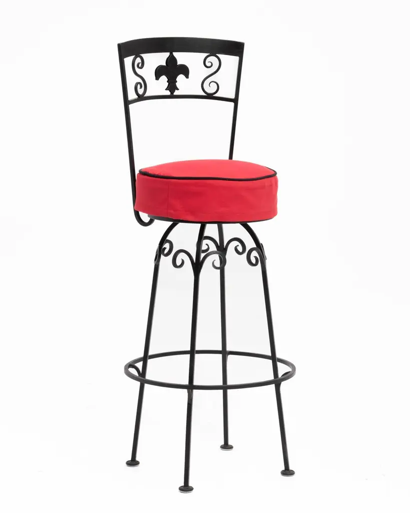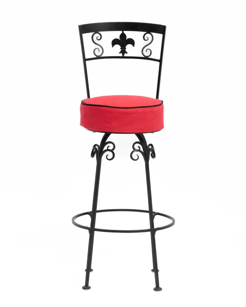 A stylish set of four wrought iron barstools with flour-de-lis decoration. Custom made in America for a New York City Restaurant in the 1960s. The red fabric on the seats are slipcovers.We have eight of these barstools, two sets of four...
