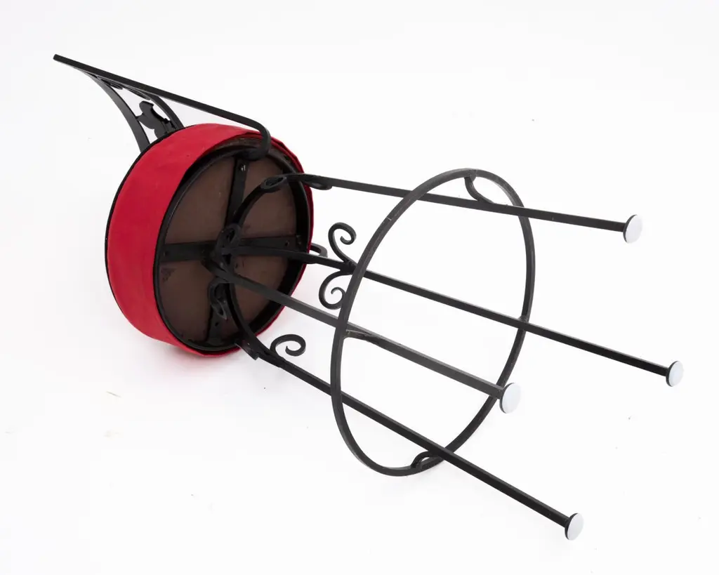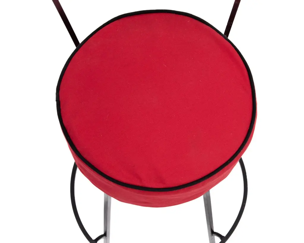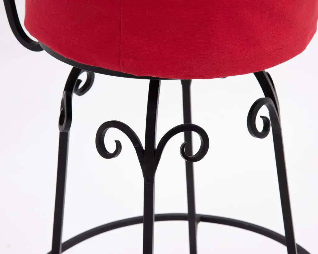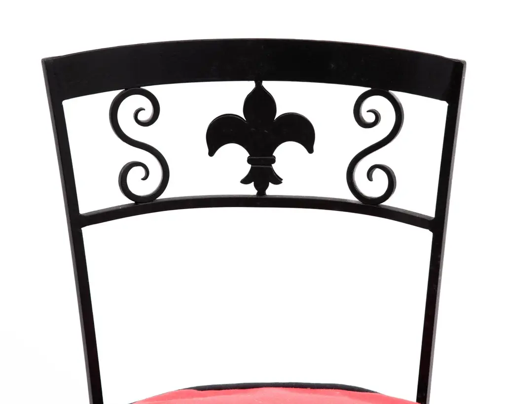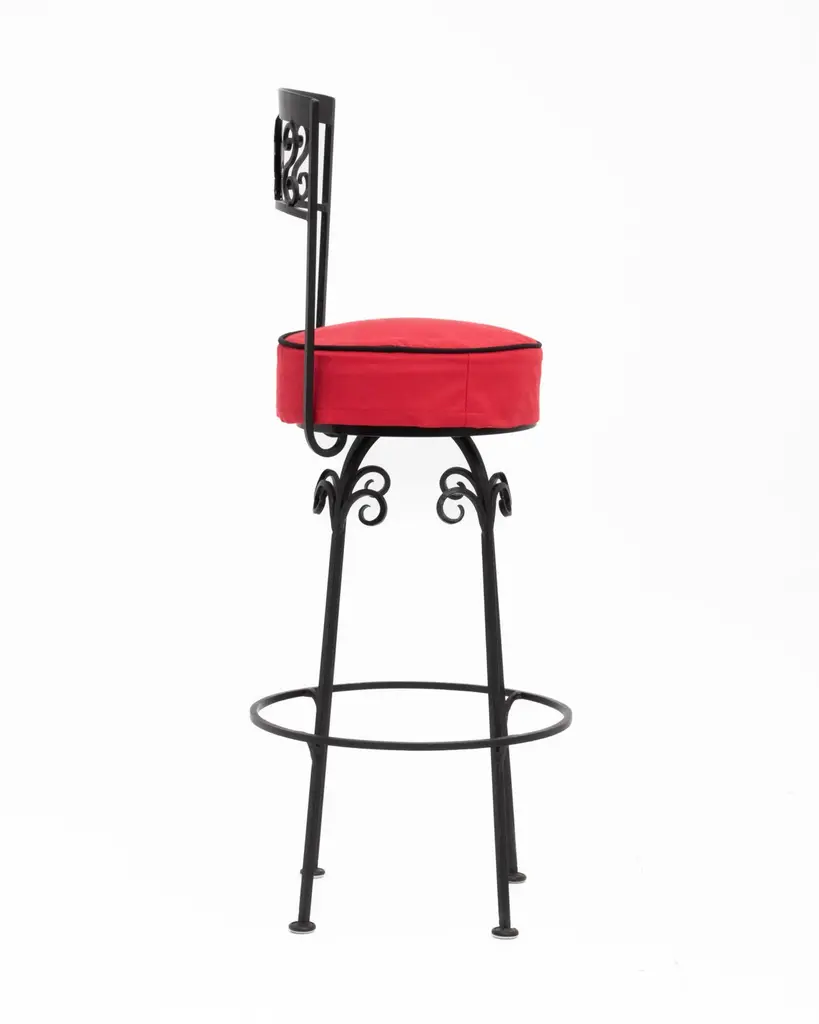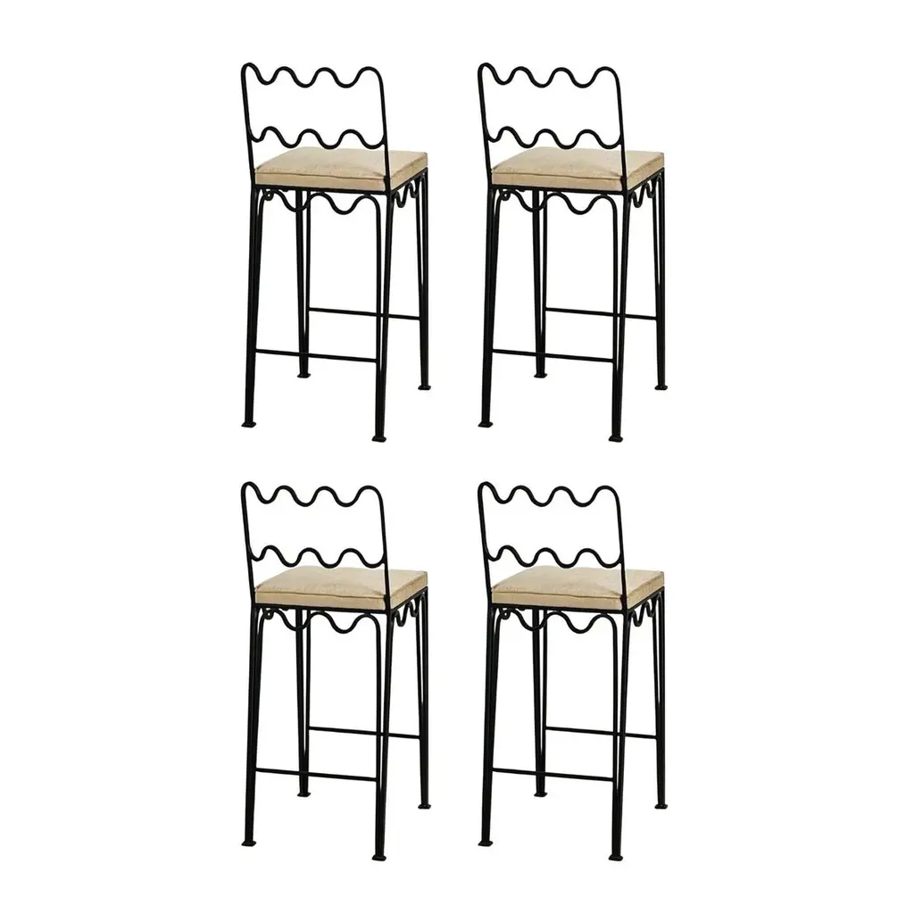 A stylish set of four wrought iron barstools with flour-de-lis decoration. Custom made in America for a New York City Restaurant in the 1960s. The red fabric on the seats are slipcovers.We have eight of these barstools, two sets of four...