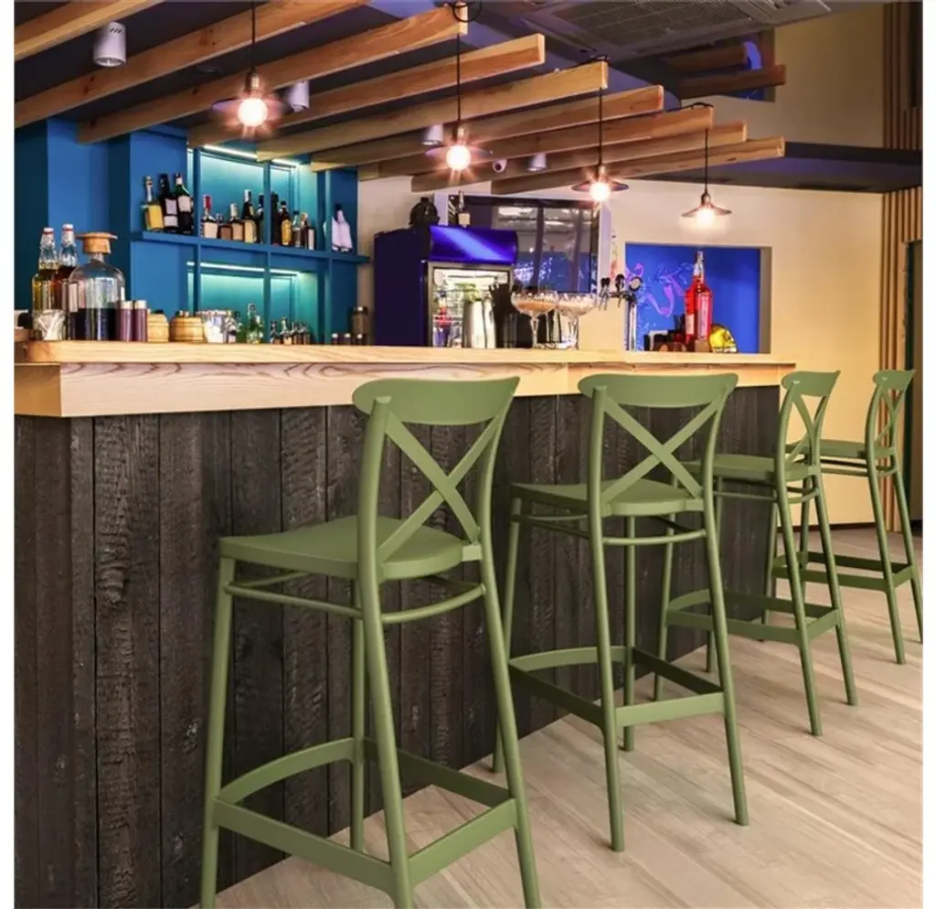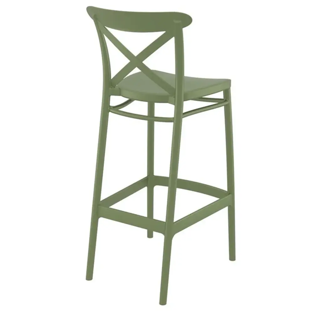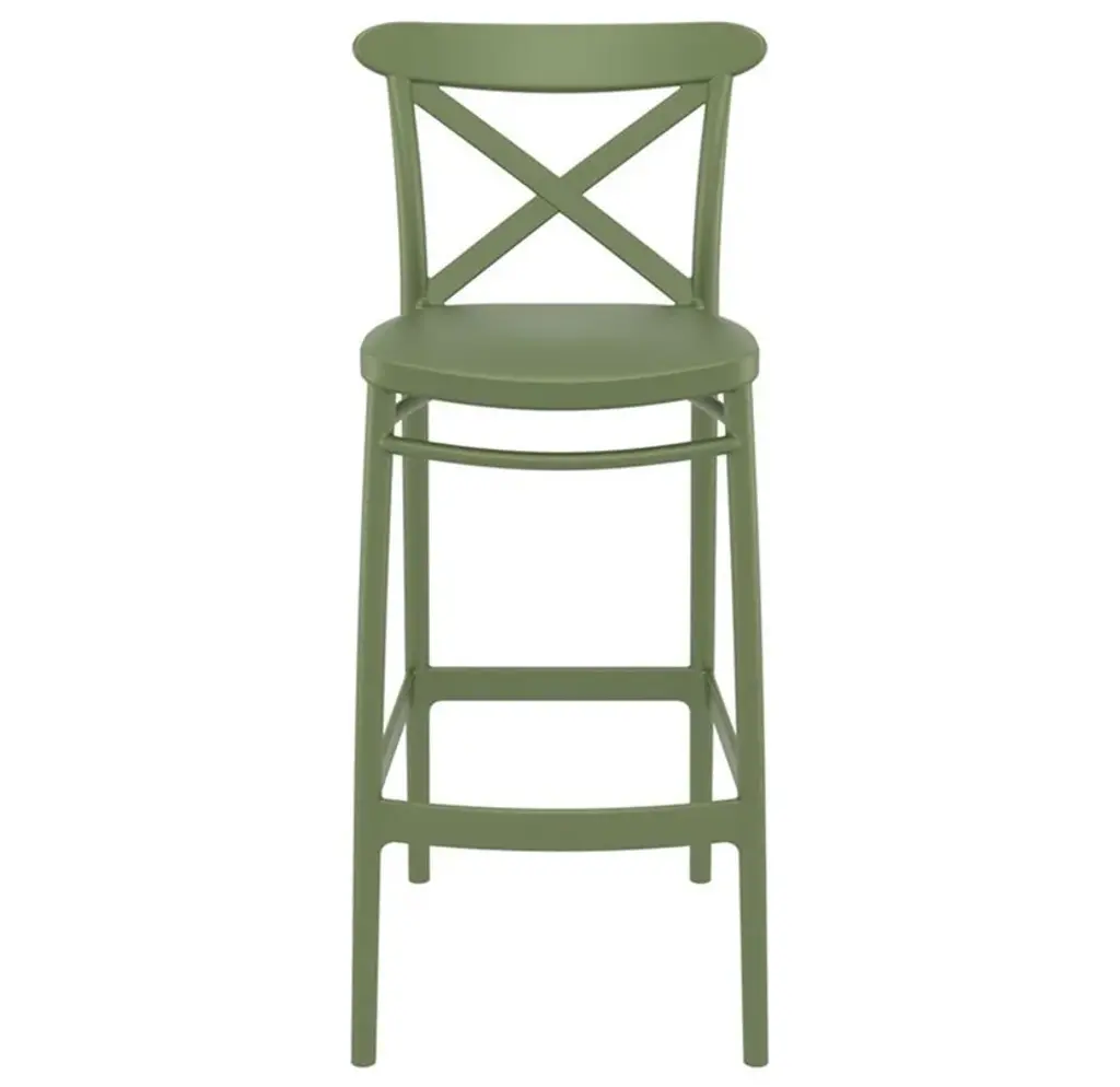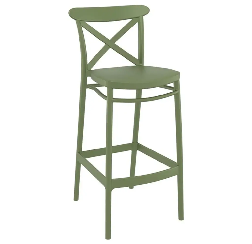 Included Items:Indoor Outdoor Bar Stool Olive Green x 2For quicker processing, your order could be split into separate packages.Indoor Outdoor Bar Stool Olive GreenThe Outdoor Bar Height Chair features a classic design that is comfortable, and functional. Made from commercial grade polypropylene resin with gas injection molded legs. Suitable for indoors and outdoors. Perfect for heavy use areas. Often used in restaurants, cafes and hotels. Resistant to UV, salt, weather, sun tanning oils.Features:Made from commercial grade resin polypropylene.Extremely durable for outdoor temperatures and conditions.Beautiful U.V. Resistant, Soft Pastel Finish. Easy to keep clean.Perfect for heavy use in any indoor or outdoor areas.Great for balcony or pool side use.The Bar Chair is not stackable.Specifications:Seat Height: 29.5"