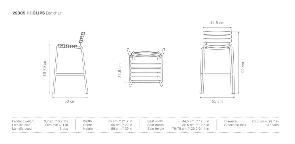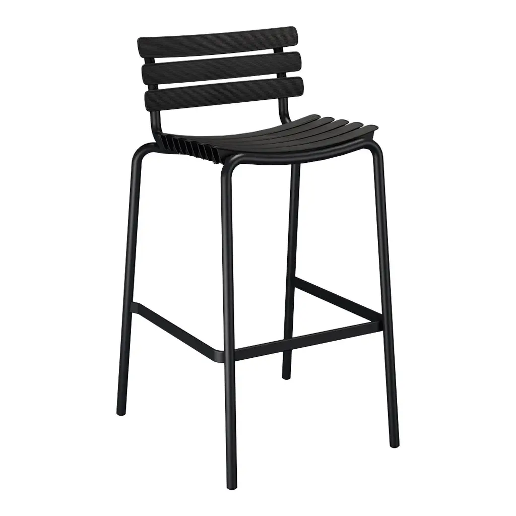 The RECLIPS Bar Stool is the perfect addition to your outdoor living space. Constructed of plastic lamellas, it is airy and comfortable.