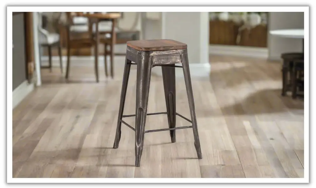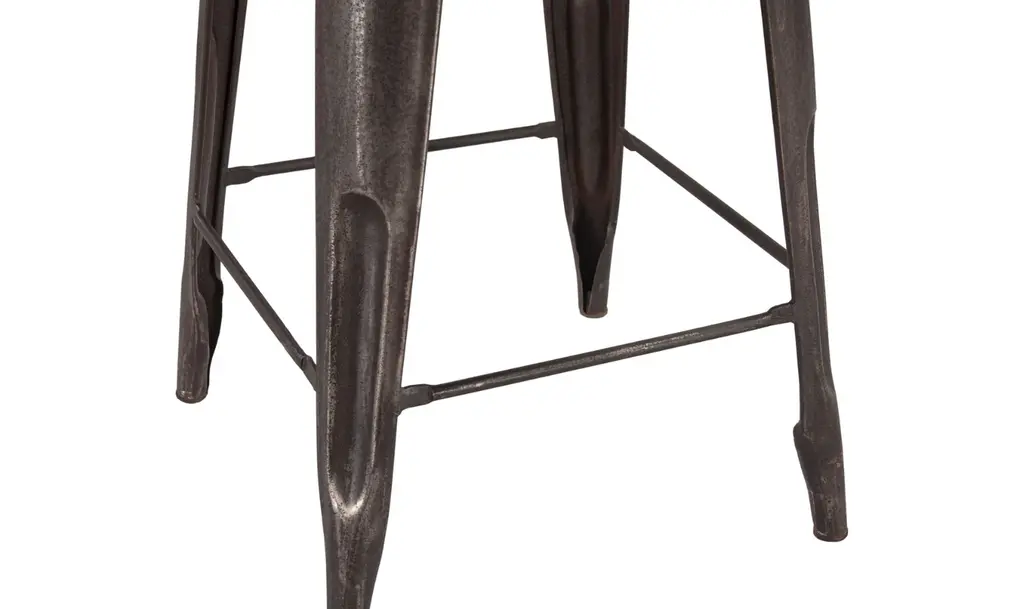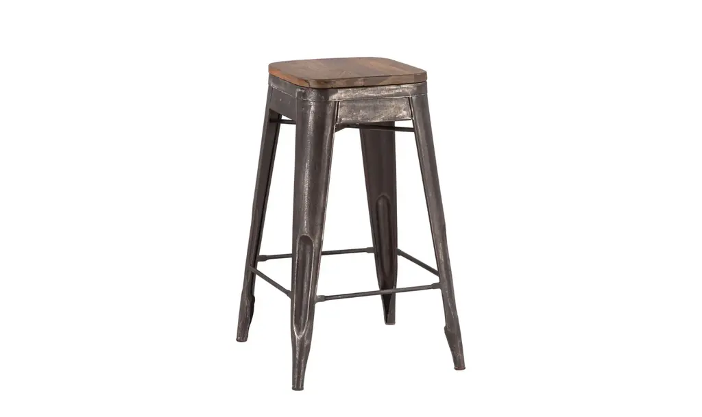 The HTD Eiffel Iron Barstool With Wooden Top brings together the sturdy industrial look of iron with the warmth of reclaimed teakwood. Its durable iron base is designed for both function and style, offering a strong foundation that fits seamlessly into a modern, industrial, or rustic space. The reclaimed teak top, which is 12 inches in diameter, adds a natural touch that balances the metal frame, making this barstool an attractive and versatile addition to kitchen counters, bar areas, or high dining spaces. With a minimalist design, the Eiffel Barstool offers practical seating while maintaining a refined aesthetic. The materials are chosen for longevity, ensuring the barstool retains its charm through years of use. The iron legs provide stability, and the integrated footrests add comfort, making it perfect for extended seating. Whether placed in a casual or contemporary setting, this piece blends industrial influences with organic materials for a balanced look.