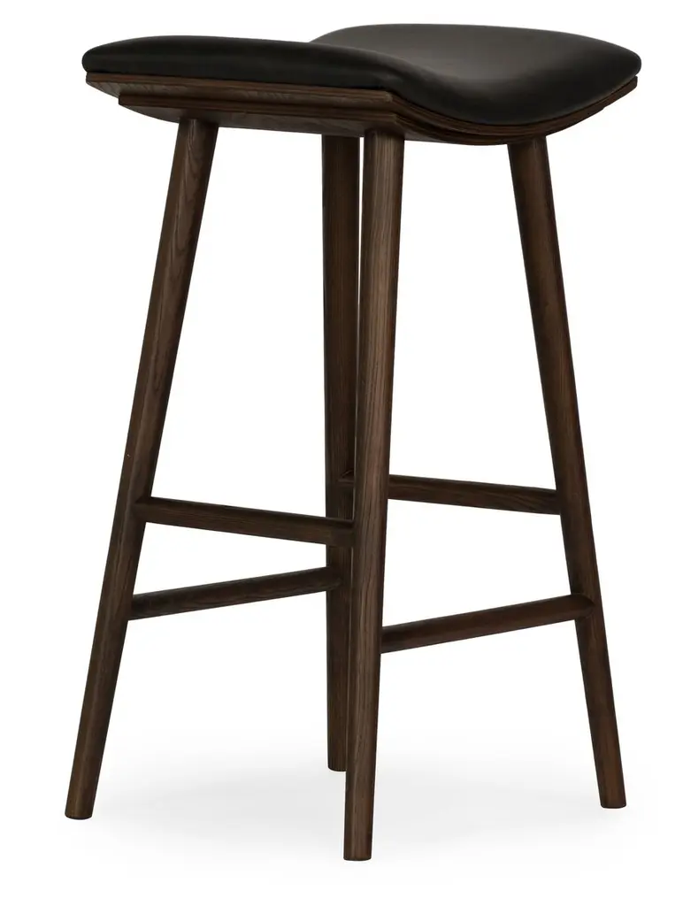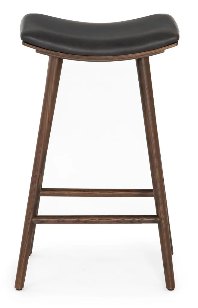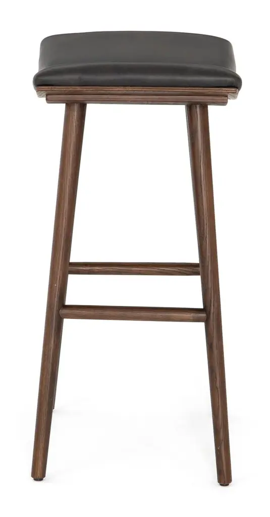 Slim styling meets color contrast for effortless impact. Warm ash framing supports a saddle-style seat of distressed black faux leather.