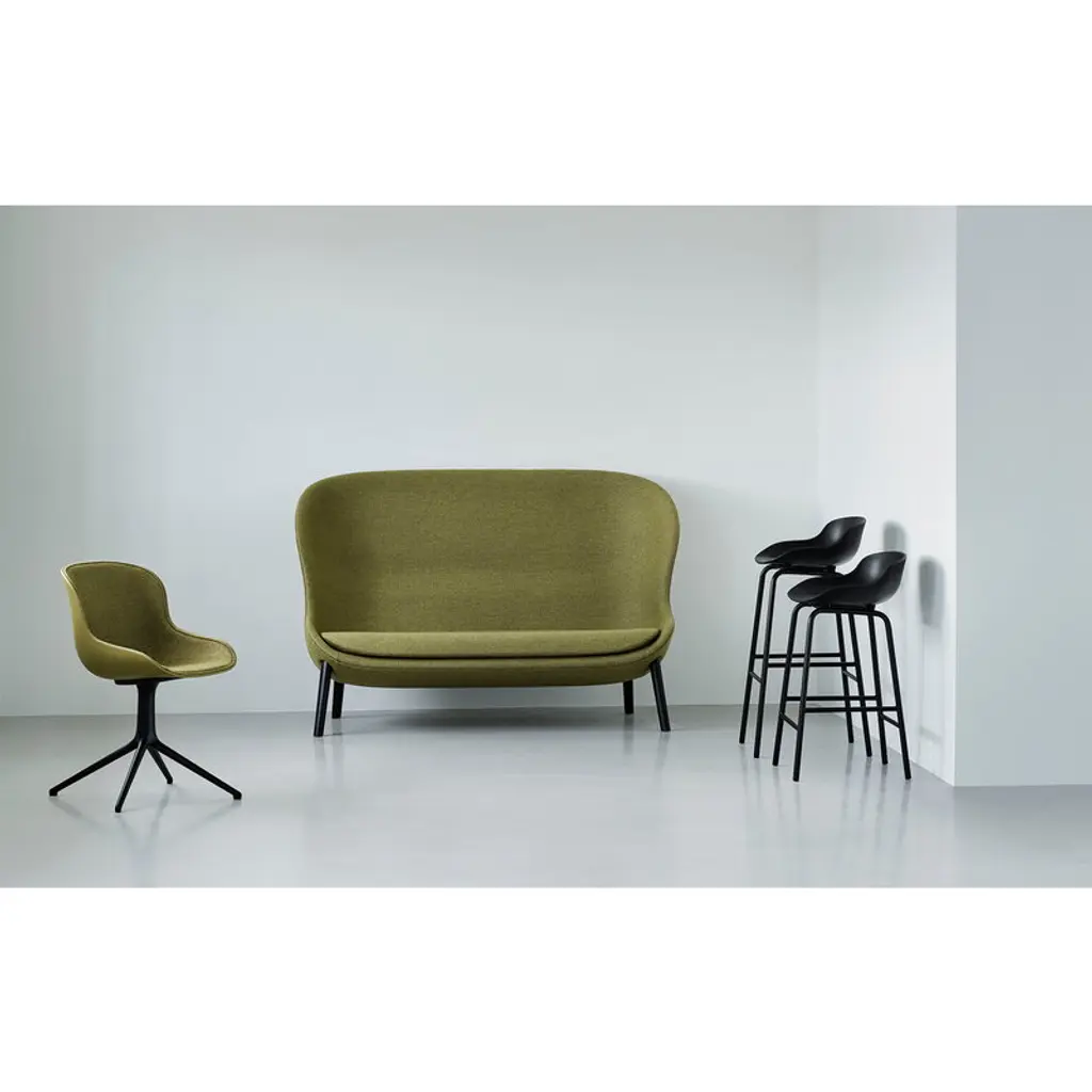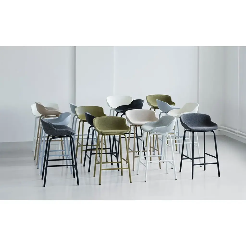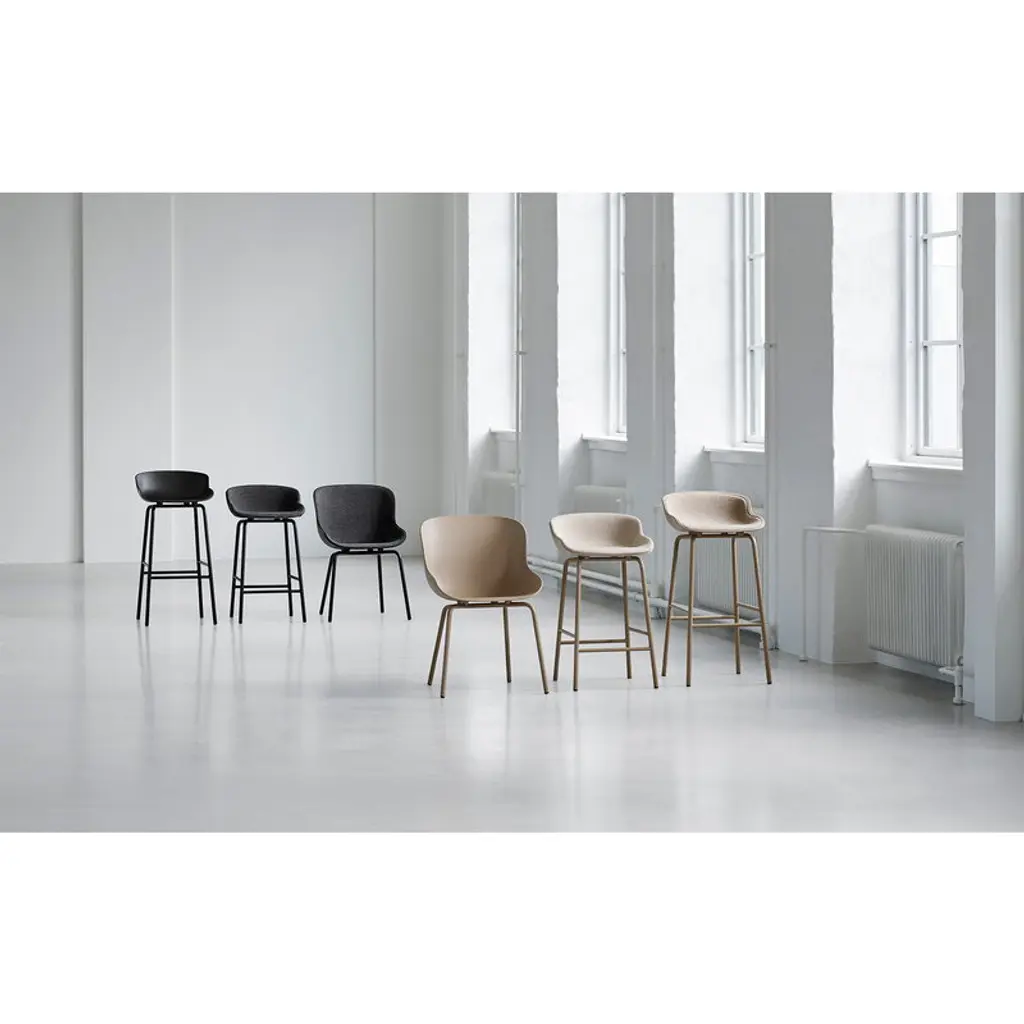 The Hyg bar chair, with its voluminous silhouette and soft, curvy lines, exudes warmth and comfort – it invites you to have a seat and take a moment for yourself. The inspiration behind the cozy Hyg collection is the word “hygge”: in the spirit of perhaps the most well-known word of the Danish language, designer Simon Legald wanted to create a place for relaxation with a sense of security. The Hyg chair is like a safe haven, a nest where you can feel comfortable, be it in your own dining room, an office setting or even a busy restaurant. Simon Legald has said about the Hygge collection: “The moments where we sit down together, immerse ourselves in conversation and share a meal – for me, this is where the feeling of hygge really peaks. Thus, it seemed only natural that the Hyg range should also provide the setting for moments like these. The feeling of hygge is not only linked to the visual experience of the design; it lies in the overall sensuous experience. A lot of effort has gone into sculpting the shape to provide rest and support for the human body, to make it comfortable to sit in, basically.”