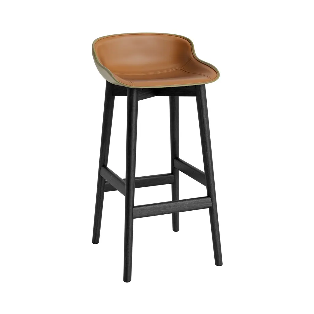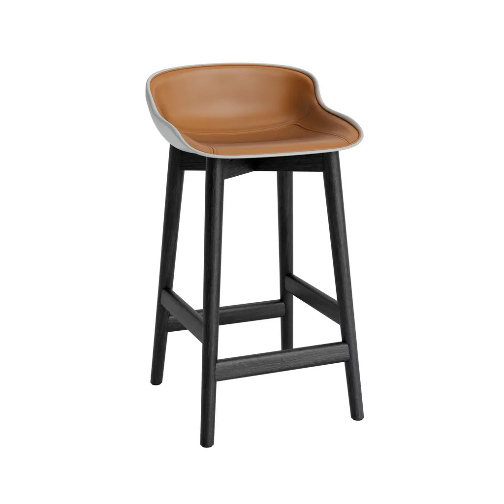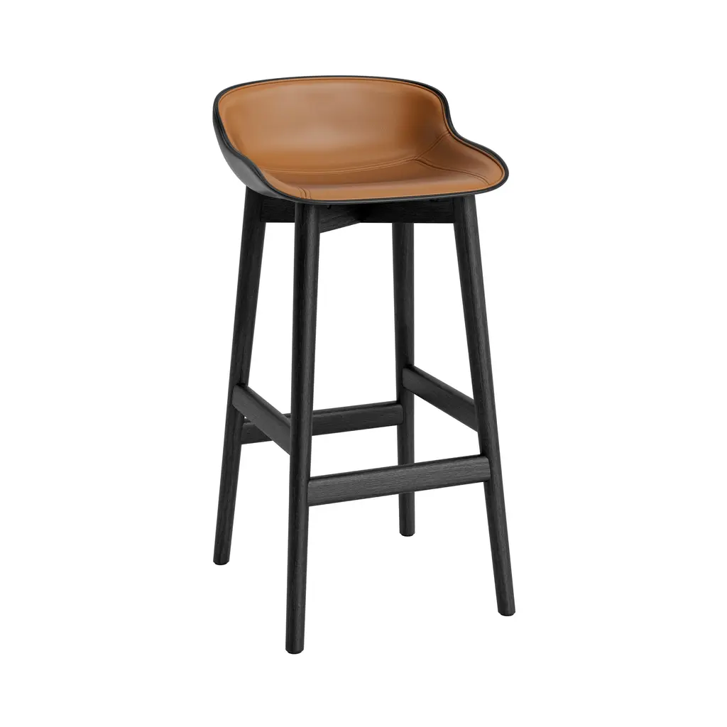 Hyg adds bar seating that combines the sculptural look of its molded shell with an upholstered, cushioned interior for a custom touch. Playing on hygge, the Danish ideal of contentment, it extends designer Simon Legald's sculptural seating in a version front-clad in a choice of select fabric or leather options. The solid-oak base has a built-in footrest and comes in either natural or black-painted finishes with a lacquer coat.
