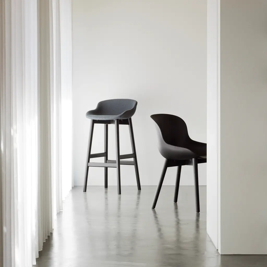 Hyg alludes to the Danish notion of contentment and the collection's fully upholstered Bar Stool adds a custom twist to the equation. Designer Simon Legald's sculptural contours and comfortable proportions are clad in fine fabric or leather for a completely personalized look. Providing a complementary organic element, the solid-oak base has a built-in footrest and comes in either natural or black-painted versions. both with a lacquer finish.