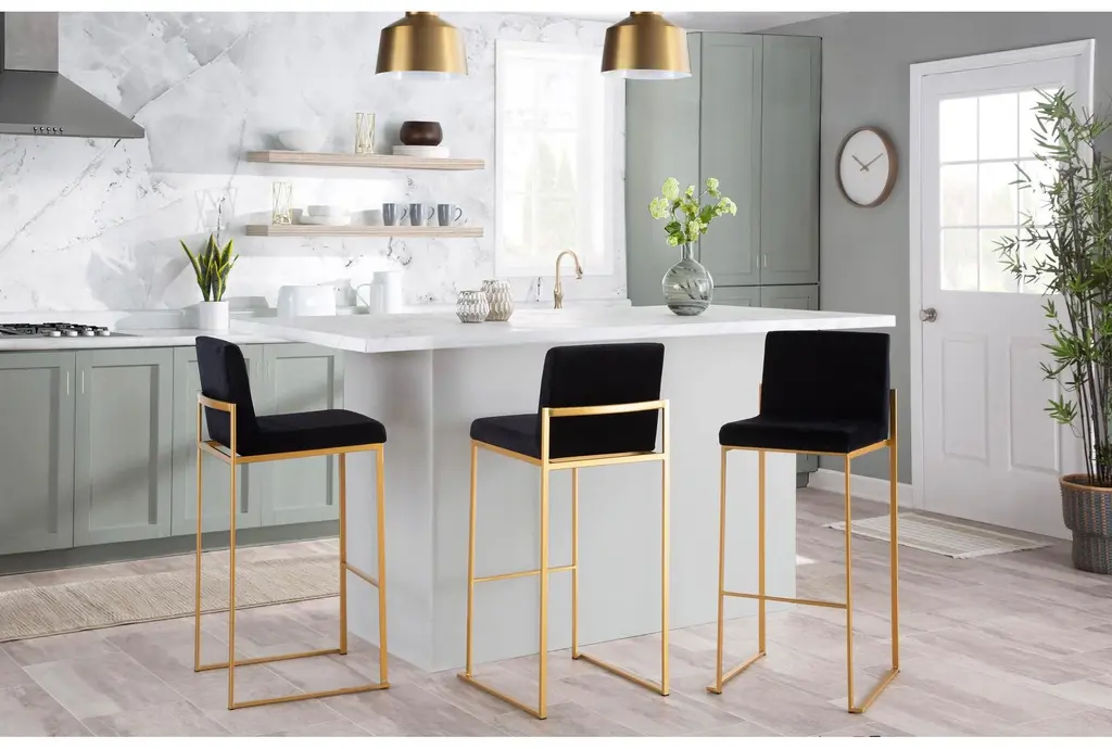 Upgrade your dining and kitchen areas with the Ian Black 30" Velvet Fabric + Gold Metal Frame High Back Barstool Set Of 3. These modern armless barstools offer a stylish and comfortable seating solution for any food prep or serving space. With a sleek design and luxurious velvet fabric, these barstools are perfect for adding a touch of sophistication to your home.