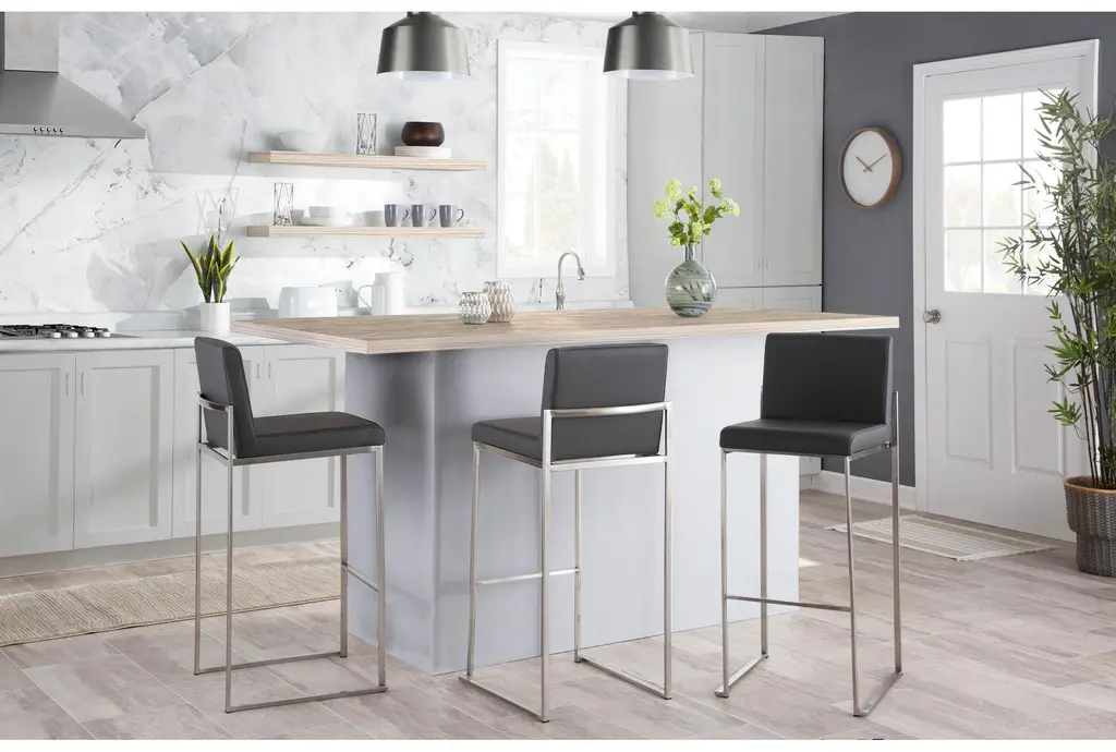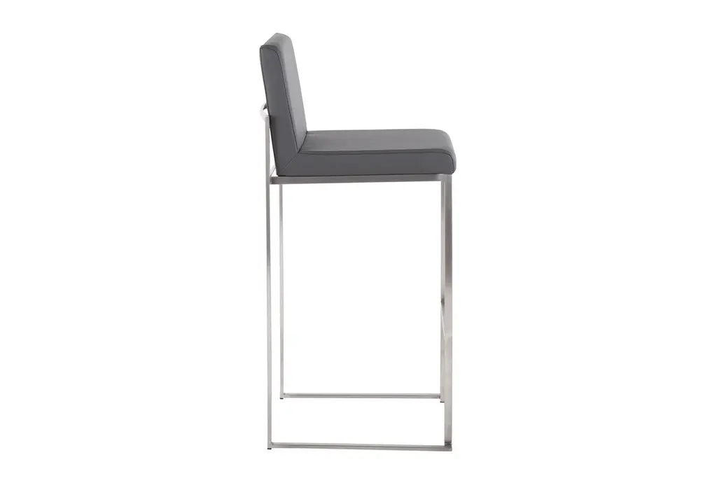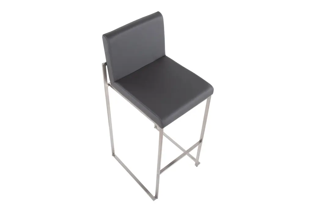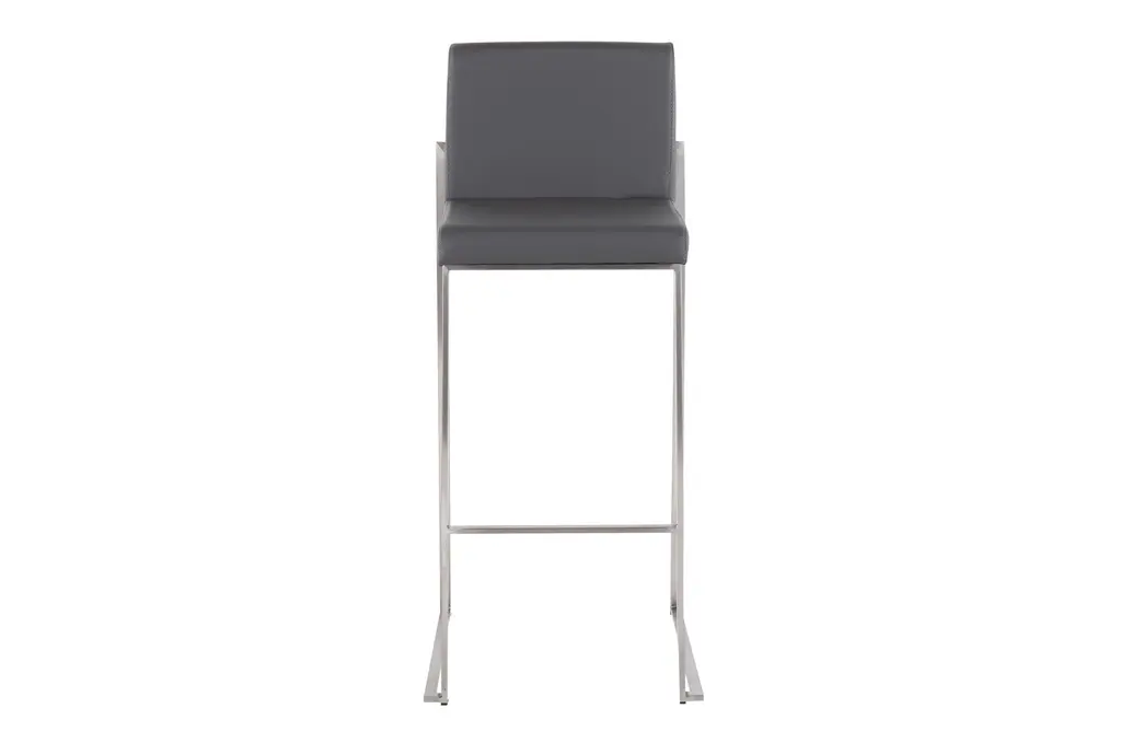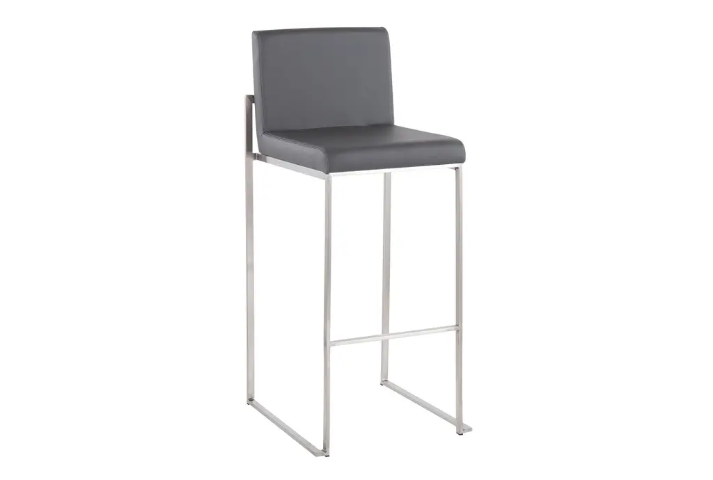 Enhance your dining or kitchen area with the Ian Grey 30" Faux Leather Metal Stainless Steel Frame High Back Barstool Set of 3. These modern barstools feature a sleek armless design, perfect for contemporary spaces. The grey faux leather upholstery and stainless steel frame offer both style and durability.