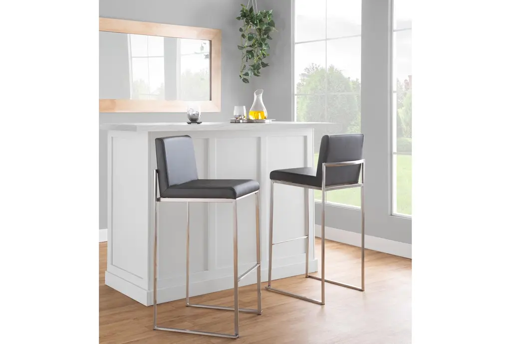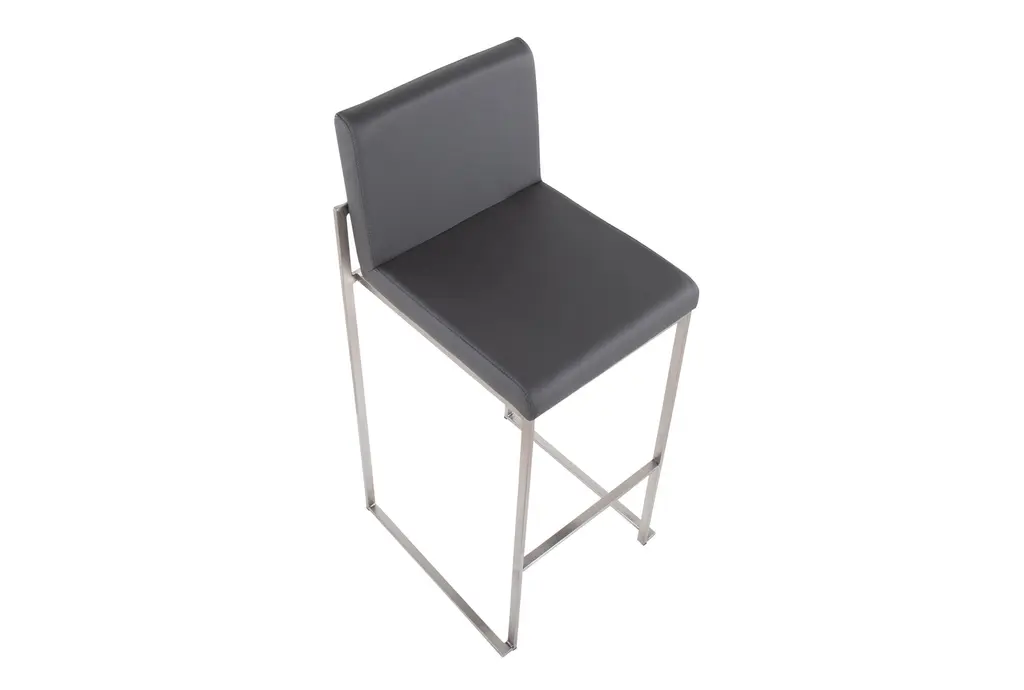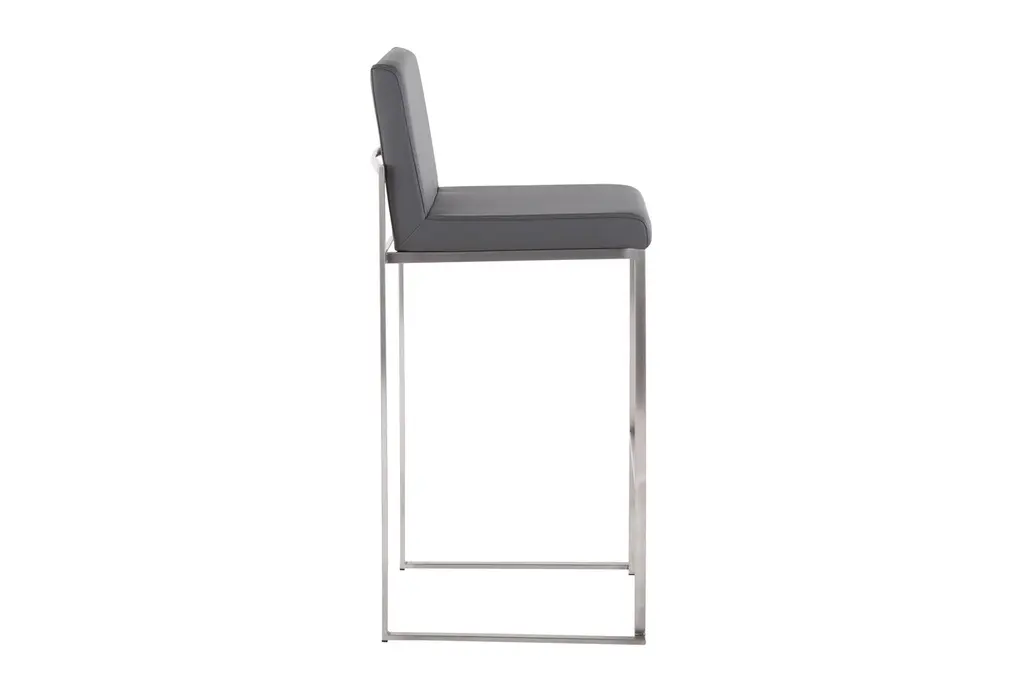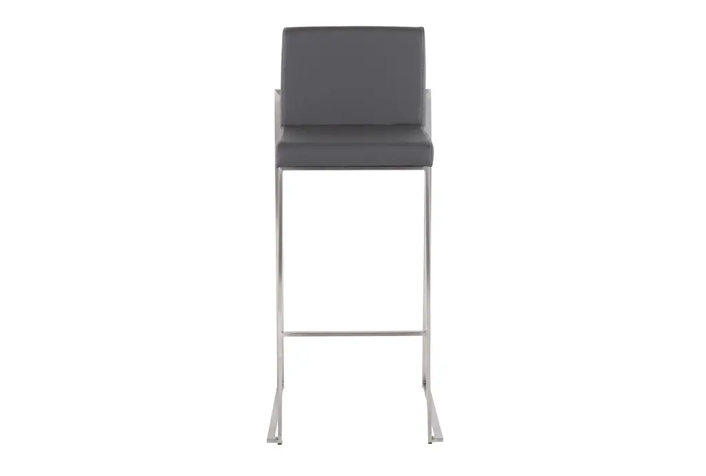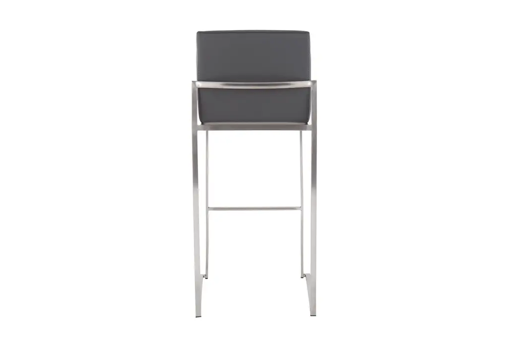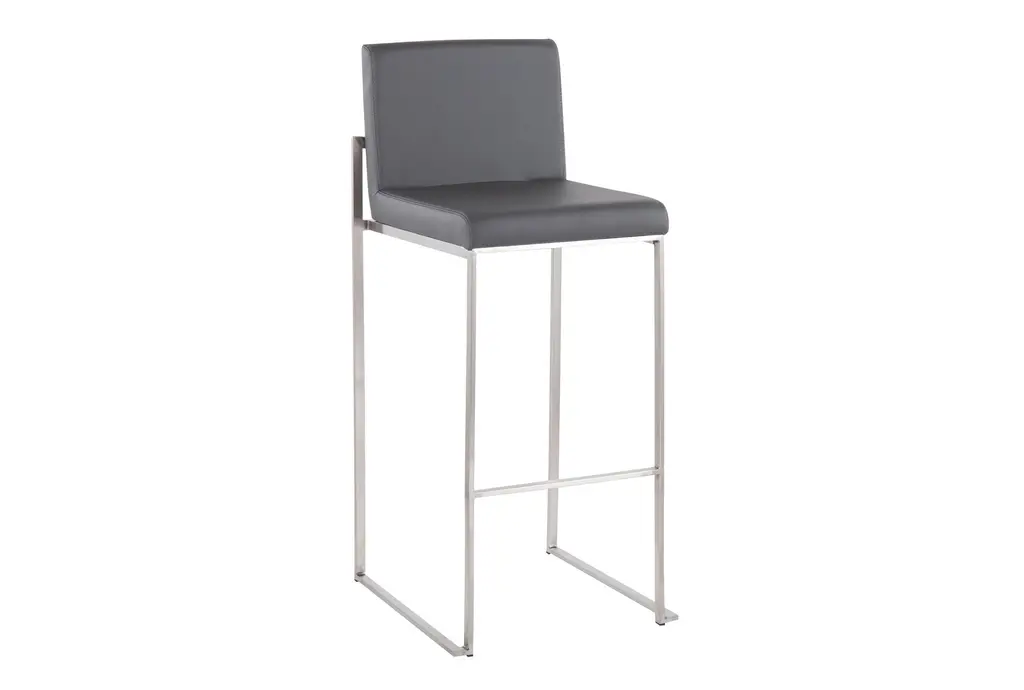 The Ian High Back 31" Barstool in Stainless Steel and Grey Contract Grade Faux Leather offers a contemporary touch to any dining room or kitchen. This set of 2 armless barstools features a durable faux leather seat and sleek stainless steel frame, making it a stylish and practical addition to your space.