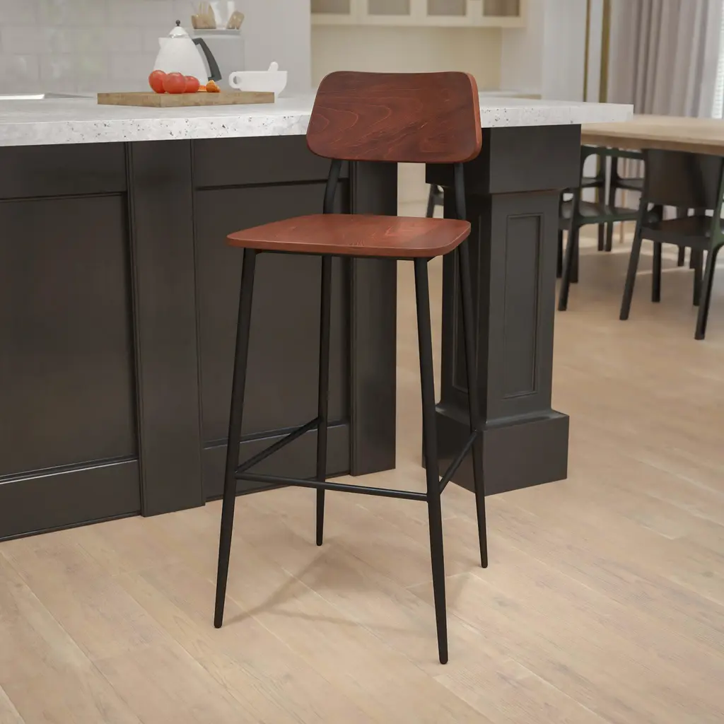 When furnishing your establishment you need seating that can change with your decor and you won't be disappointed with this richly hued industrial bar stool. The mixed media design blends seamlessly giving this metal bar stool an up to date appearance that will go from modern industrial to rustic farmhouse and just about everything in between. This solid restaurant dining barstool boasts an easy to clean finish, which is an important aspect when it comes to a business. Although designed to withstand the daily rigors in the hospitality industry, this versatile stool will also provide a warm and inviting quality to your home. Use this commercial grade barstool around the pub height table in your restaurant, your kitchen island or anywhere you want chic, on-trend seating. The durable steel frame is stabilized with a support bar that includes a footrest that promotes good posture and relieves pressure from the legs. This wooden stool arrives fully assembled for quick and easy setup. Plastic floor glides help protect your floors and ensure smooth gliding. The simple style of this rustic barstool will highlight any space in your home or business.