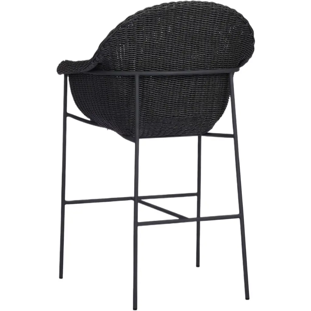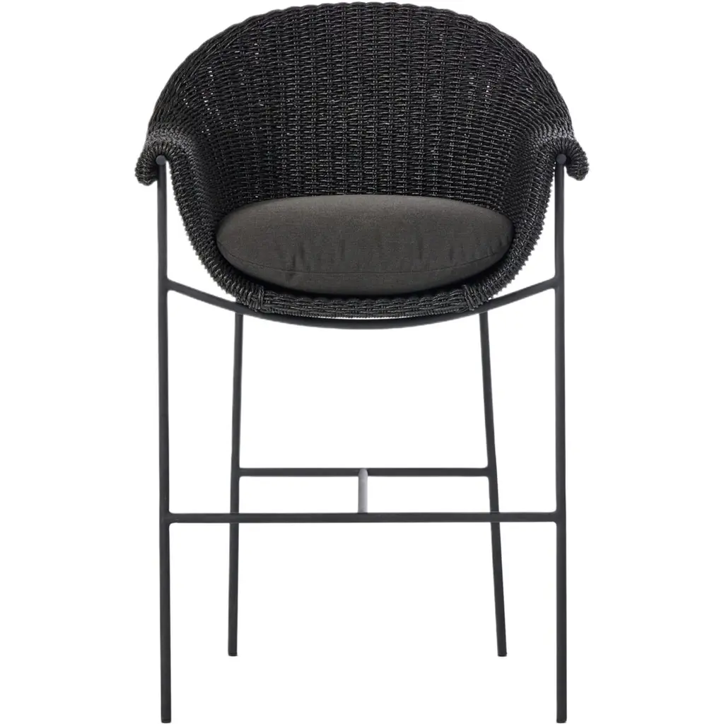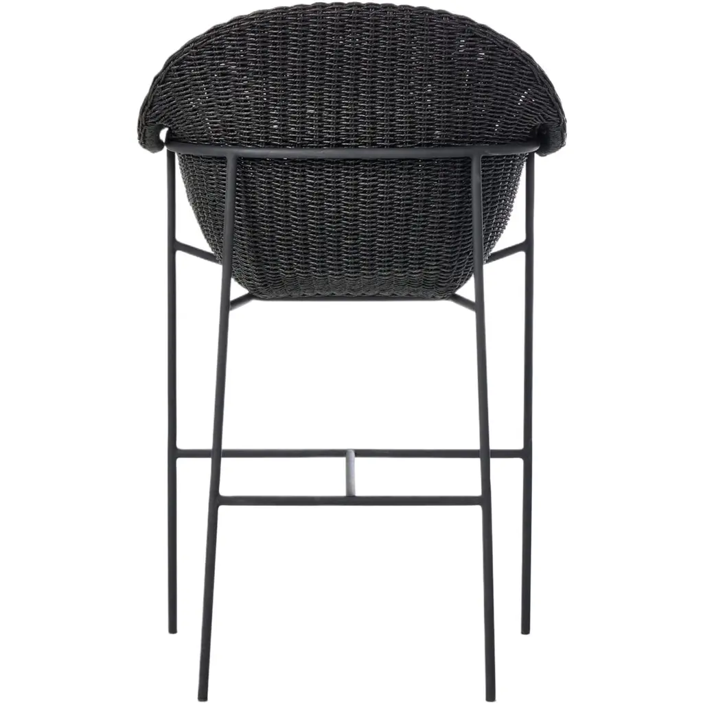 With a curvy silhouette and classic rolled arms, this outdoor bar stool features a woven frame that brings modern sensibility to a vintage-inspired design. An airy iron cradle base provides a beautiful balance of scale, complemented by a fully upholstered cushion for a comfortable sit. Ideal for outdoor settings, this bar stool should be covered or stored indoors during inclement weather and when not in use.