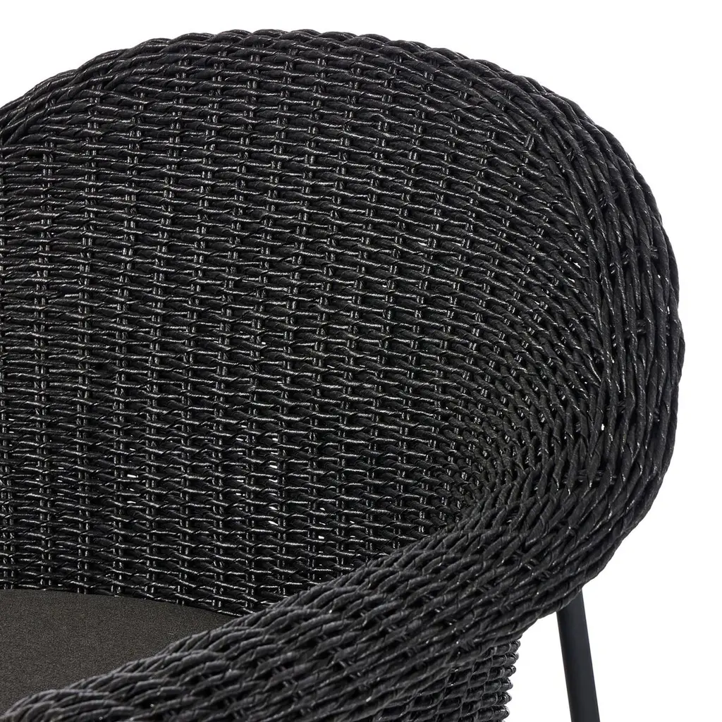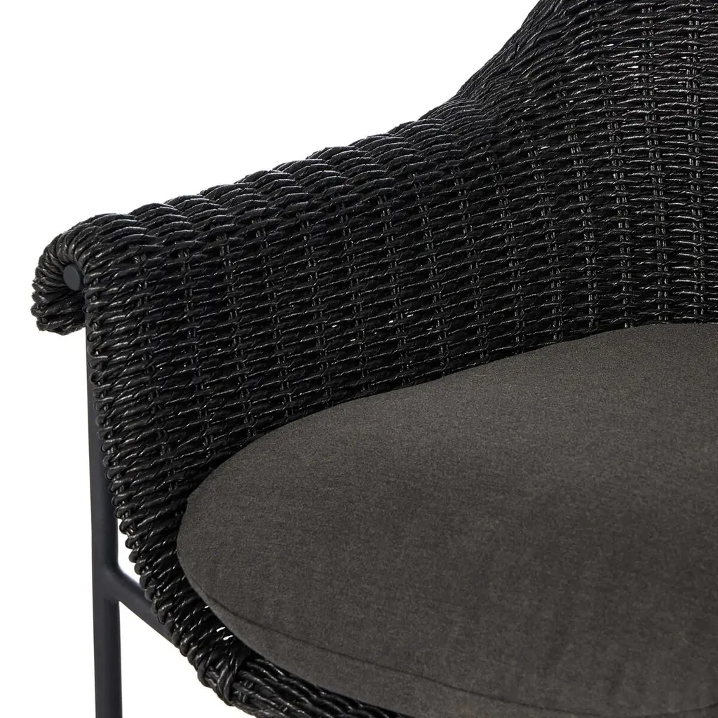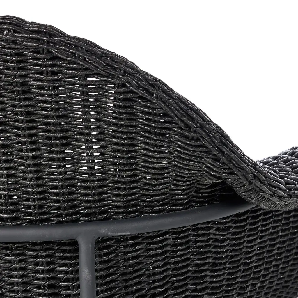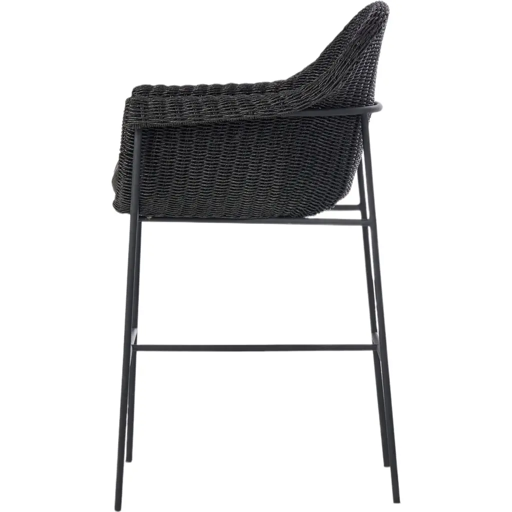 With a curvy silhouette and classic rolled arms, this outdoor bar stool features a woven frame that brings modern sensibility to a vintage-inspired design. An airy iron cradle base provides a beautiful balance of scale, complemented by a fully upholstered cushion for a comfortable sit. Ideal for outdoor settings, this bar stool should be covered or stored indoors during inclement weather and when not in use.