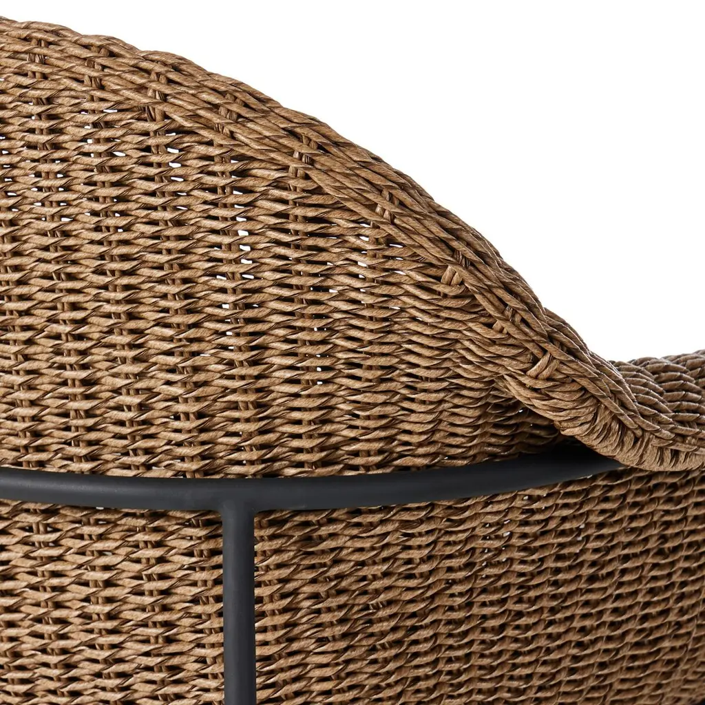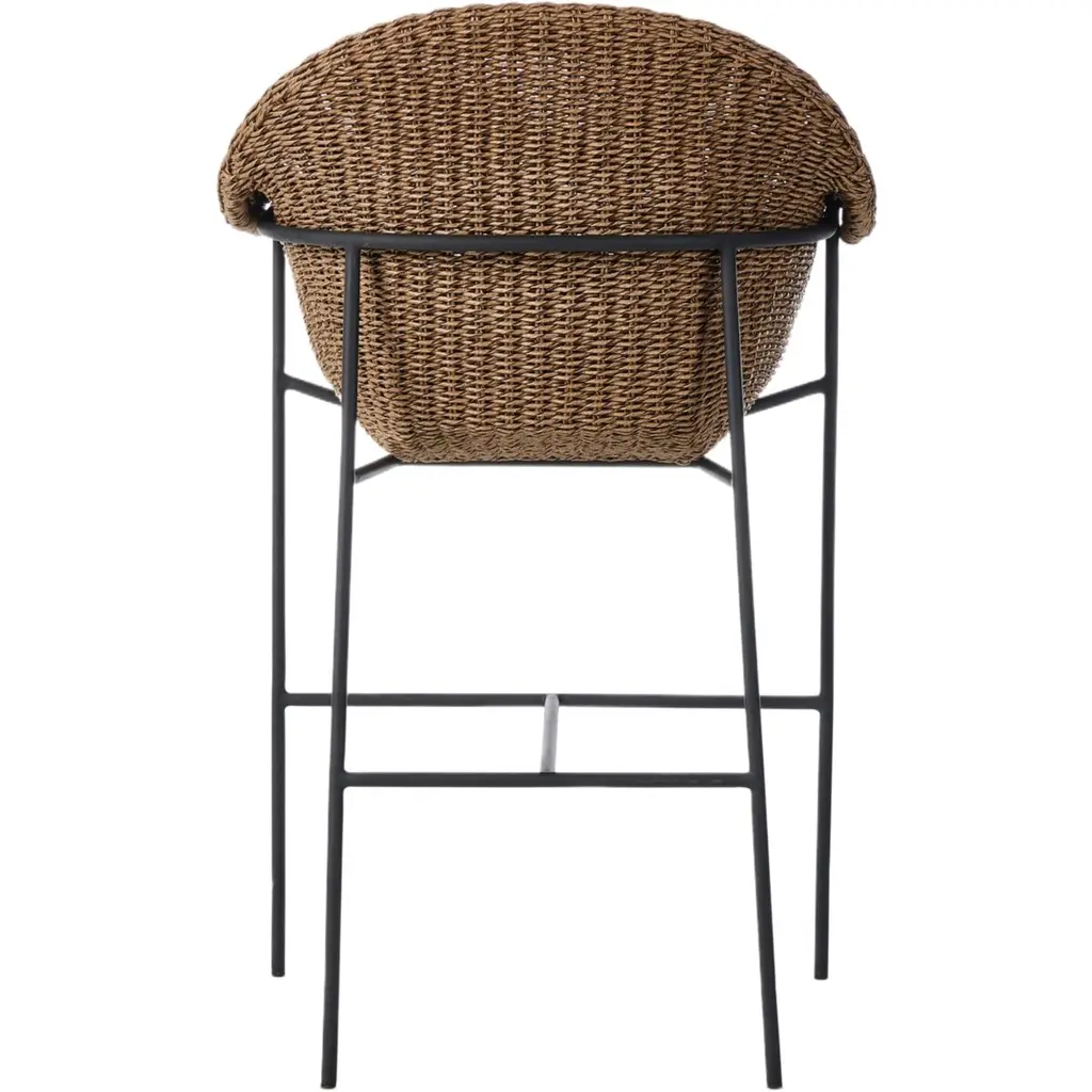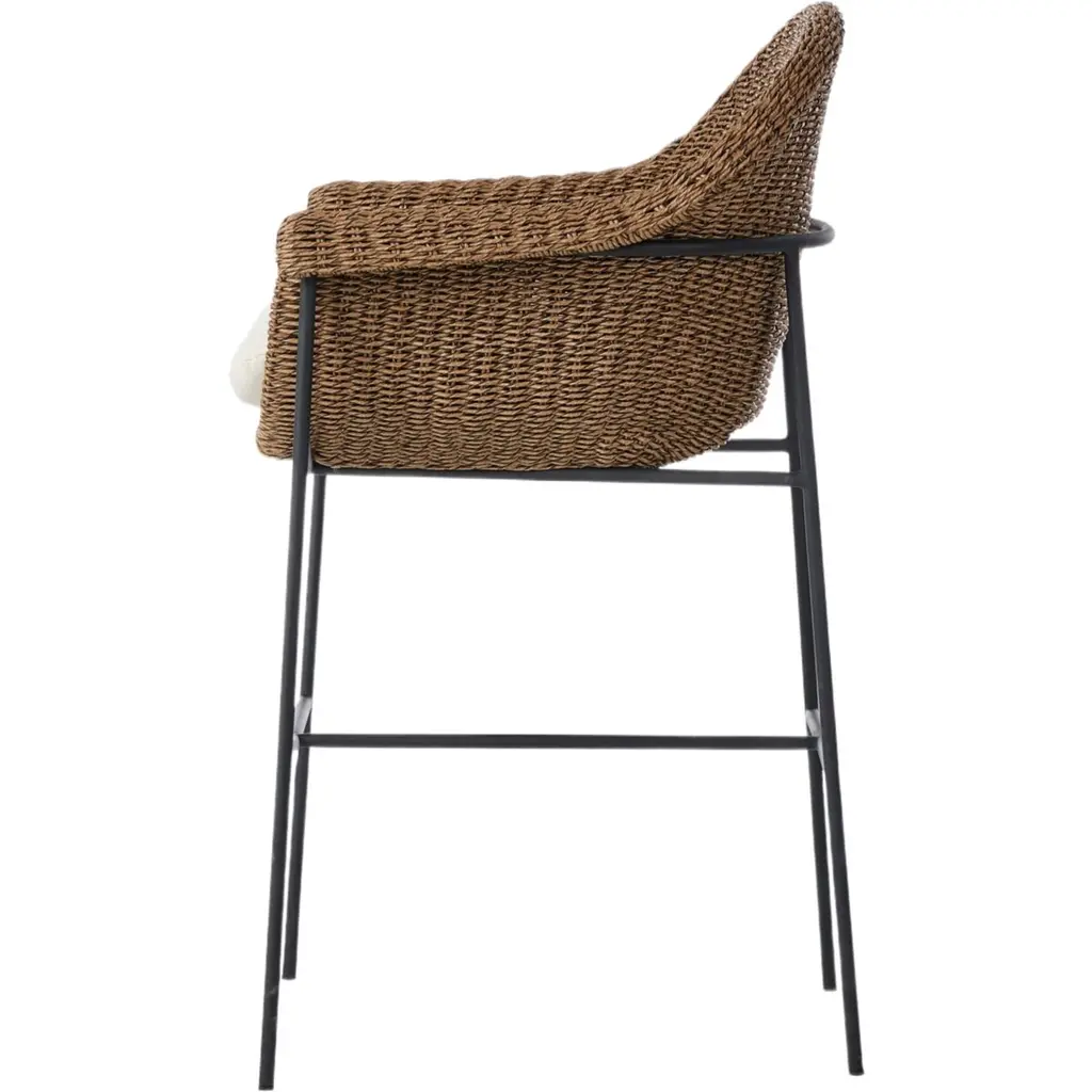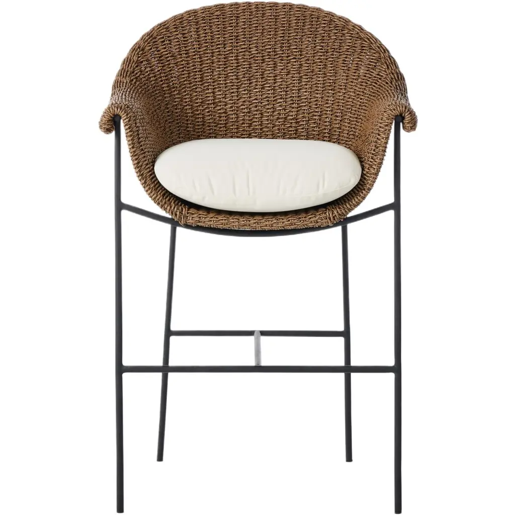 With a curvy silhouette and classic rolled arms, this outdoor bar stool features a woven frame that brings modern sensibility to a vintage-inspired design. An airy iron cradle base provides a beautiful balance of scale, complemented by a fully upholstered cushion for a comfortable sit. Ideal for outdoor settings, this bar stool should be covered or stored indoors during inclement weather and when not in use.