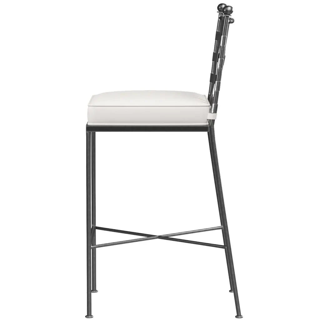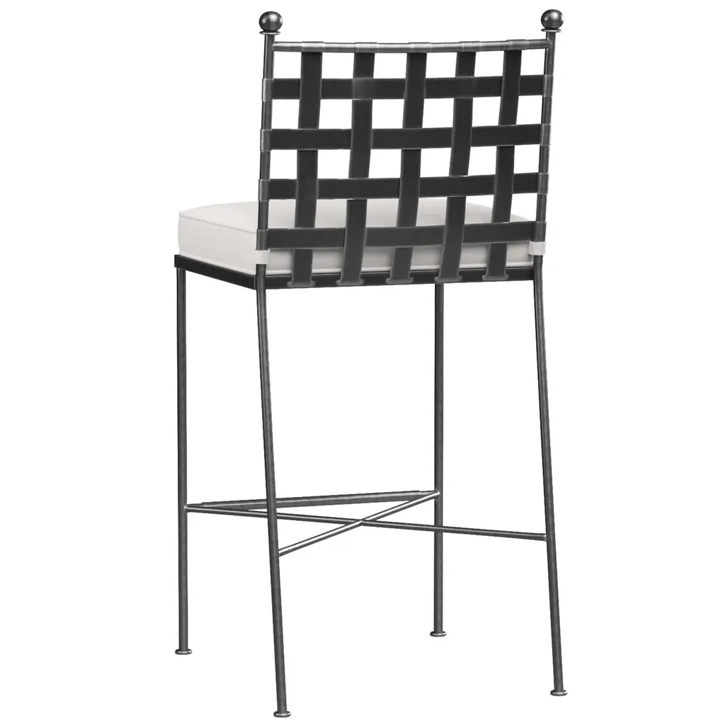 Constructed in expertly crafted wrought iron, the Isla Barstool features a woven back to emulate basket weave and a subtly brushed antique finish. Gently bowed arms and a generous seat are scaled for absolute comfort. The wrought iron frame undergoes a 5-step finish process and is powder-coated for durability. It includes weather-resistant, high-resiliency foam cushions and is stocked in premium fabric. This stool is of commercial quality construction, with Isla is part of the Classic color story and adds a timeless touch when paired with other collections.