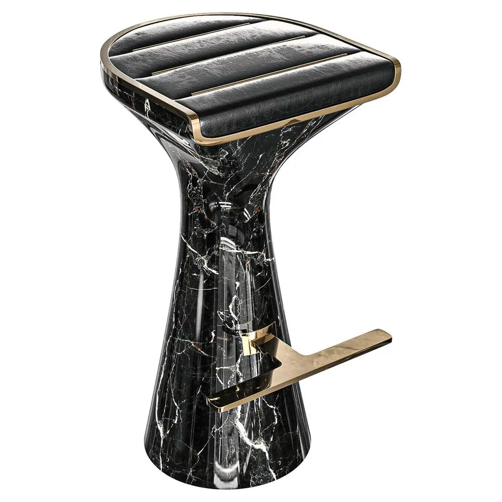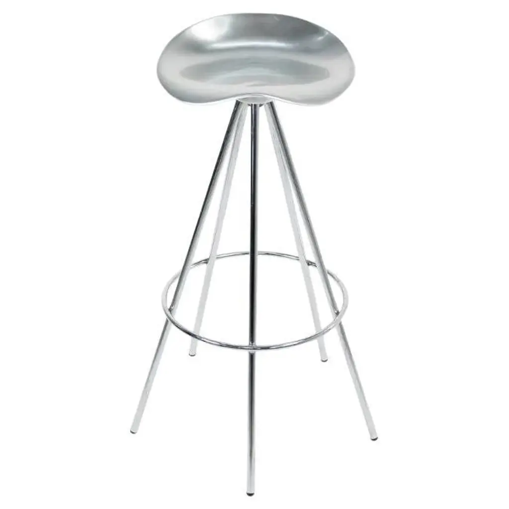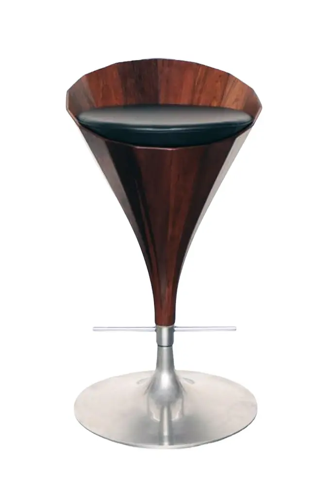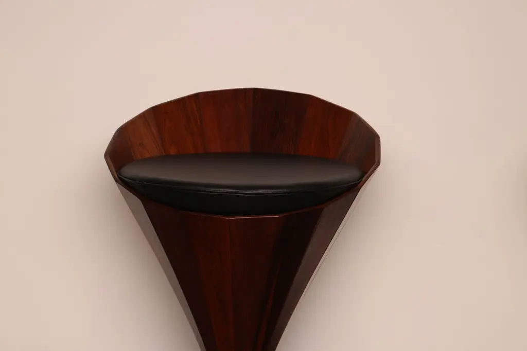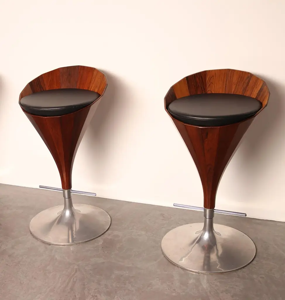 Beautiful cone shaped bar stools. Aluminum base with hardwood and leater seat. Designed by John Mortensen for Dyrlund in the 1970s. Up to four available, price per stool.