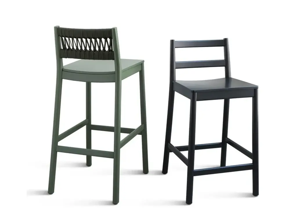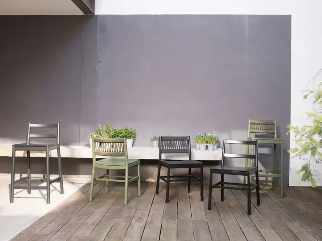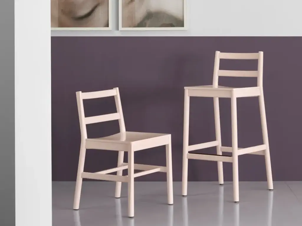 Beechwood chair with or without colored rope back and wood seat (also upholstered with leather or fabric) from the JULIE collection, designed by Emilio Nanni.