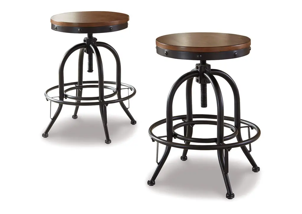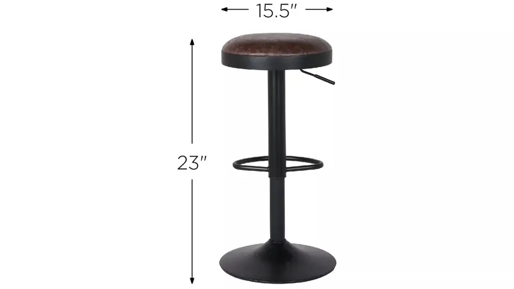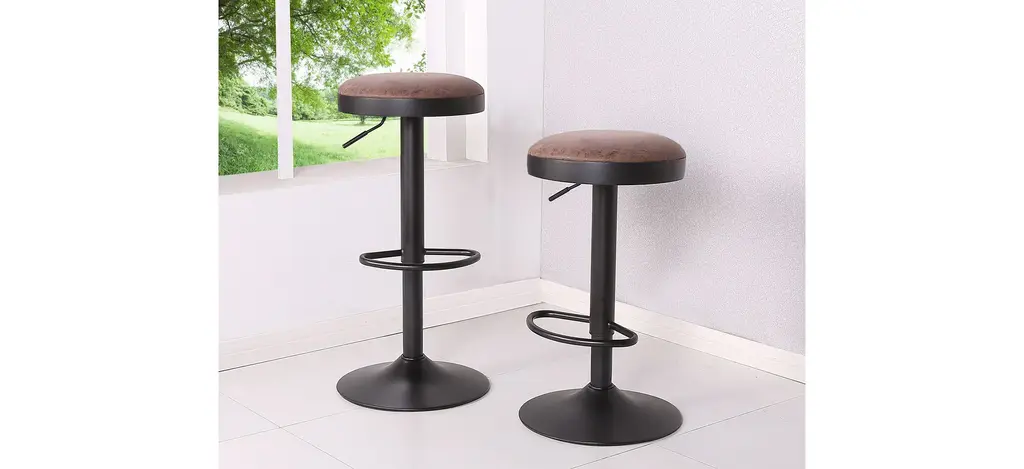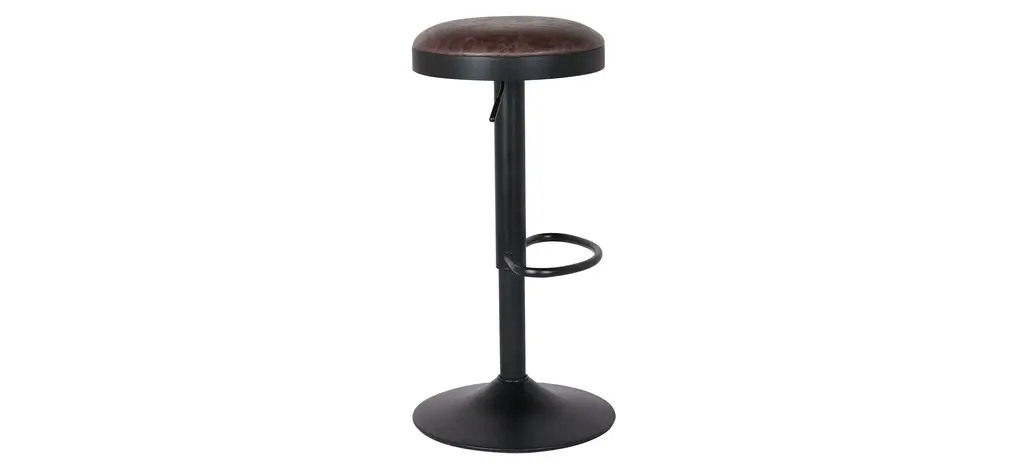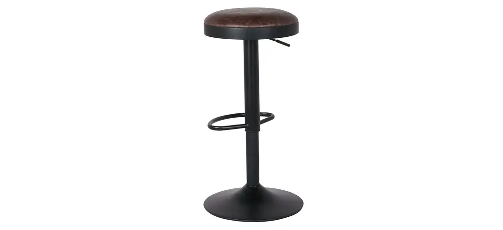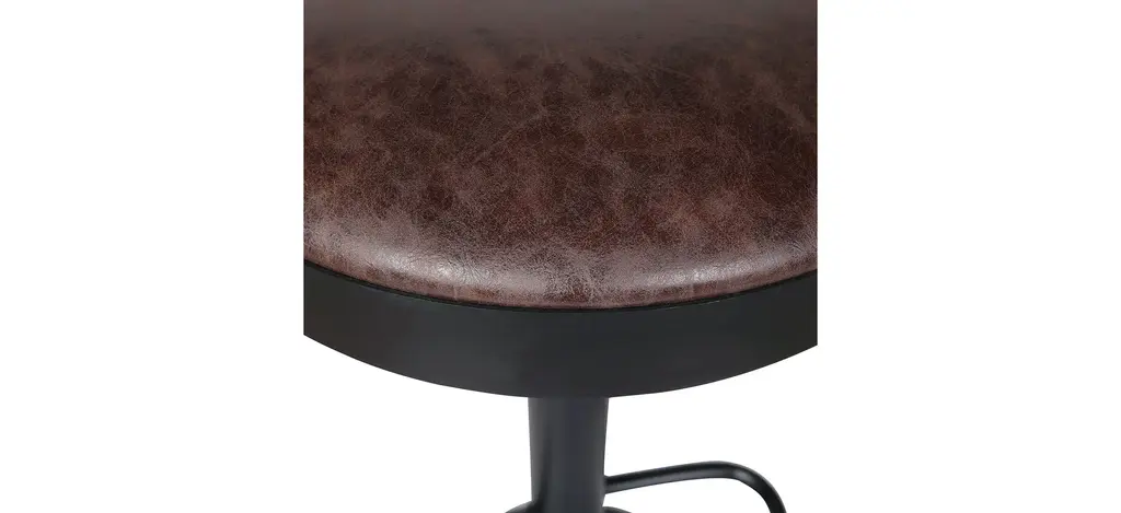 The seat swivels 360 degrees and also moves up or down pneumatically with the help of a small lever on the Juno Gaslift Backless Bar Stool: Set of 2. Our modern industrial-style stool will provide you and your guests with comfortable, attractive seating that adjusts from 23 inches high to 31.5 inches high. The stool is topped with leather-like fabric and features a handy foot rest encircling the black steel base.