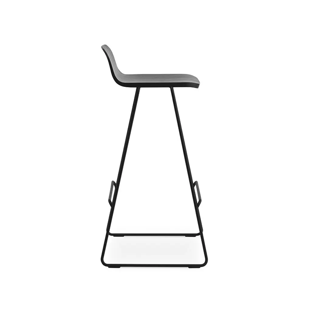 Just Barstool, designed by Iskos-Berlin for Normann Copenhagen, is a minimalist bar stool that has been reduced to two elements: a slender metal base and a simple molded shell. The design catches the eye with its thick seat, described aptly as a sandwich of veneers, and provides a comfortable sitting experience due to its footrest and slightly downward curving front. Thanks to its simple contemporary design, Just Barstool is well suited for a variety of spaces and uses – the lower version is perfect for kitchen islands and the higher one suits bar counters.