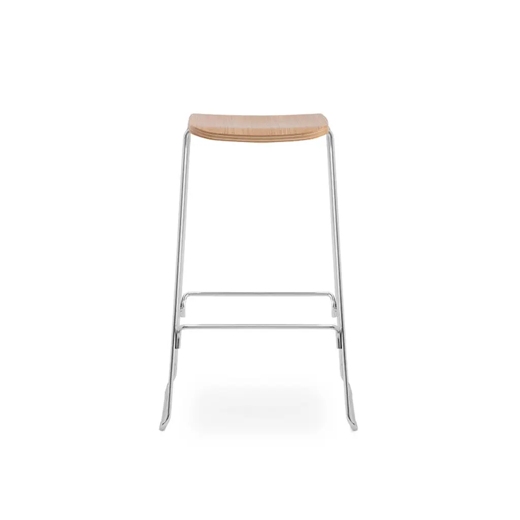 Just Barstool, designed by Iskos-Berlin for Normann Copenhagen, is a minimalist bar stool that has been reduced to two elements: a slender metal base and a simple molded shell. The design catches the eye with its thick seat, described aptly as a sandwich of veneers, and provides a comfortable sitting experience due to its footrest and slightly downward curving front. Thanks to its simple contemporary design, Just Barstool is well suited for a variety of spaces and uses – the lower version is perfect for kitchen islands and the higher one suits bar counters.