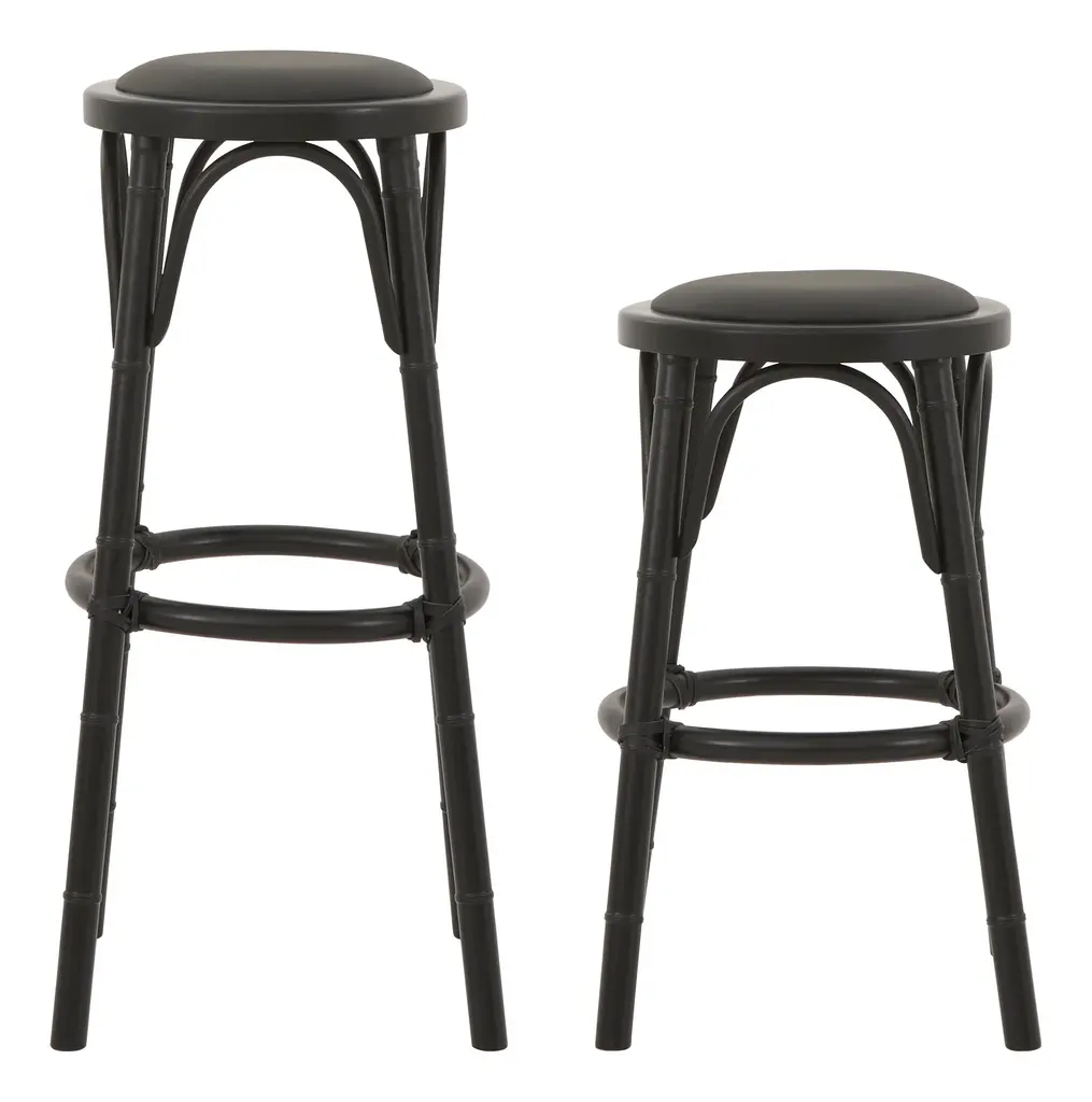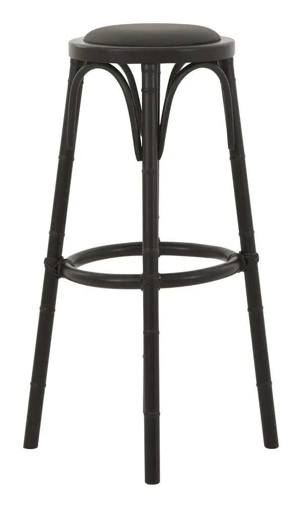 Pull up a seat with our vintage-chic Karim Bar Stool. Taking its cue from Thonet’s classic bentwood bistro chair, Karim pairs a sturdy beechwood frame with a sleek matte black finish and a comfortably supportive black faux leather seat. Versatile enough to fit in with any style, Karim would be perfect paired with a casual kitchen island or as seating at a handsome home bar. •black faux leather •beech wood•matte black finish Dimensions •21" diameter x 31.5"H