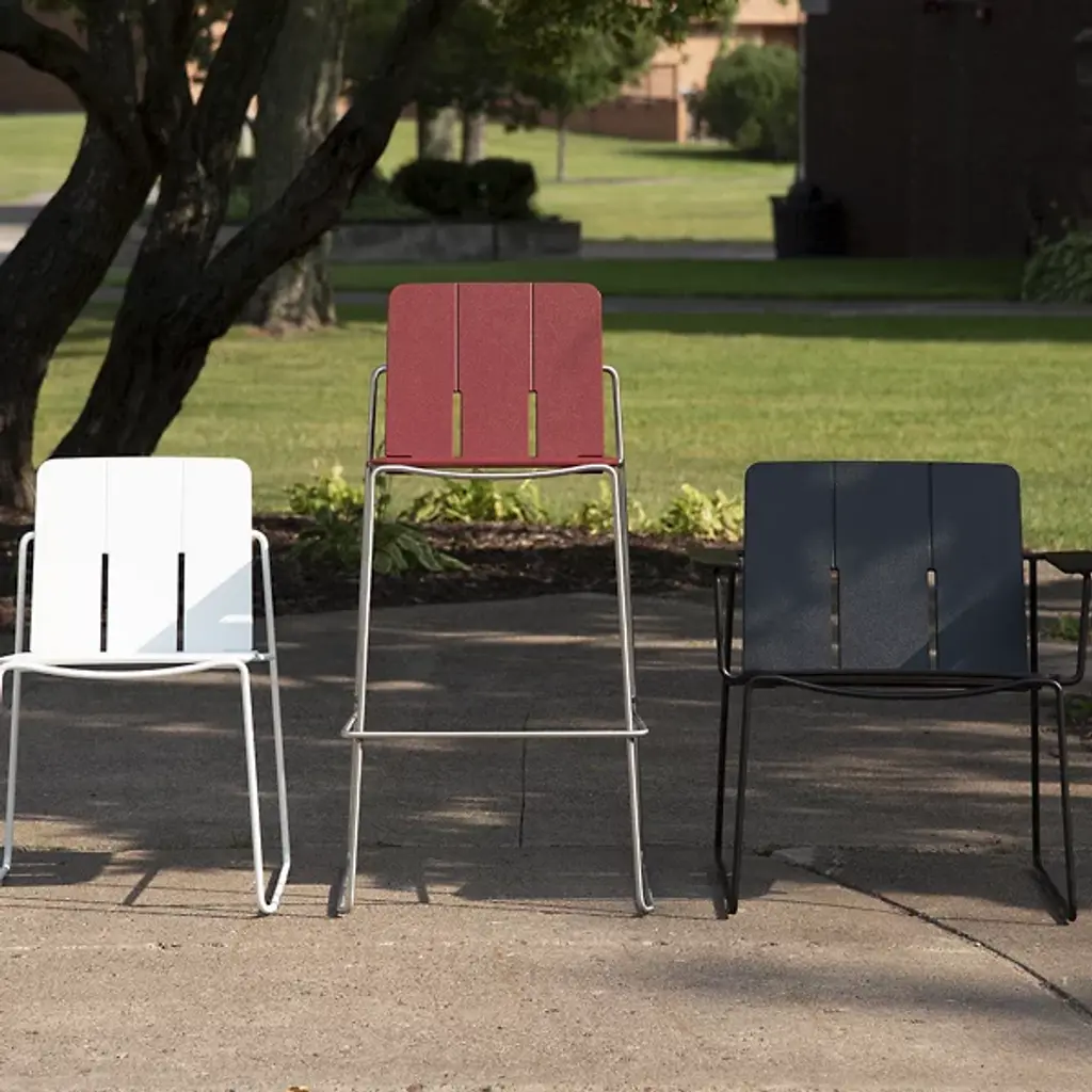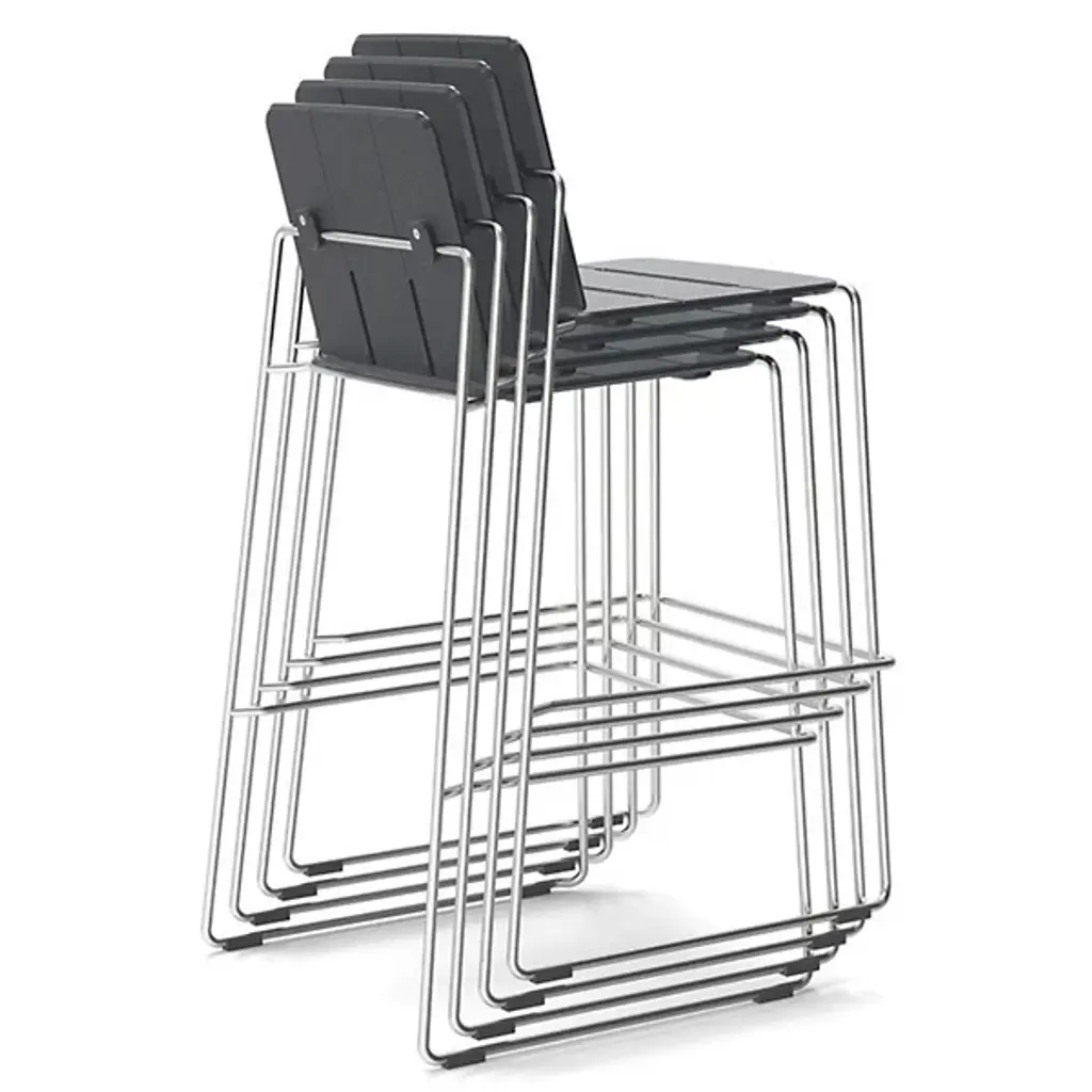 Sit high in style with the open, elevated structure of the Keene Outdoor Bar Stool from Loll Designs. A contemporary design with a slender stainless steel structure braced by a footrest, it elevates a small seat featuring small openings so water doesn’t pool on the seat. The slim steel contrasts with the smooth seat and back, made from Recycled High-Density Polyethylene, or HDPE, a process that mostly uses milk jugs due to their initial lack of pigmentation. Each seat stacks up to four stools high when not in use and features glides that protect the surfaces below.