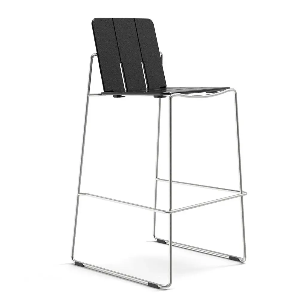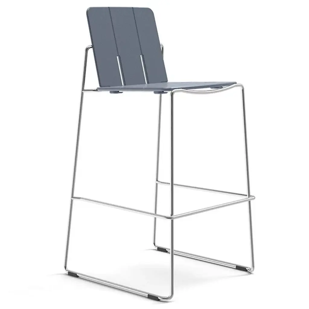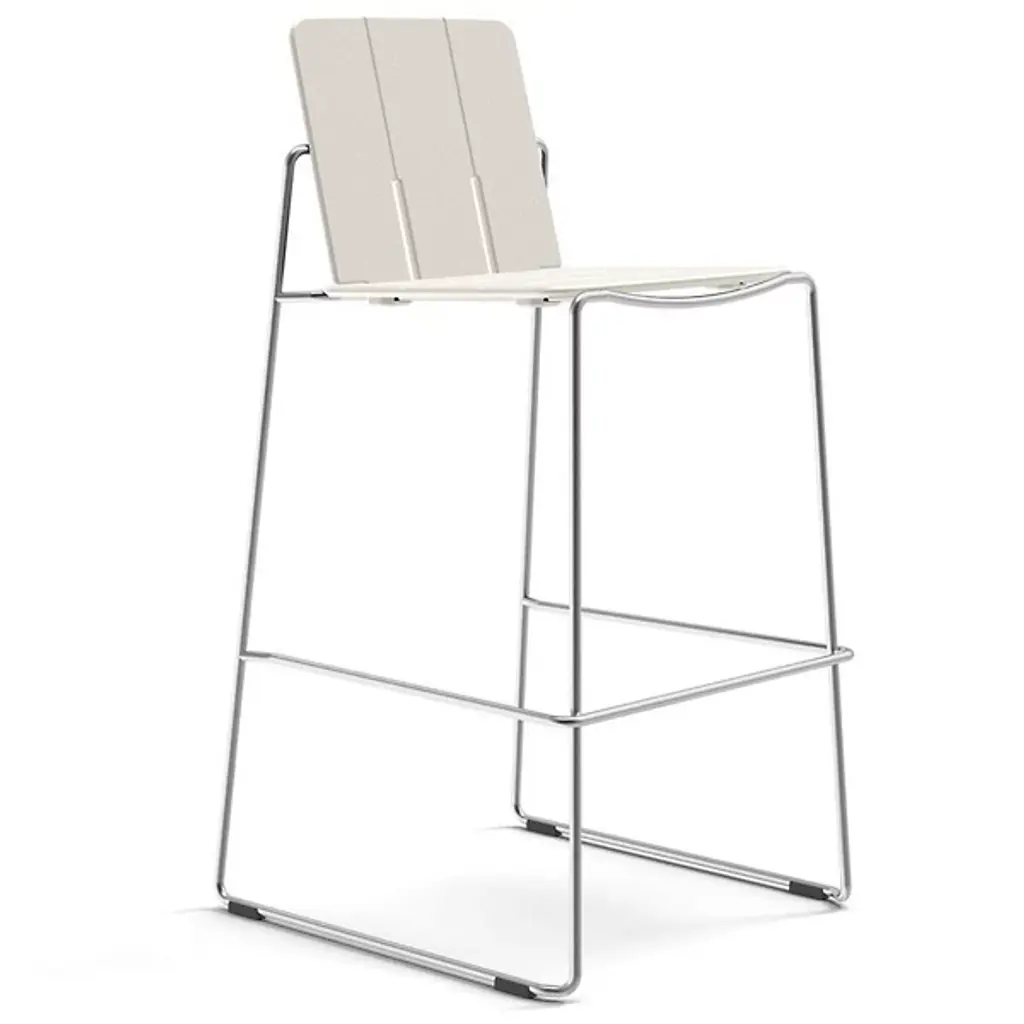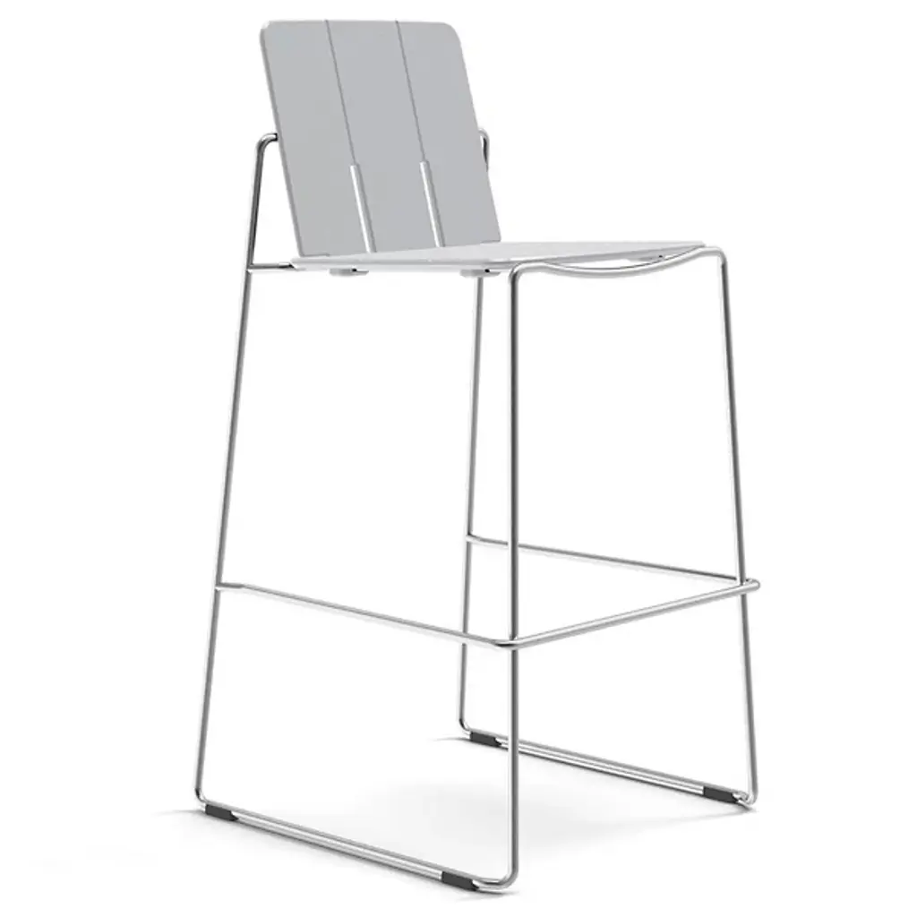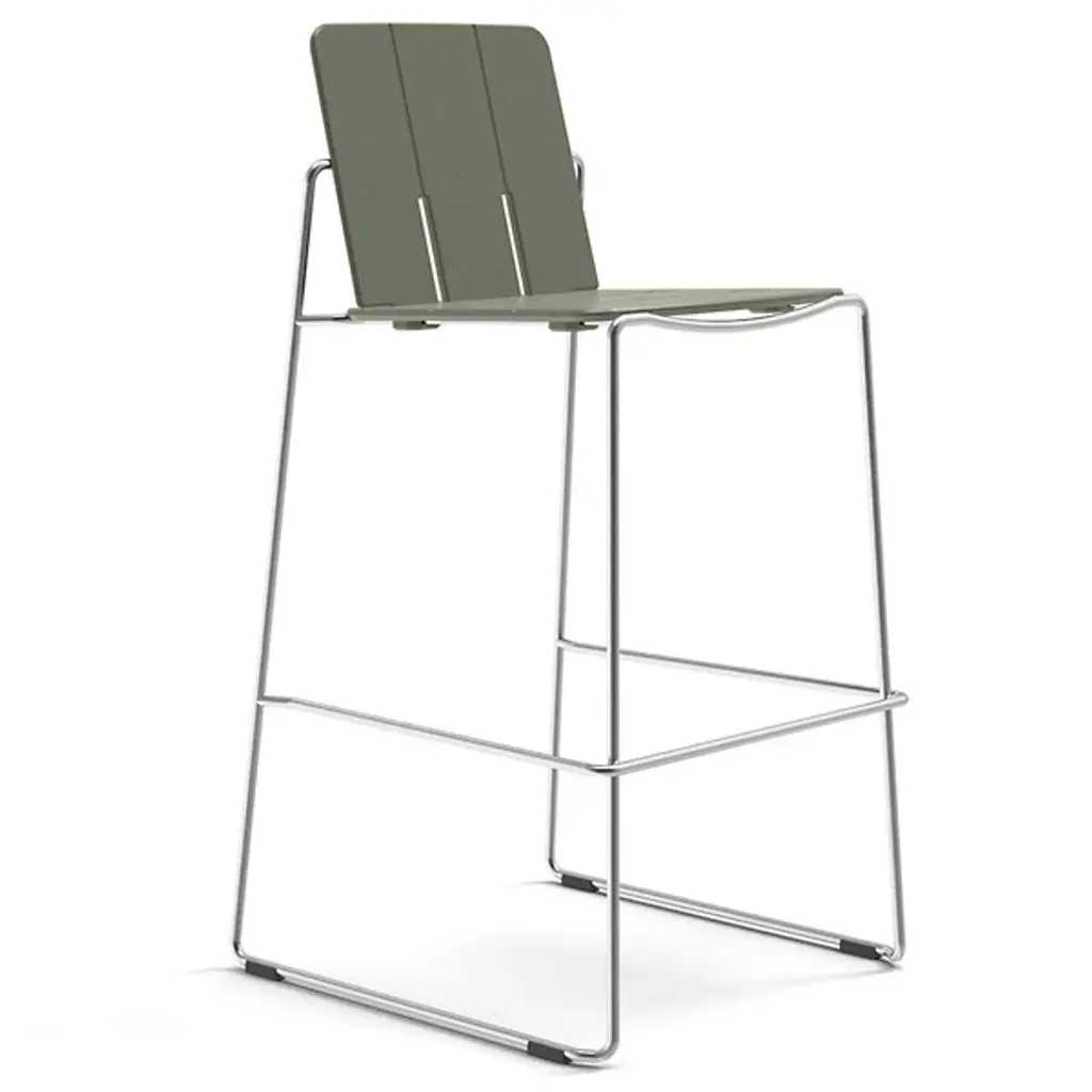 Sit high in style with the open, elevated structure of the Keene Outdoor Bar Stool from Loll Designs. A contemporary design with a slender stainless steel structure braced by a footrest, it elevates a small seat featuring small openings so water doesn’t pool on the seat. The slim steel contrasts with the smooth seat and back, made from Recycled High-Density Polyethylene, or HDPE, a process that mostly uses milk jugs due to their initial lack of pigmentation. Each seat stacks up to four stools high when not in use and features glides that protect the surfaces below.