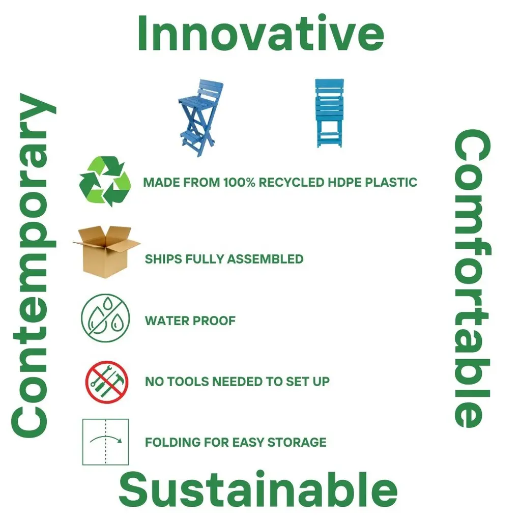 Elevate your outdoor entertaining with the Key West Folding Bar Stool. Crafted from 100% recycled HDPE plastic, this eco-friendly stool combines sustainability with style. Its all-weather construction resists fading and UV damage, ensuring long-lasting color and durability. The foldable design allows for effortless storage and portability, making it perfect for patios, decks, balconies, or poolside gatherings. Arriving fully assembled, it's ready to enhance your outdoor space right out of the box.Features:Dimensions:
