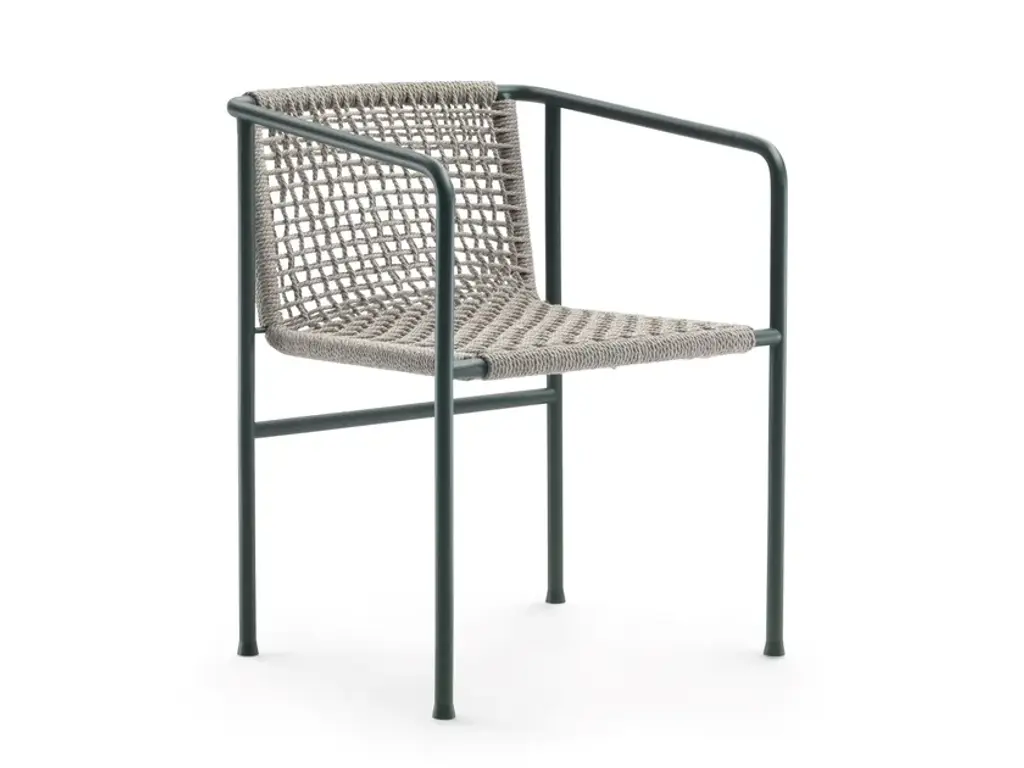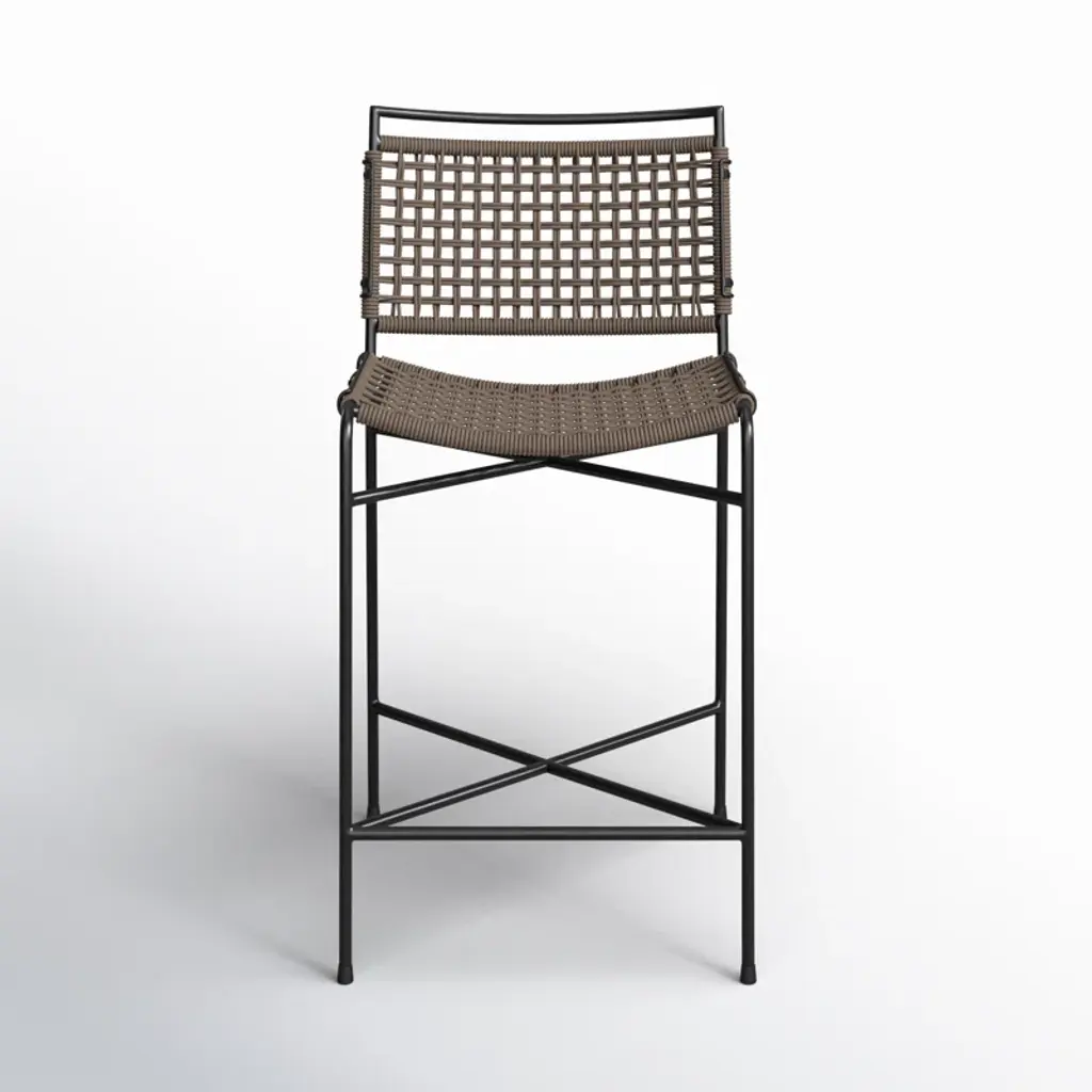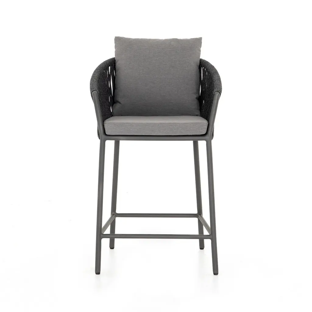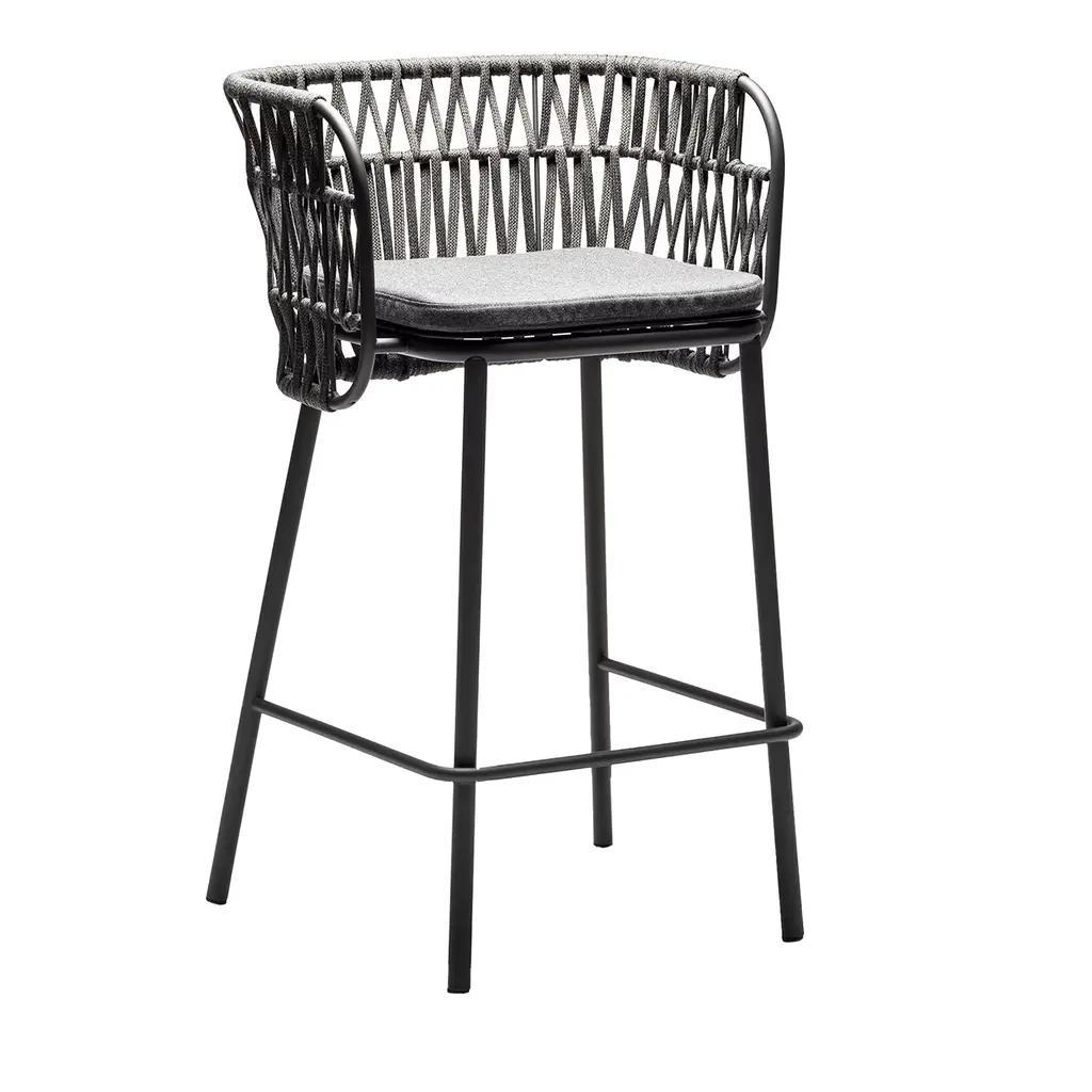 This elegant bar stool has an anthracite powder-coated steel frame. The handwoven seat and back are enriched with mèlange Maine rope. Suitable for outdoor use.