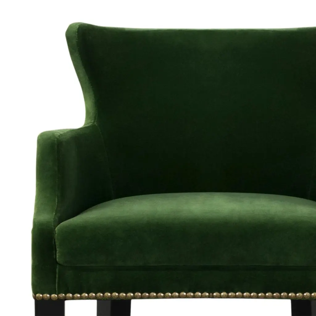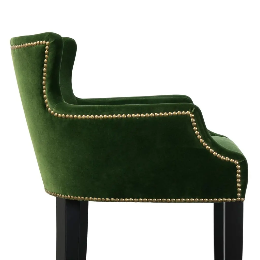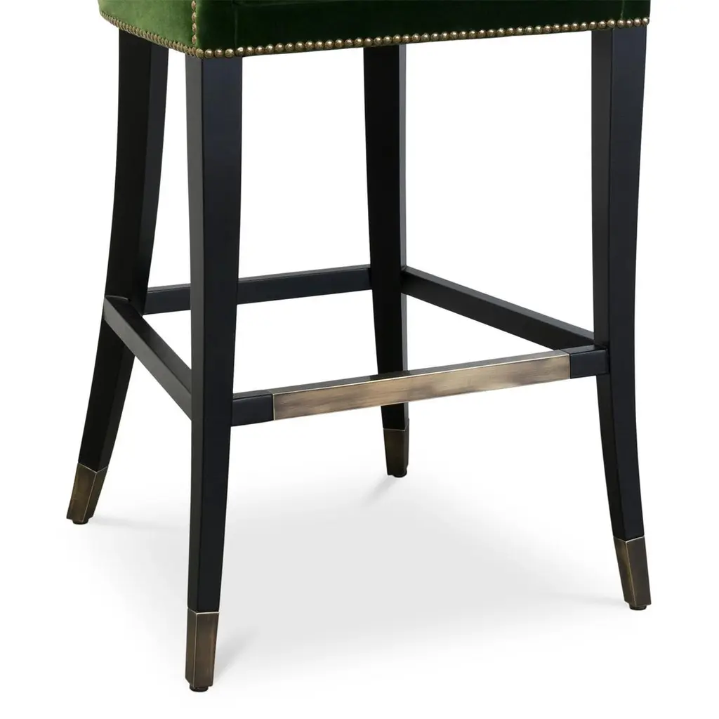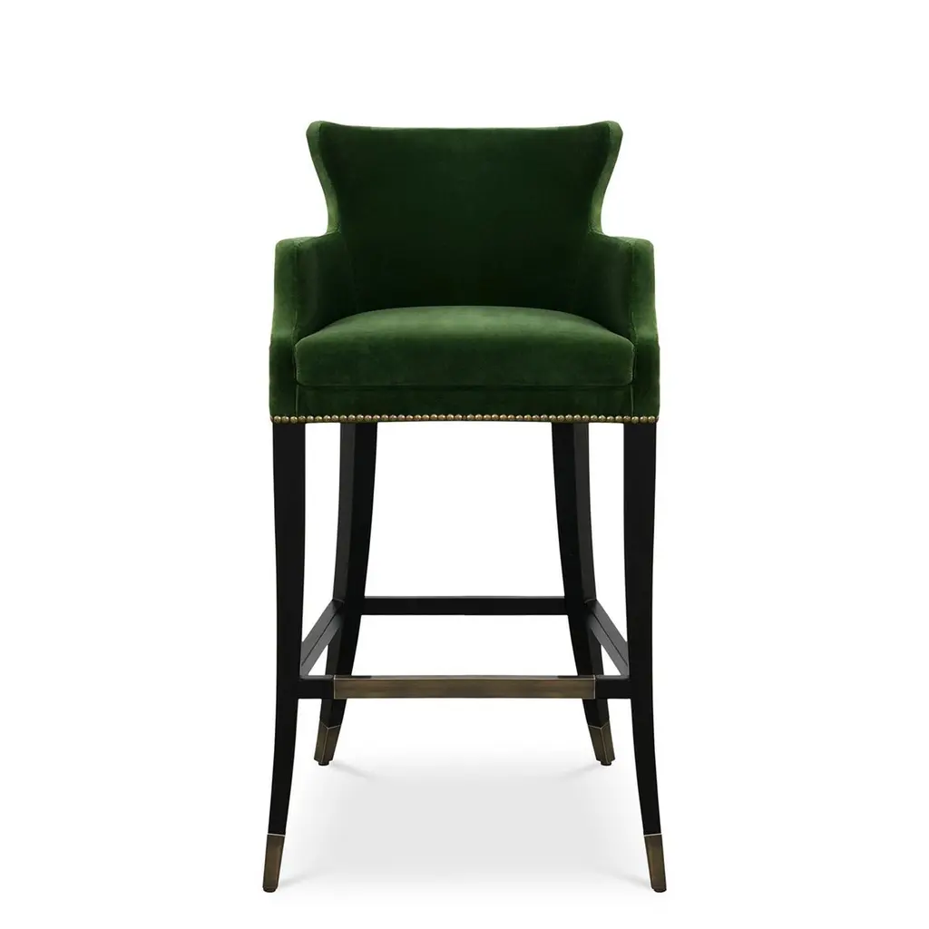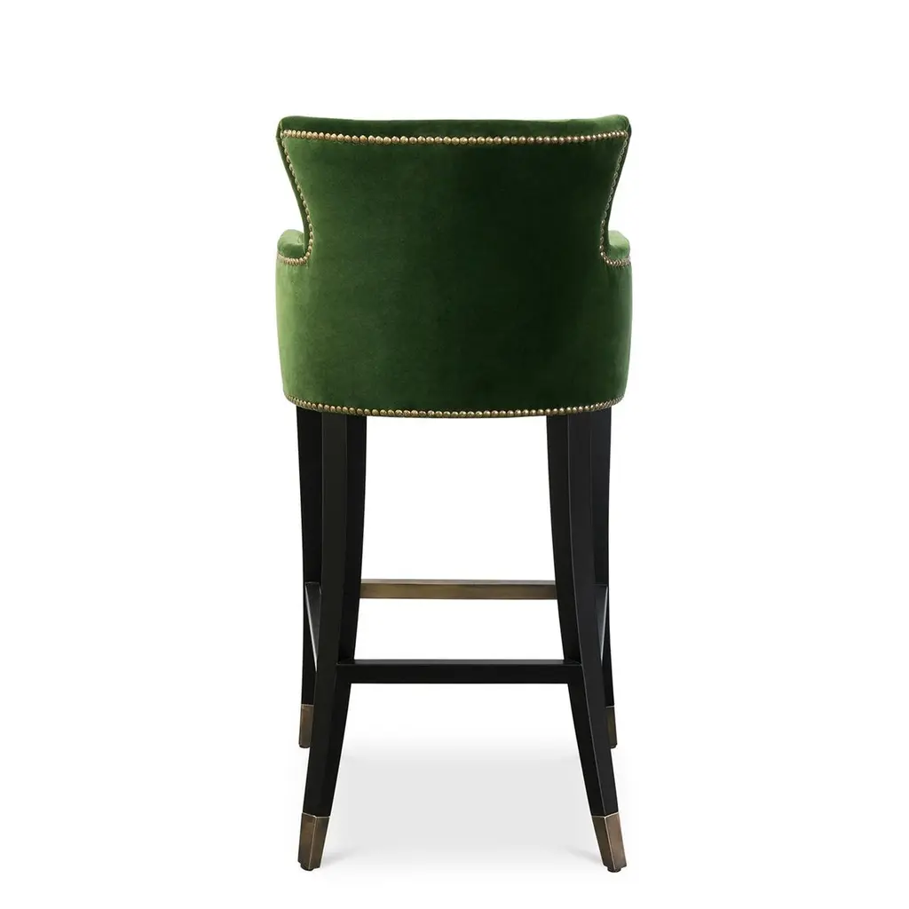 Bar stool Komo with solid wood structure in black finish,upholstered and covered with Grade A velvet fabric.With reinforced footrest and feet in solid brass in brushed finish.Also available with other fabric colors finishes in Grade A, on request.