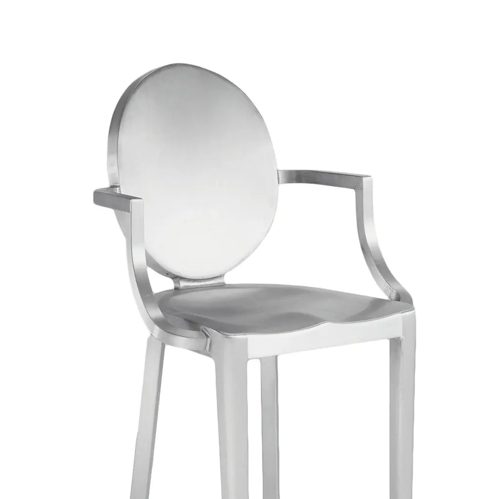 Kong by Philippe Starck, 2003 A timeless piece, built for lifetimes of use, to be kept, cherished and passed on for generations. Made to order. Built by hand from 80% recycled aluminum in Hanover, Pennsylvania by our most skilled craftsmen. Guaranteed for life. First designed for the Chinese restaurant Kong in Paris. The one armed barstool was intended to make it easy and graceful for the guests to slither in and out of the bar. Kong requires the hand welding of 24 separate pieces of aluminum, and 8 hours of hand polishing. Standard glides: soft plastic TPU glides for all-around use, including outdoor use. Alternative glides available at an upcharge.