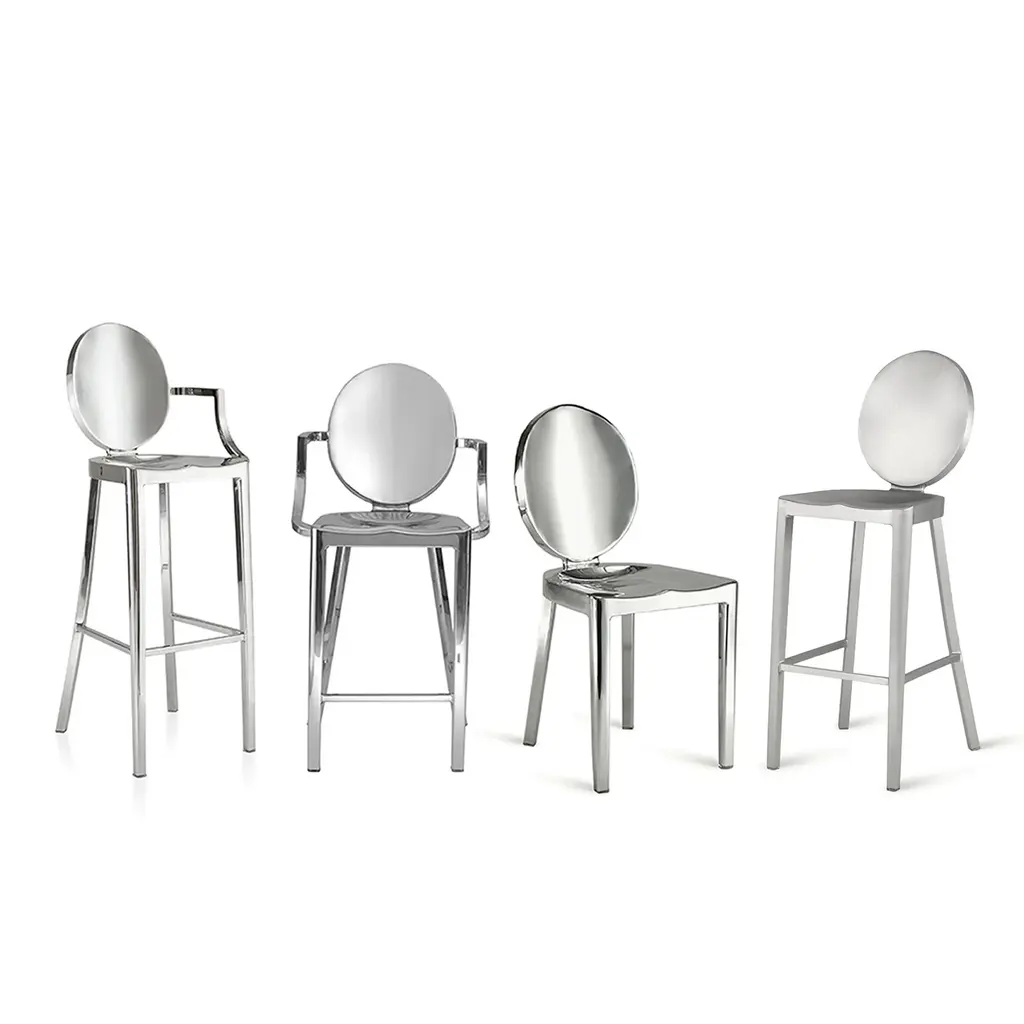 Starck first designed the Kong barstool for the Chinese restaurant Kong in Paris. The one armed stool was intended to make it easy and graceful for the super model clientele to slither in and out of the bar. Kong requires the hand welding of 24 separate pieces of aluminum, and an additional 8 hours of hand polishing. Features