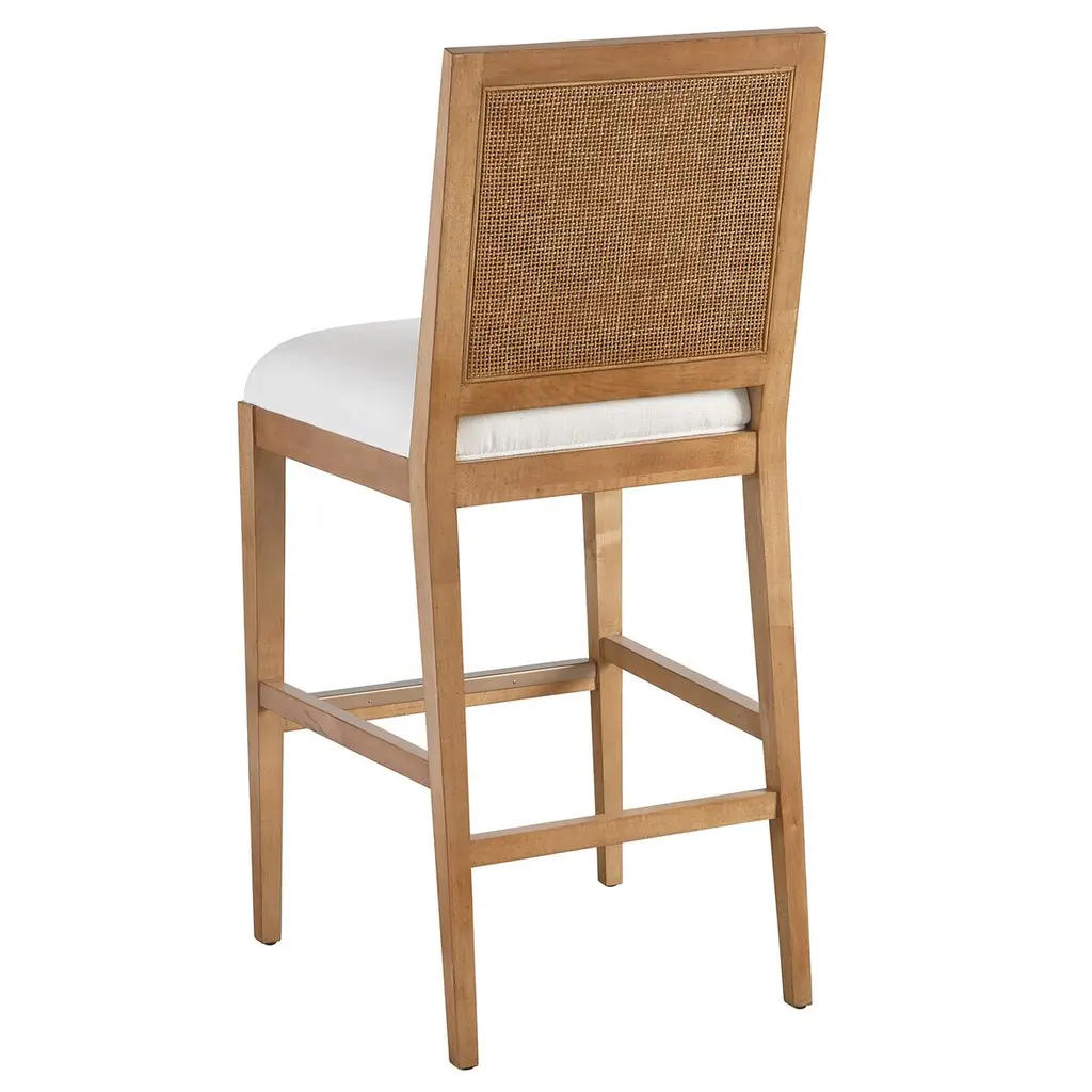 Designed by Barclay Butera, this barstool will bring easygoing elegance to a room. The double-caned back insert provides a textural contrast to the wooden frame, while the burnished brass kickplate adds a dash of glamour. The generously cushioned seat is upholstered in stain-resistant performance fabric.