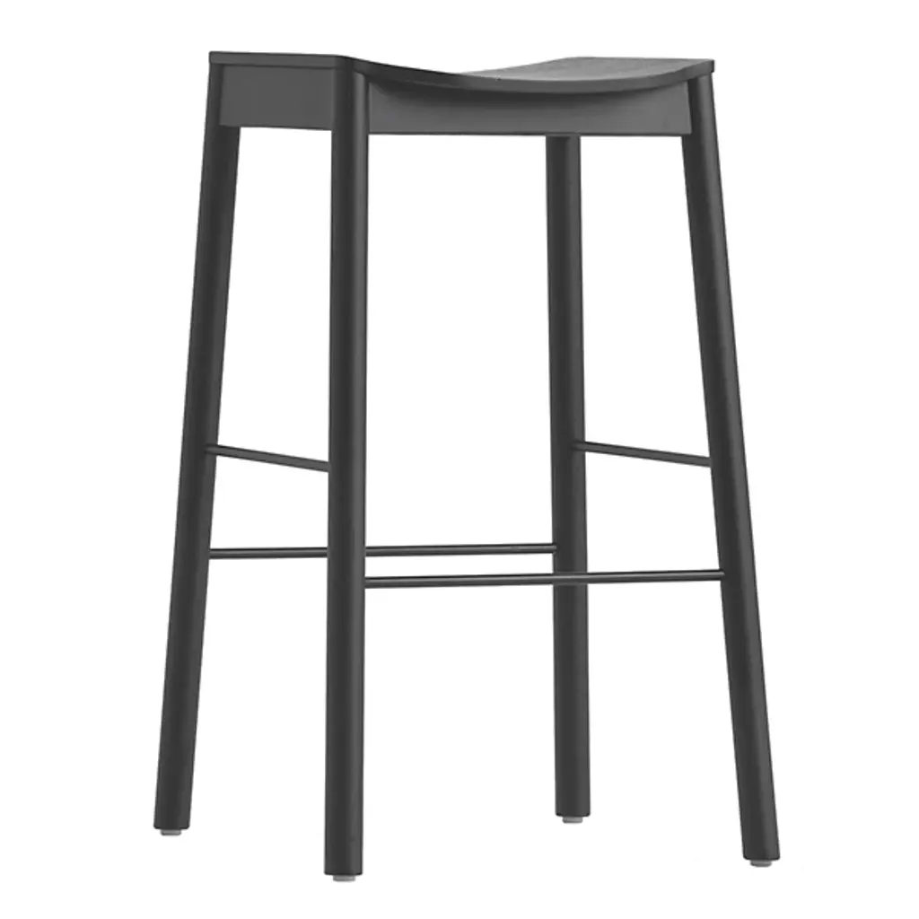 Lammi bar stool, 66 cm, black by Made By Choice with Saku Sysiö. Dimensions: 47 x 38 x 66 cm. Materials: Oak. Standard finishes: natural wood / painted black. Also available: Lammi bar stool tall (74cm) & custom colors on request. Saku Sysiö drew inspiration for the Lammi bar stool from the place of the same name in southern Finland. Saku has a summer cottage in Lammi and the organic, minimalistic shape of the stool was inspired by a nearby lake. The pond like seat form grows towards the floor with the footrest is like a ring in the water. Lammi is a solid piece of furniture that works well in environments with a softer design language.