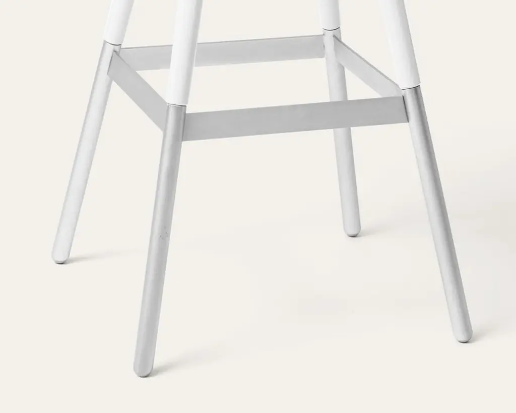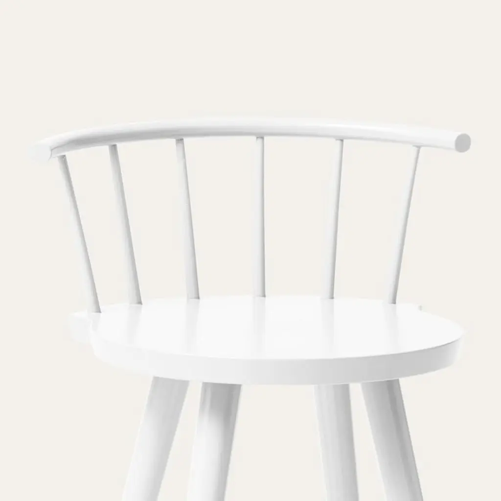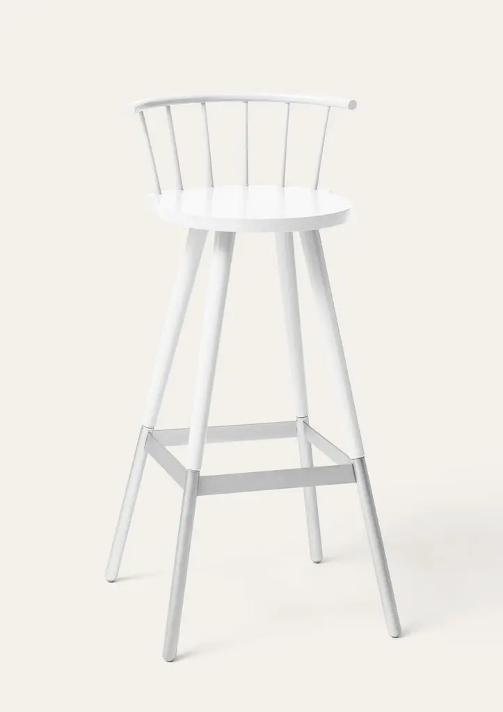 Large White Tupp barstool by Storängen DesignDimensions: D 45 x W 45 x H 102 x SH 82 cmMaterials: birch wood, nickel plated steel.Also available in other colors.Give the bar some character! Tupp is avaliable in two heights, both with and without backrest. This provides the versatility to fit into a variety of interiors, from the public bar to your kitchen counter. Firmly rooted in the Swedish crafts tradition in appearance and with materials chosen for longevity. The base made from Swedish steel works for anything from high heels to ski boots. Simply put, a good bar stool.Storängen DesignIn early 2017 Mårten Cyrén and Torbjörn Källberg established Storängen Company – an IDEA 15 years in the making.In the fall of 2020 Mårtens son Carl replaced Torbjörn as CEO and co-owner. Together they continue to collaborate with a well-established network of designers, craftsmen and makers, and further develop a portfolio of furniture based on timeless ideals and modern Scandinavian design.Such as Storängen. A bold and charismatic offspring of the Classic Windsor chair with uncompromising functionality and craftsmanship. The product that gave the company its name and with it came a simple IDEA: creating a direct and honest link between the craftsmen making the furniture, and the professional and private buyers they were intended for.Storängen furniture is sustainably sourced, classically designed and manufactured with a combination of traditional skills and modern techniques. It is furniture to last a life-time.
