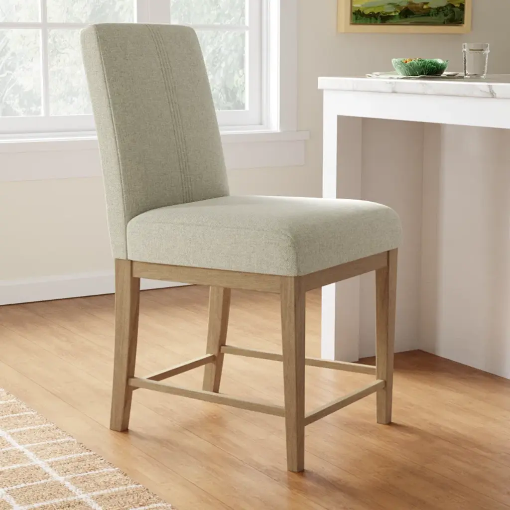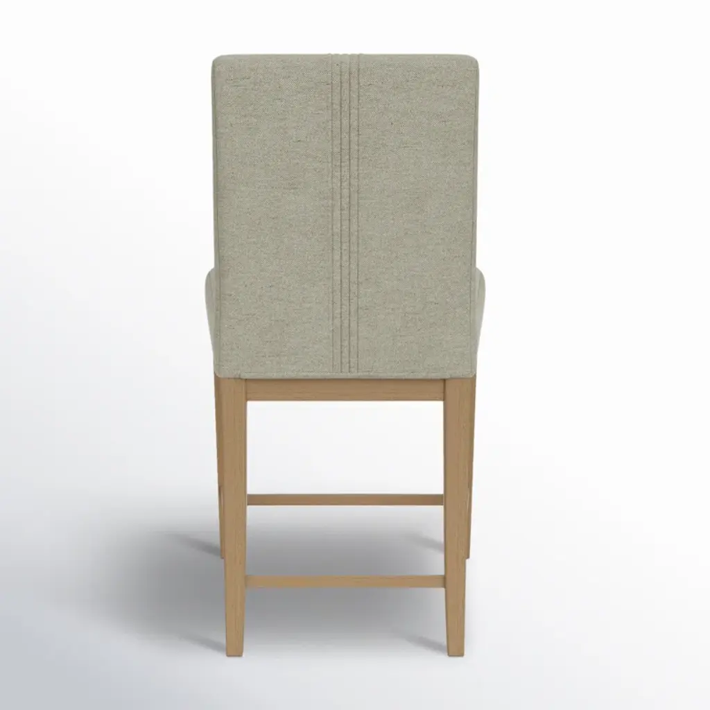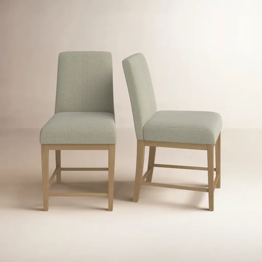 Complete your eat-in kitchen with this 2-piece bar stool set. Each has a classic silhouette made from kiln-dried solid wood finished in a pale oak hue. The high backs and seats are padded with foam and wrapped in a neutral gray upholstery that’s an easy match with your existing design scheme. Stretchers across the front legs double as footrests and plastic pads on the feet protect your floors from scratches.