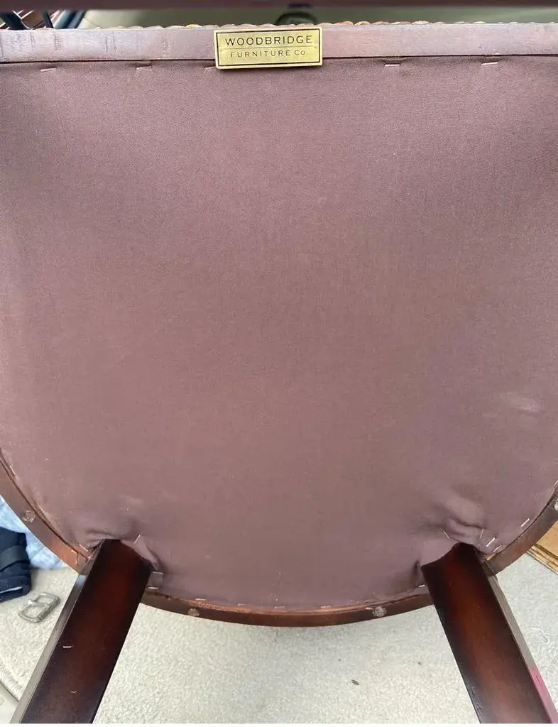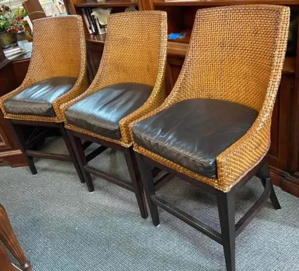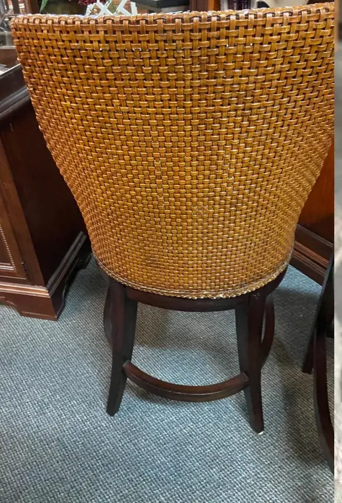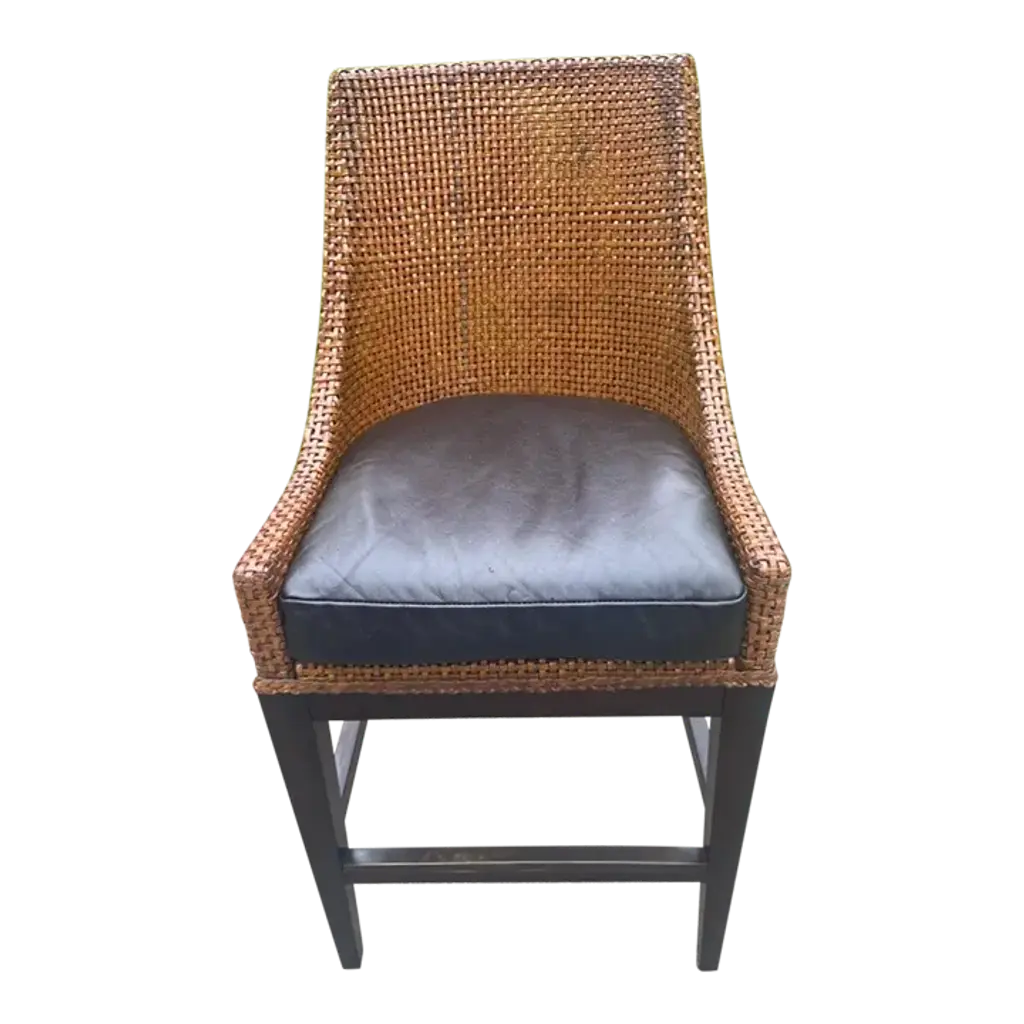 McGuire Style Leather Lace Barrel Bar Stool Counter By Woodbridge Gold Metal Tag underneath Designer chair features a curved back woven with fine leather. A leather upholstered seat rests above gently tapering posts. With leather removable zipper cushion seat On Solid wood base Amazing comfort But 1 or A Pair or Set of 3 This listing is for 1 chair only Minor age wear