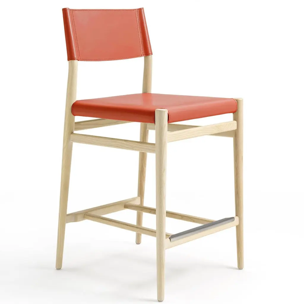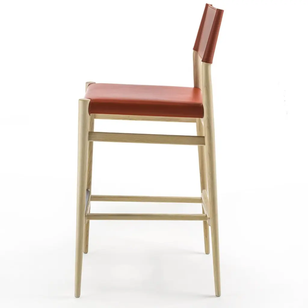 The seat of this bar stool is covered entirely in leather, while its back is composed of a single, leather strap. Its wooden structure features four elongated, tapered wooden legs with a comfortable footrest. In bleached ash wood with orange-colored leather, with a wide selection of alternative colors and finishings available. The price is quoted upon order.