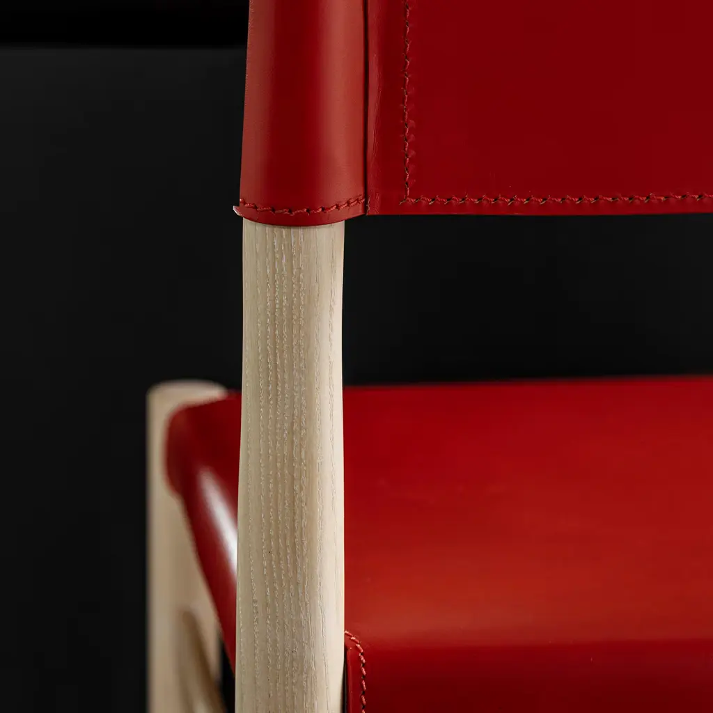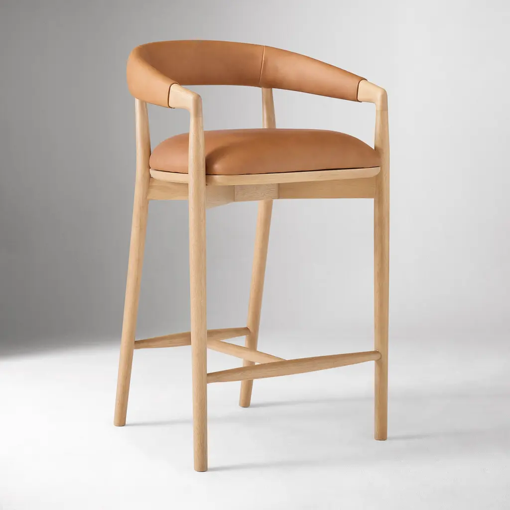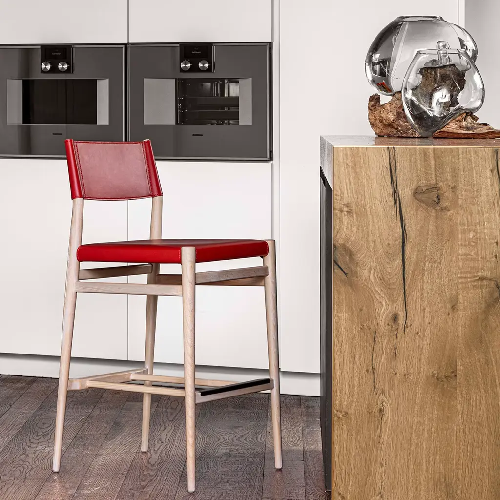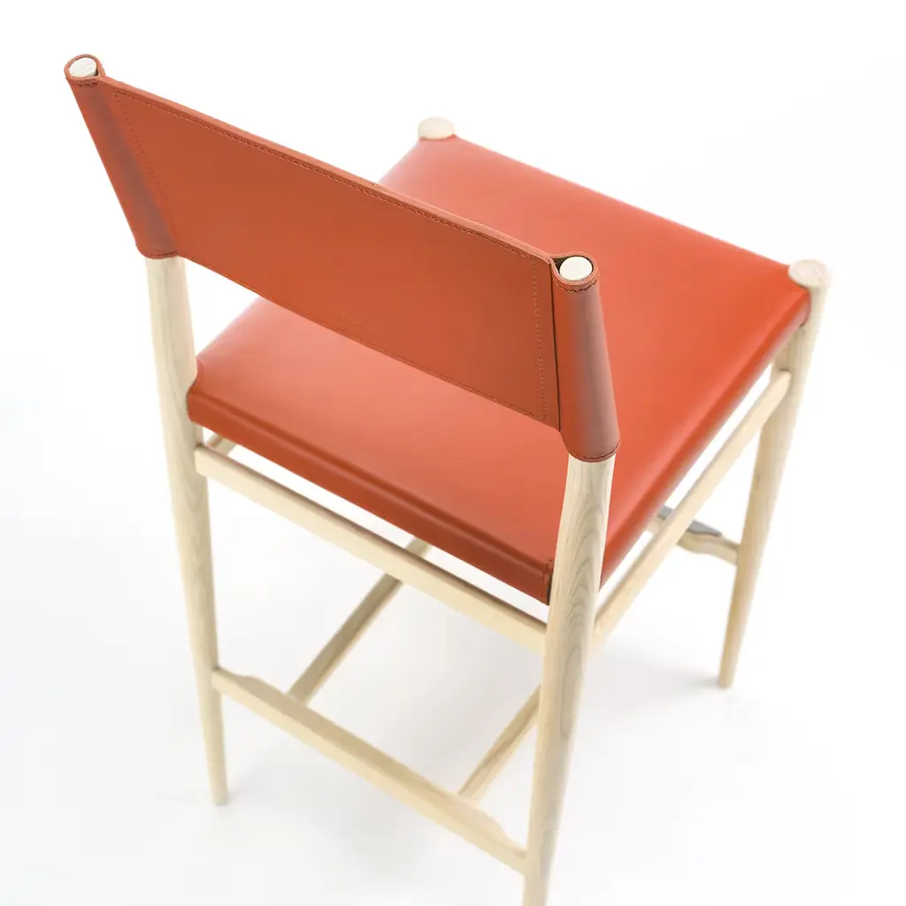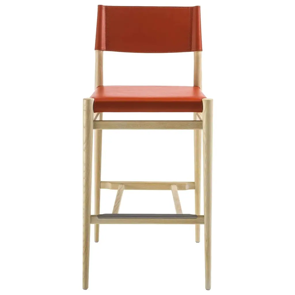 The seat of this bar stool is covered entirely in leather, while its back is composed of a single, leather strap. Its wooden structure features four elongated, tapered wooden legs with a comfortable footrest. In bleached ash wood with orange-colored leather, with a wide selection of alternative colors and finishings available. The price is quoted upon order.