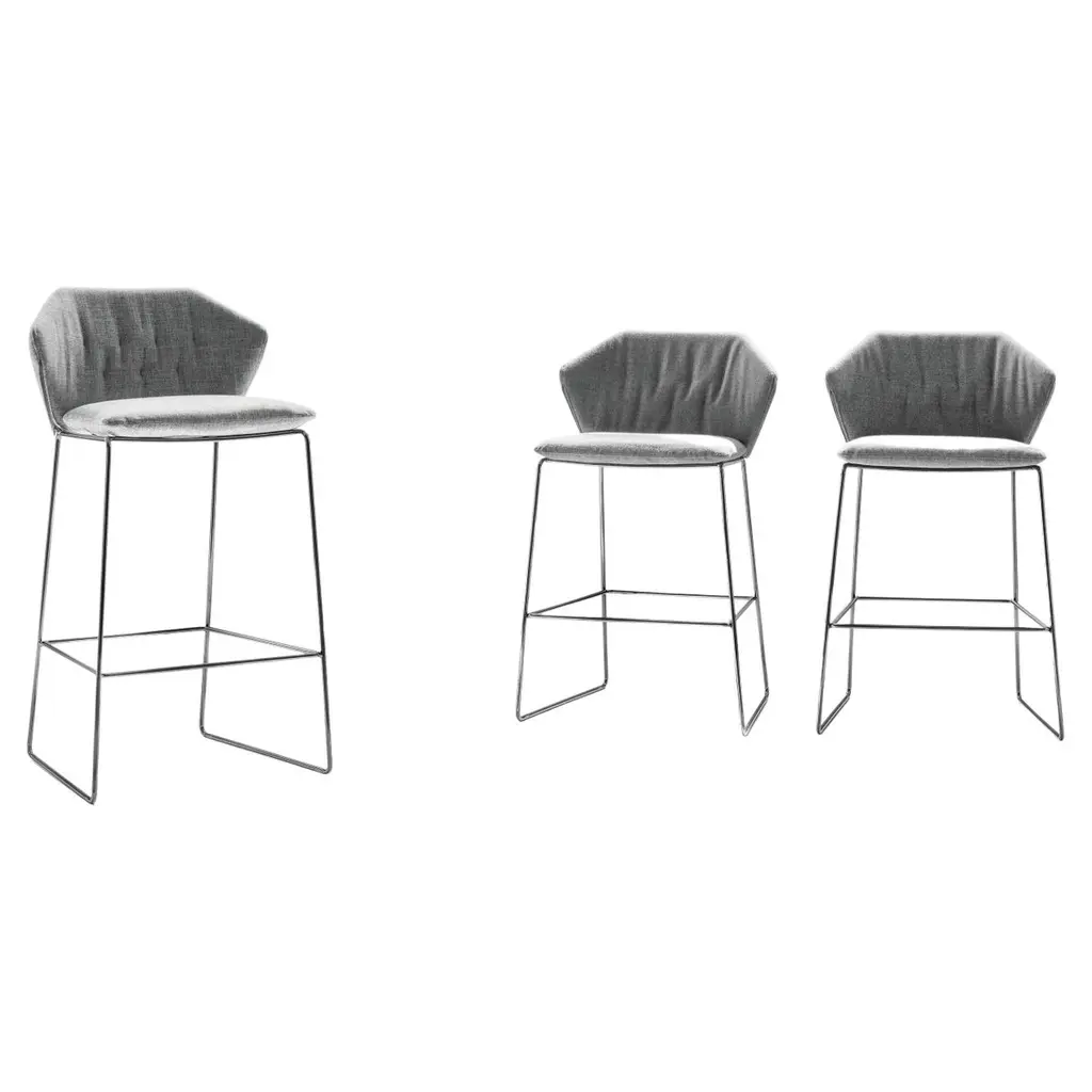 Barstool with upholstered seat and backrest and steel sled base in polished chrome finish. Lineal Comfort is a collection of upholstered chairs, seats, armchairs and barstools. The design is constructed from flexible injected foam with either solid wood, steel or aluminum polished metal bases. It is an ideal addition to any private, public or space. It utilizes the pure forms from the Lineal family of seating with a luxurious, resistant and comfortable materials. It is featured in a wide range of upholsteries and wood finishes, increasing its versatility and ability to integrate into architectural spaces of very different styles and purposes.