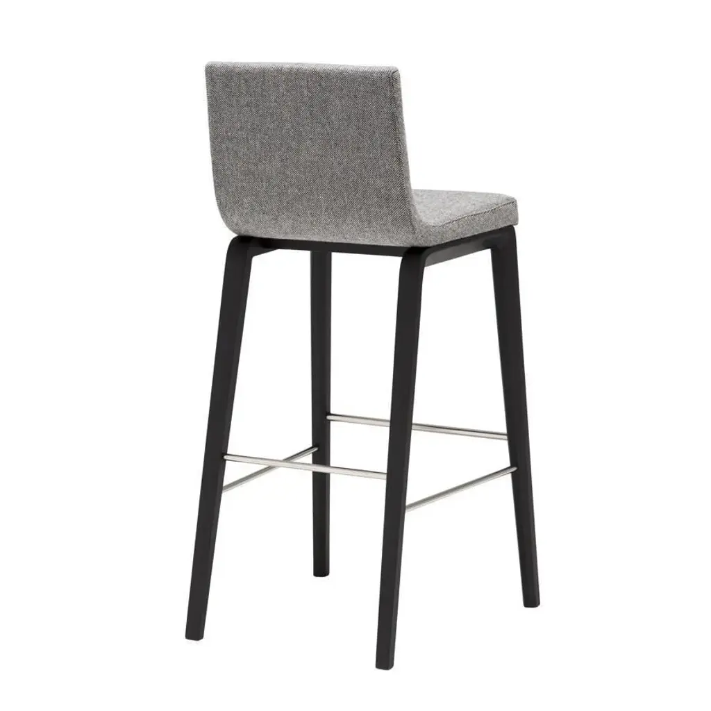 Barstool with upholstered seat and backrest and 4-legged solid beech wood base. Lineal Comfort is a collection of upholstered chairs, seats, armchairs and barstools. The design is constructed from flexible injected foam with either solid wood, steel or aluminum polished metal bases. It is an ideal addition to any private, public or space. It utilizes the pure forms from the Lineal family of seating with a luxurious, resistant and comfortable materials. It is featured in a wide range of upholsteries and wood finishes, increasing its versatility and ability to integrate into architectural spaces of very different styles and purposes.