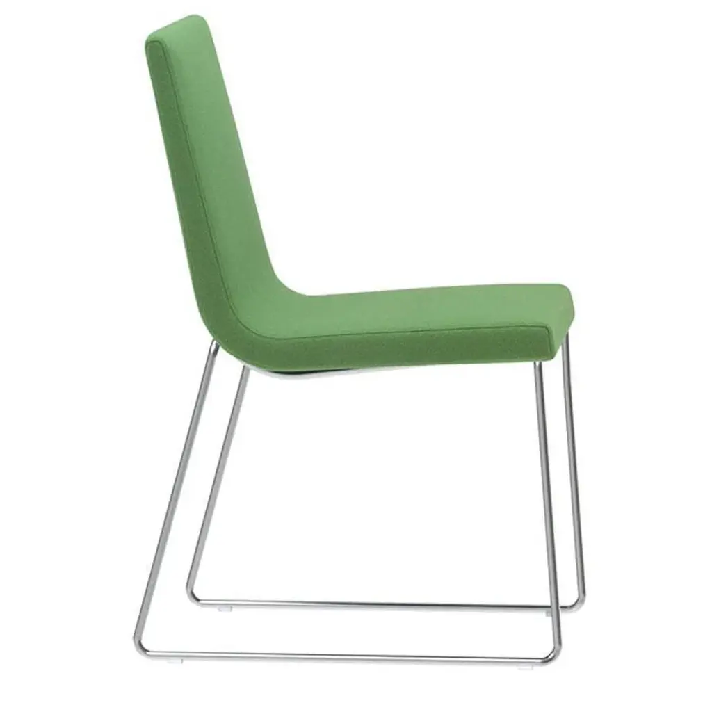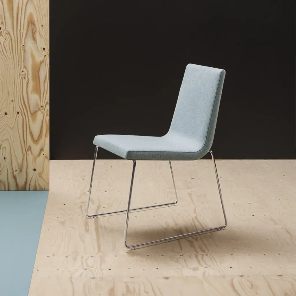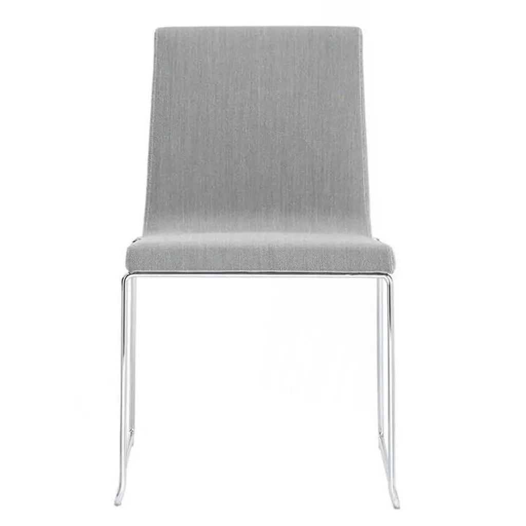 Stackable chair with upholstered seat and backrest and steel sled base in polished chrome finish. Lineal Comfort is a collection of upholstered chairs, seats, armchairs and barstools. The design is constructed from flexible injected foam with either solid wood, steel or aluminum polished metal bases. It is an ideal addition to any private, public or space. It utilizes the pure forms from the Lineal family of seating with a luxurious, resistant and comfortable materials. It is featured in a wide range of upholsteries and wood finishes, increasing its versatility and ability to integrate into architectural spaces of very different styles and purposes.
