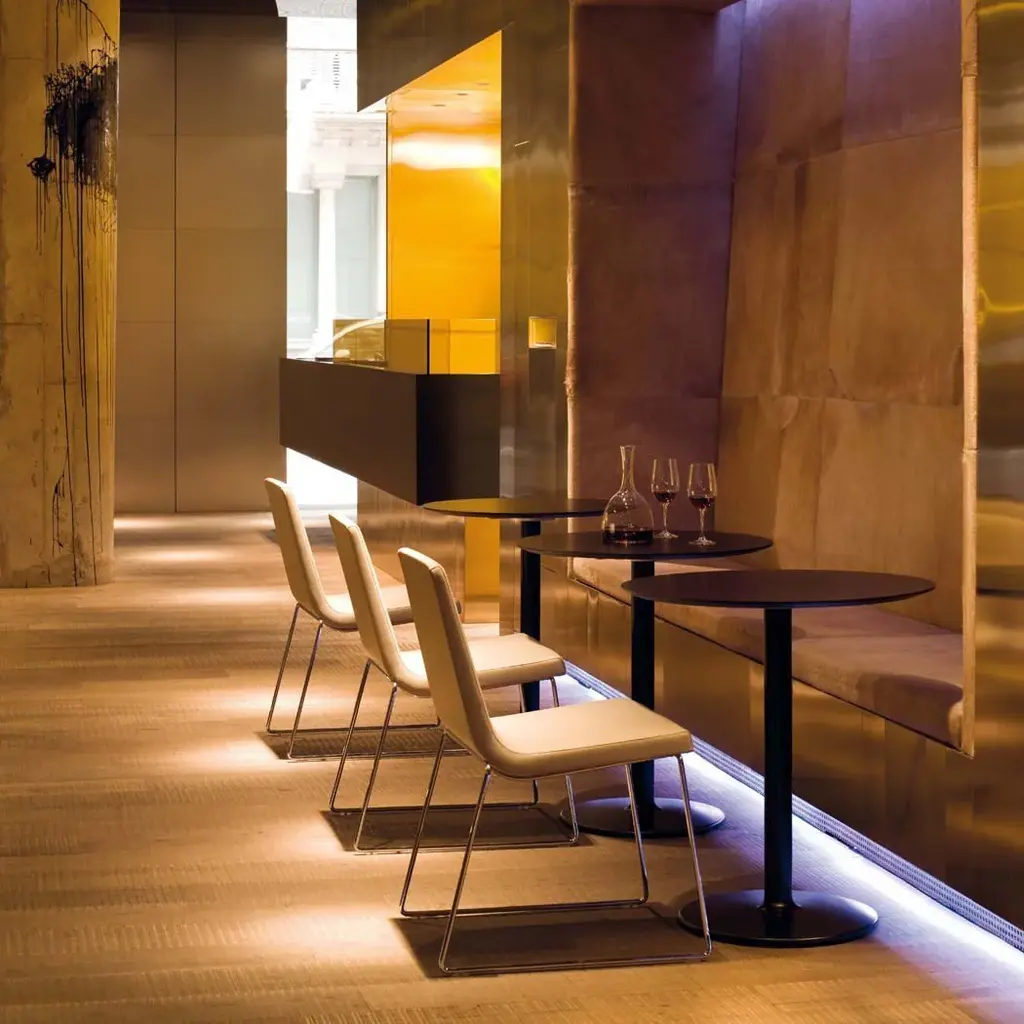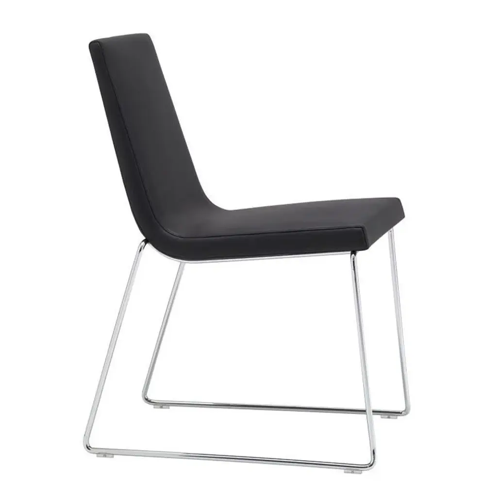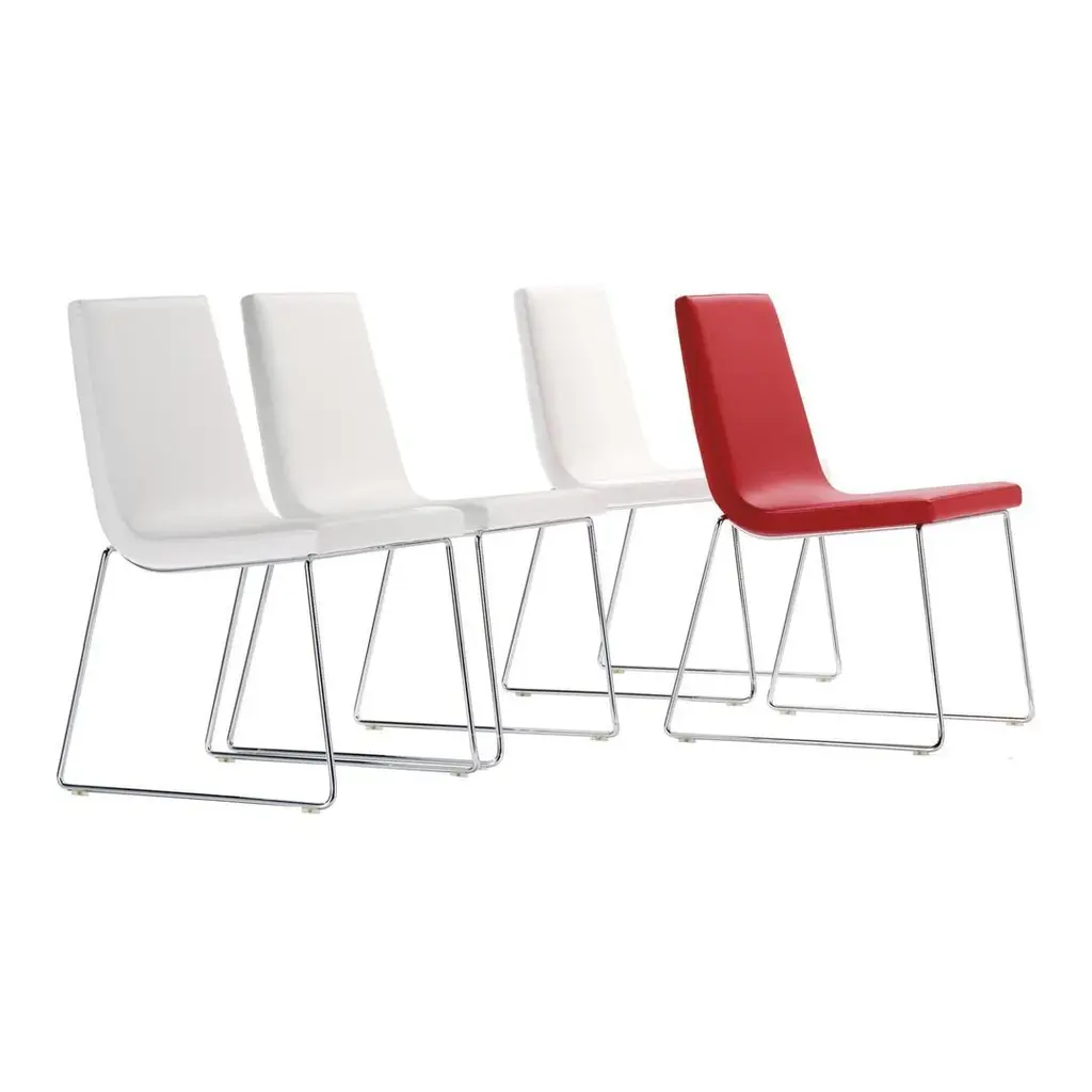 Stackable chair with upholstered seat and backrest and steel sled base in polished chrome finish. Lineal Comfort is a collection of upholstered chairs, seats, armchairs and barstools. The design is constructed from flexible injected foam with either solid wood, steel or aluminum polished metal bases. It is an ideal addition to any private, public or space. It utilizes the pure forms from the Lineal family of seating with a luxurious, resistant and comfortable materials. It is featured in a wide range of upholsteries and wood finishes, increasing its versatility and ability to integrate into architectural spaces of very different styles and purposes.