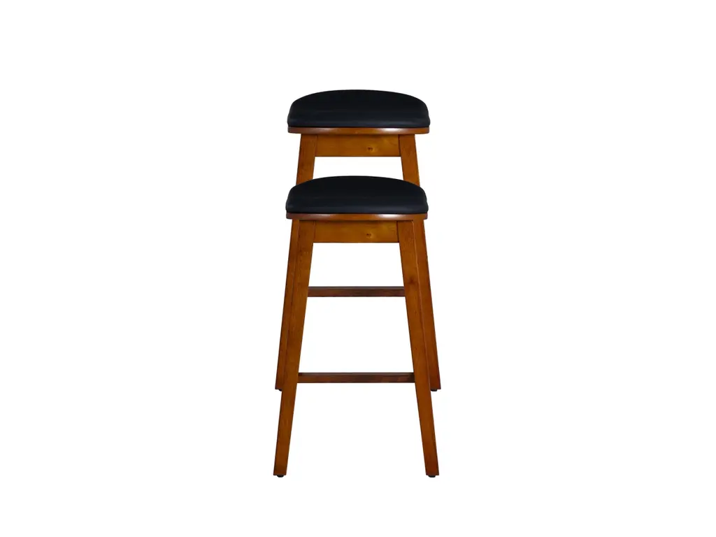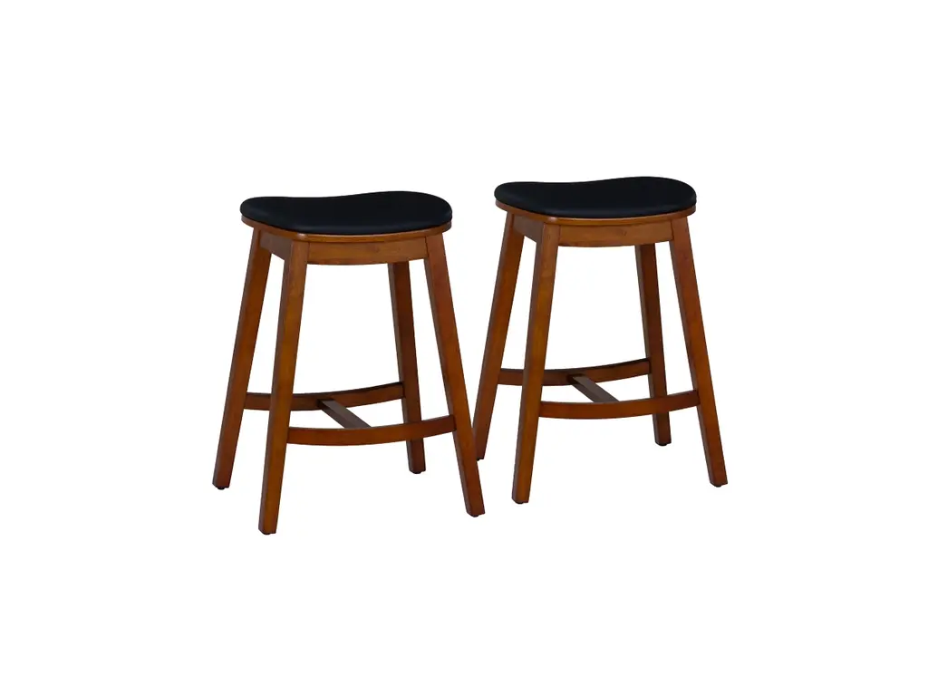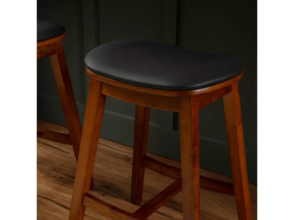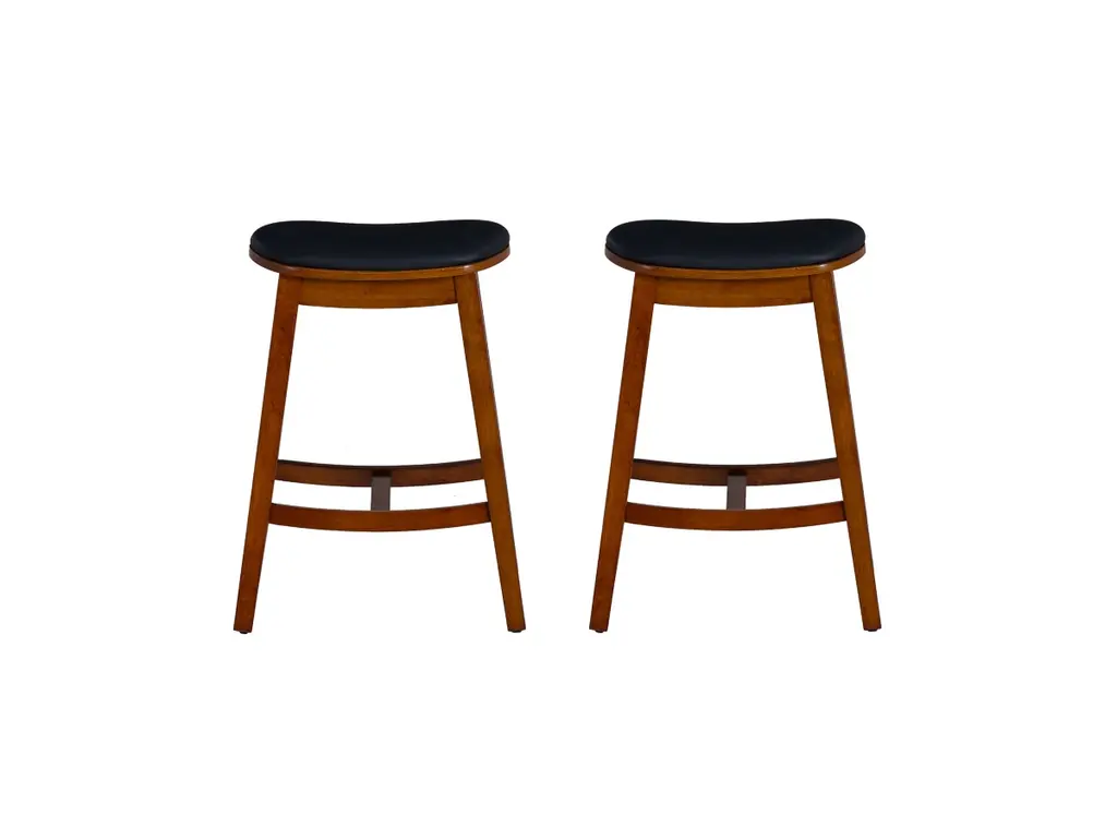 Transform your kitchen or bar area with our two upholstered counter stools boasting a sleek black faux leather upholstered cushion and a complementary brown base. These stools seamlessly blend style and comfort to elevate your dining experience. Sink into the plush upholstered seats for a cozy and inviting feel, while the brown base infuses a hint of rustic charm into your space. With their versatile design, these counter stools are ideal for both casual dining and entertaining guests. Enhance your home decor with these chic and practical stools, designed to bring elegance and functionality to your space.