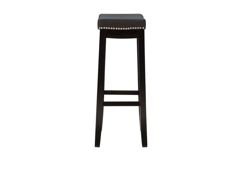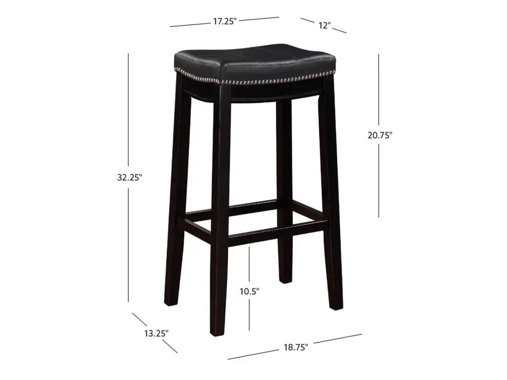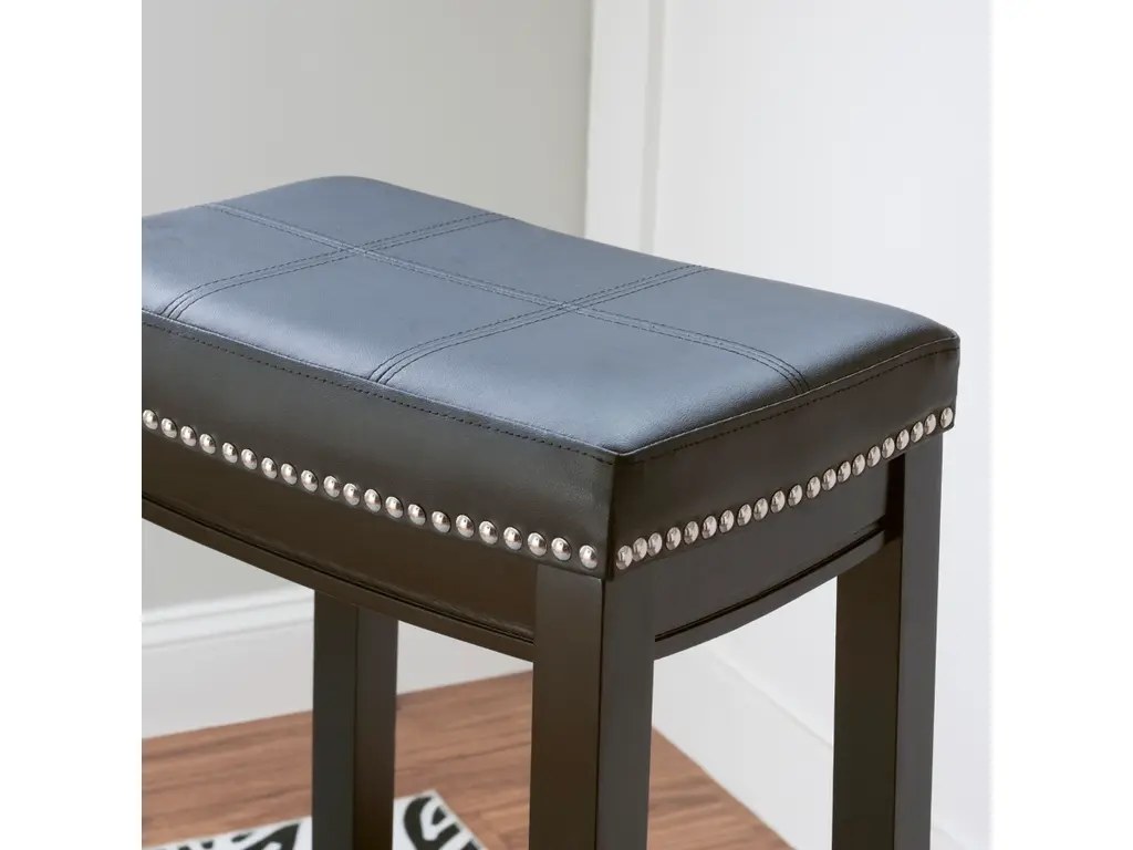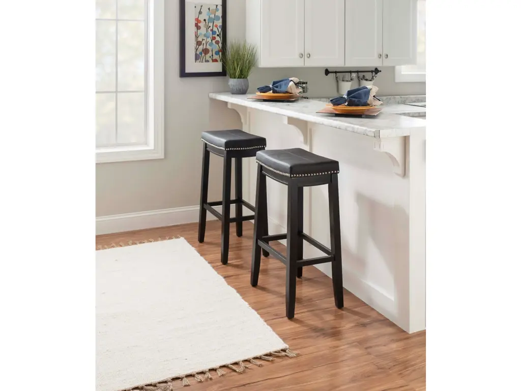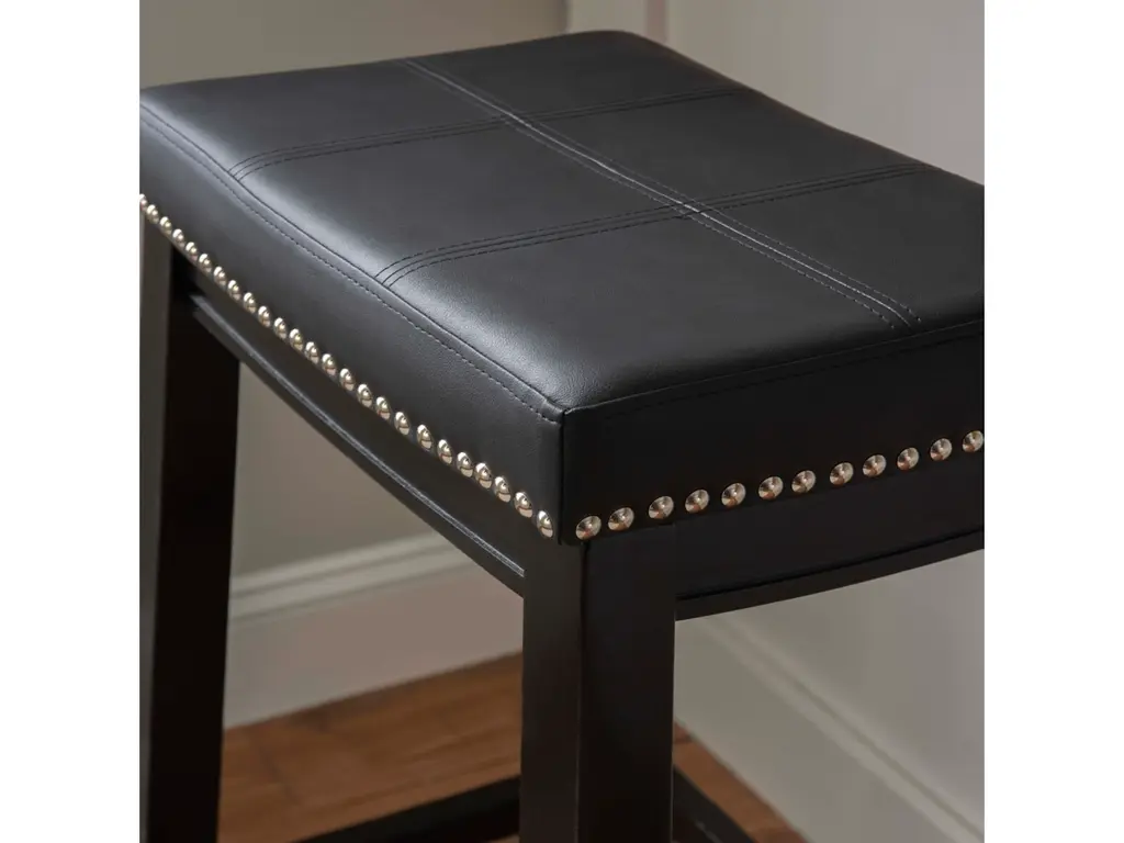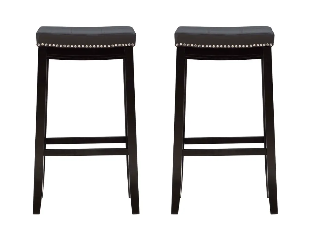 Chic and dressed in understated flourishes, this pair of bar stools are the perfect addition to a boho kitchen or home bar. The solid wood frames are finished in jet black paint and reinforced by footrails for added balance and support. Black faux leather upholstery covers cushioned seats with double needle stitching and silvertone nailhead trim that attracts the eye. With a seat height of 32.25 inches, these stools are perfect for tavern tables, bars or kitchen islands 40 inches to 43 inches high.