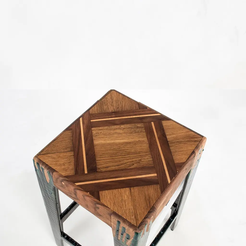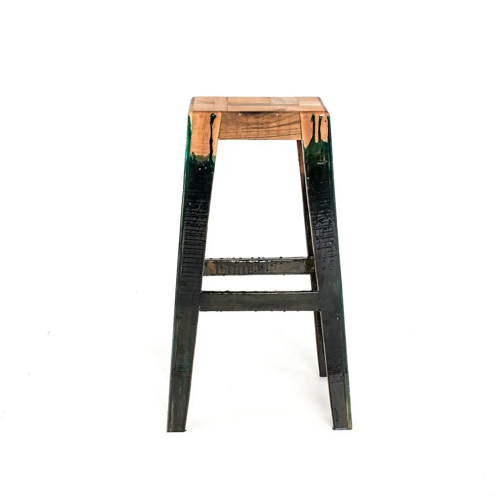 The bar stool is made of an antique piece of walnut wood floorboard, handcrafted Elmwood, and Plexiglass. The footrest heights are all different to accommodate all ages and heights. Materials: Walnut, Alder and Oak, Acrylic, Brass and Resin.