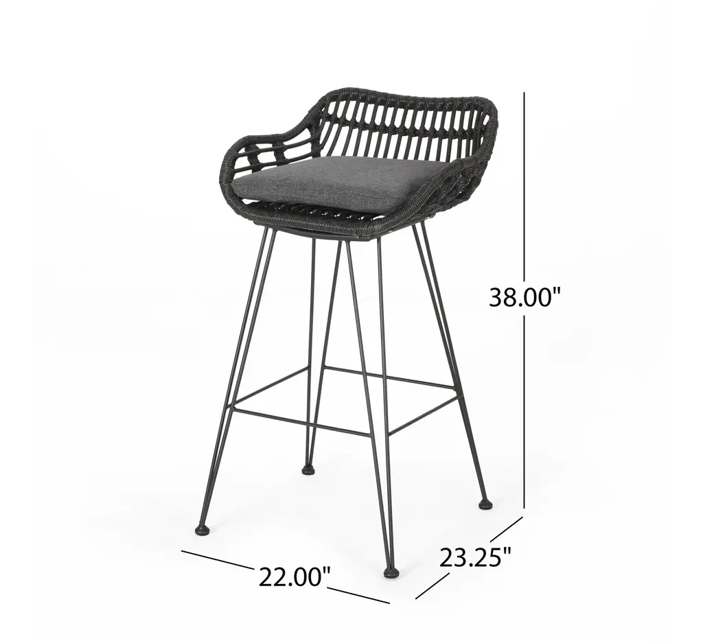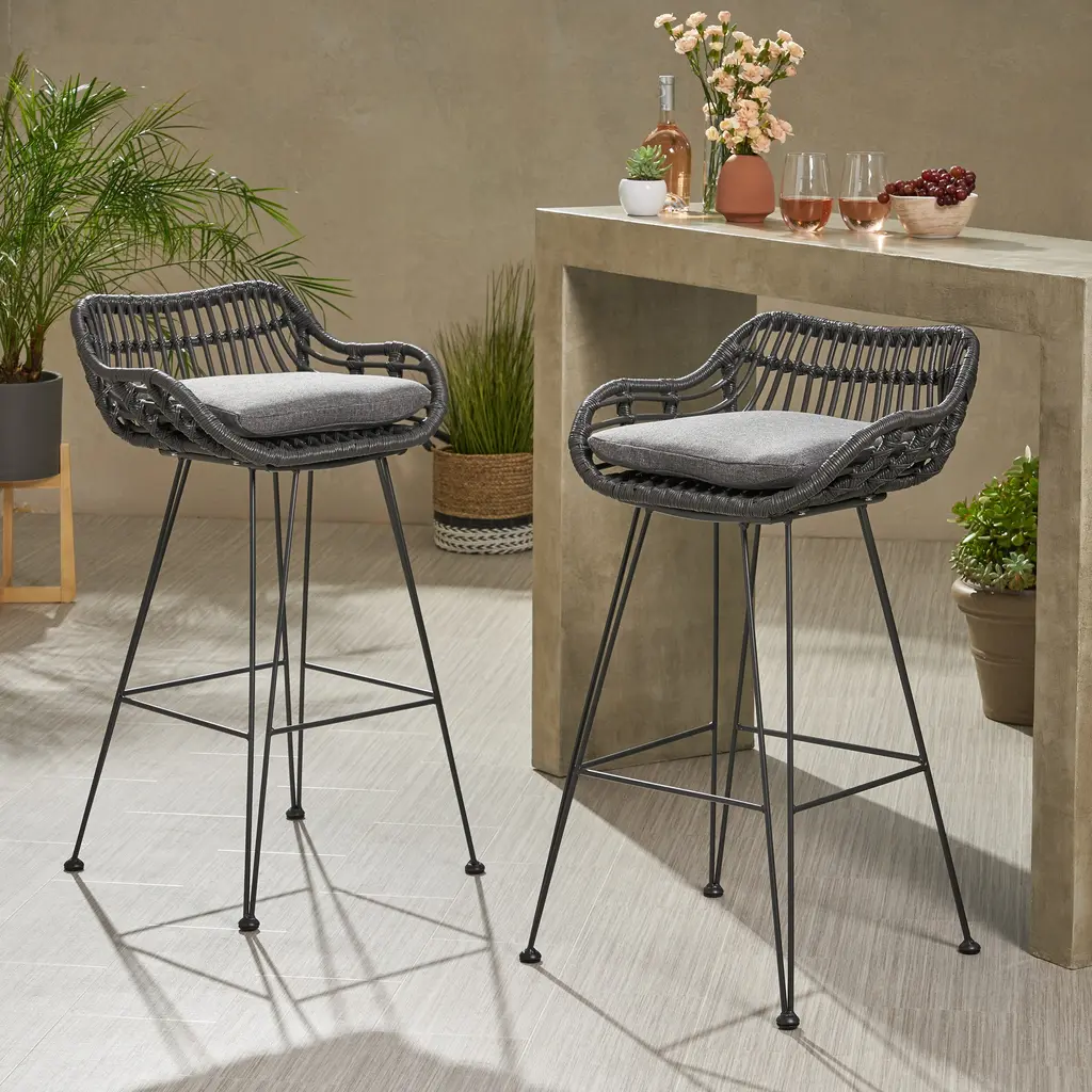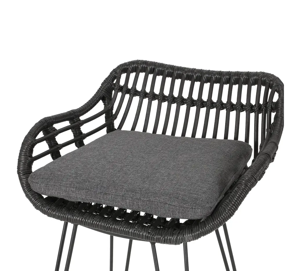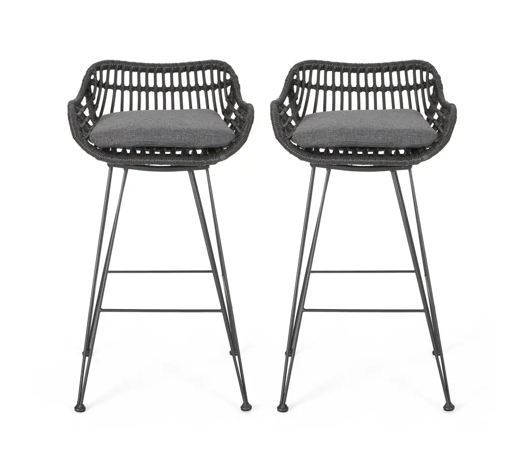 Give your outdoor space an exclusive feel with a sensible and stylish bar stool set. Featuring a delightful hand-wrapped look, our bar stool set provides a timeless style to your home while providing ultimate comfort. This set of stools consists of a metal frame and rattan material, bringing a modern twist to a classic look that is ideal for any style of decor. With a thin angled frame, this charming bar stool set also provides a minimalistic yet durable structure that offers a stylish flair to your space.MODERN: With clean lines contrasted perfectly by its round edges, our rattan bar stool is the ideal modern accessory for your outdoor space. Finished with thin angled legs, this stool not only has a sleek, minimalistic look but also provides a stable structure.POLYETHYLENE RATTAN: Featuring a long-lasting woven seat, this style is not only incredibly durable but also provides a versatile appearance. The handcrafted details of this material allow this piece to blend seamlessly with your outdoor decor.WATER-RESISTANT CUSHIONS: Our cushions are covered with a non-porous material that makes cleaning any spill a breeze. Please note that these cushions are water-resistant and not waterproof. Please do not submerge in water.BARSTOOL HEIGHT: This stool has a seat height of 28.75 inches, making this perfect for a backyard bar or a bistro bar set.ASSEMBLY REQUIRED: Some assembly is required for this set. All of the instructions and tools needed for assembly are included. This comes as a set of two.Includes: Two (2) BarstoolsMaterial: Faux RattanFrame Material: IronCushion Material: Water Resistant FabricCushion Composition: 100% PolyesterFinish: GrayFrame Finish: BlackCushion Color: Dark GrayHand-Crafted DetailsAssembly RequiredDimensions: 23.25 inches deep x 22.00 inches wide x 38.00 inches highSeat Dimensions: 15.50 inches deep x 16.00 inches wide x 30.00 inches highFootrail Height: 12.00 inches
